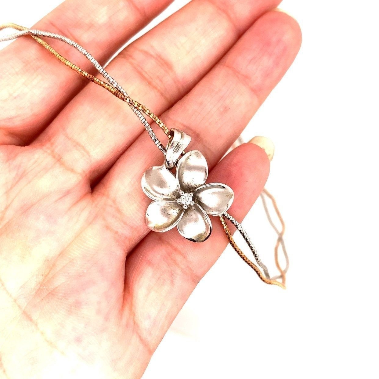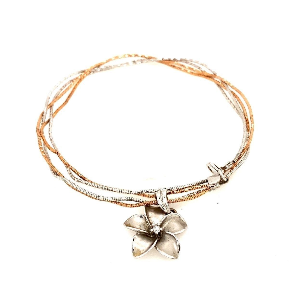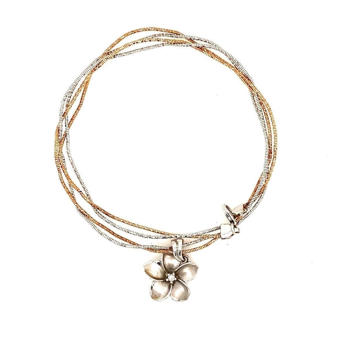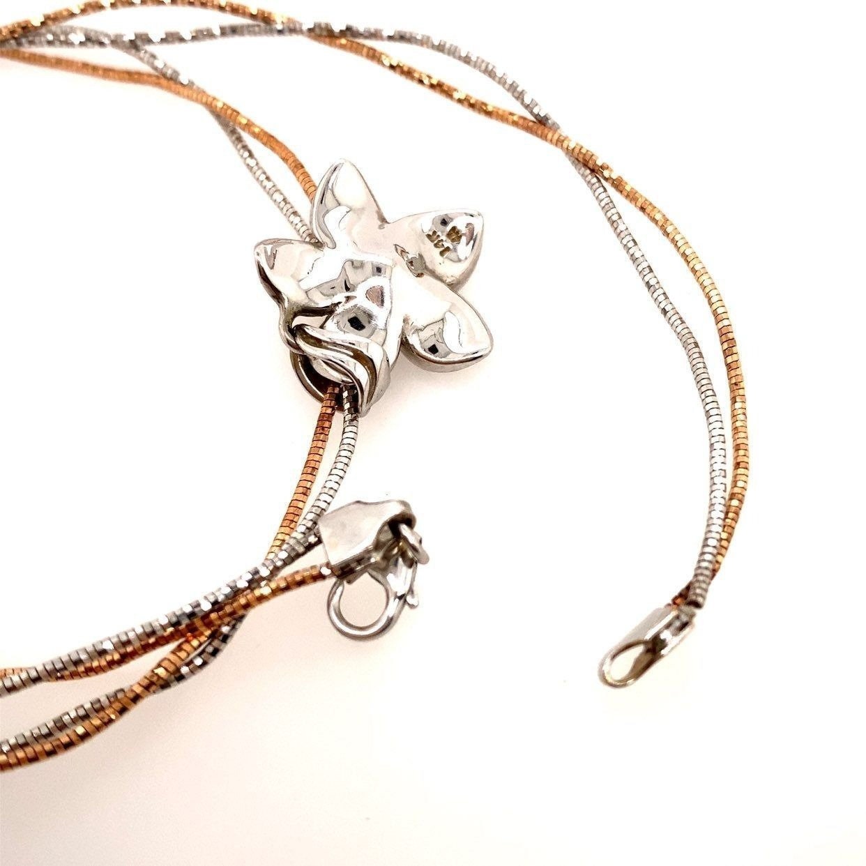Real 14k Rose and White Gold 2-Strand Necklace with 14k White Gold Diamond Plumeria Pendant, NOT GOLD PLATED OR GOLD FILLED.
