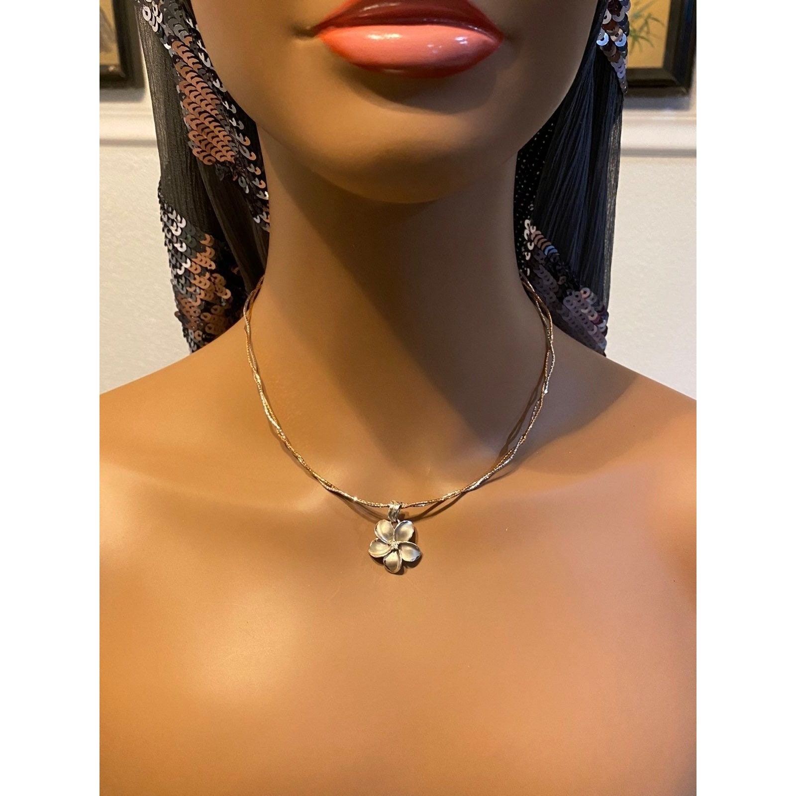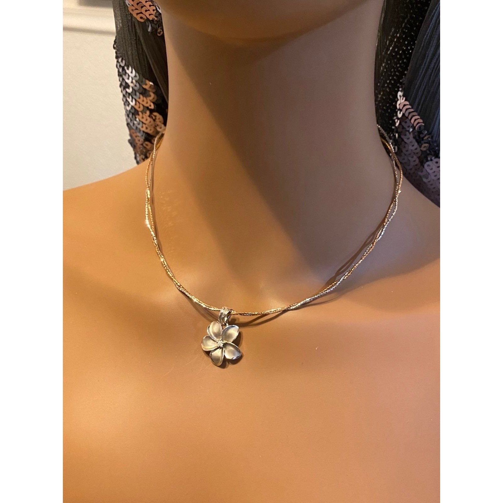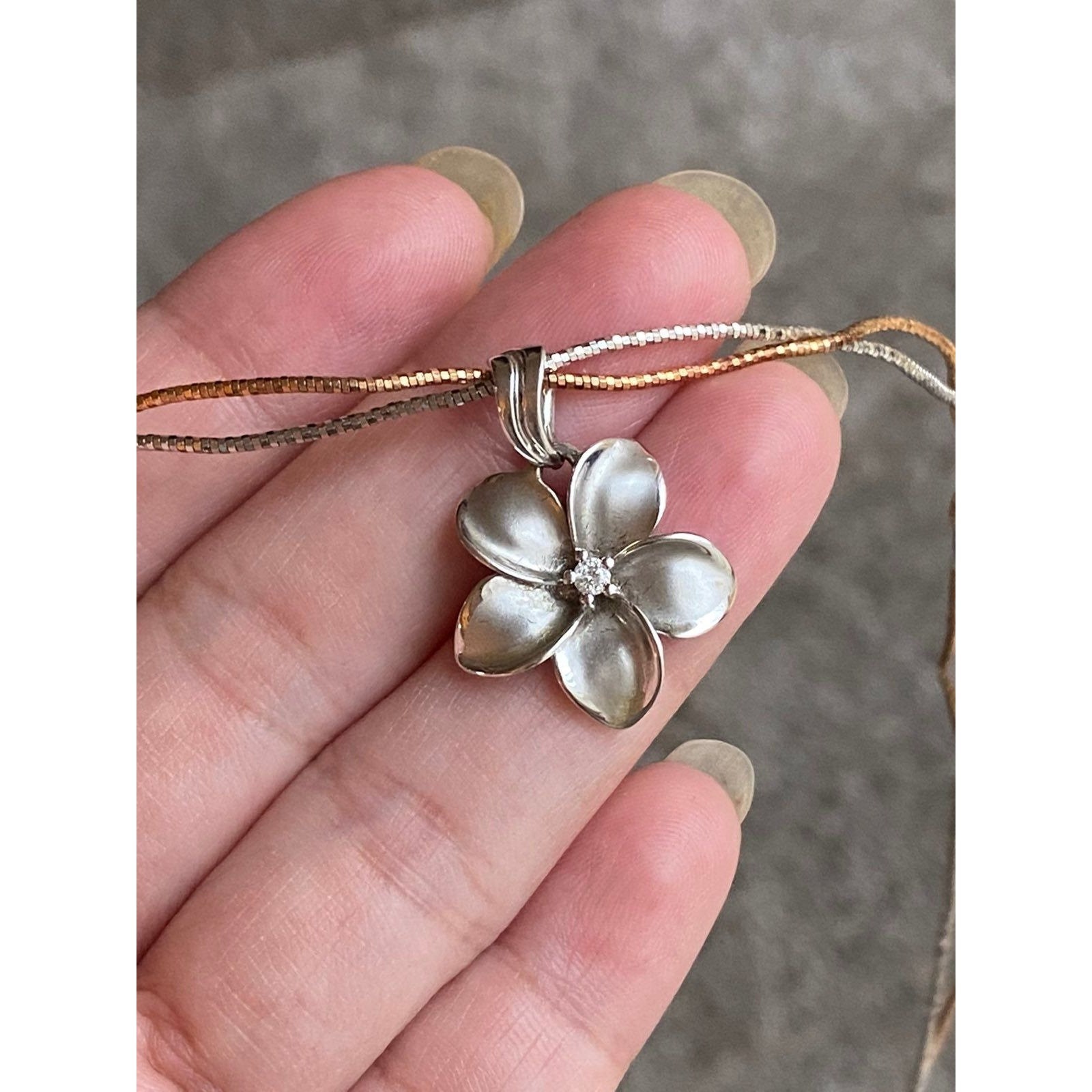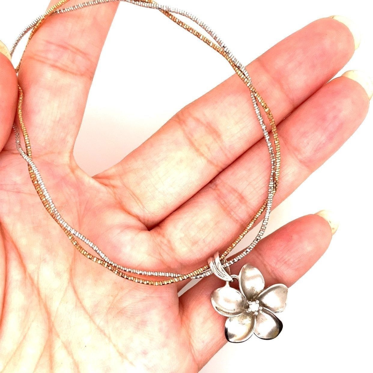 Real 14k Rose and White Gold 2-Strand Necklace with 14k White Gold Diamond Plumeria Pendant, NOT GOLD PLATED OR GOLD FILLED.