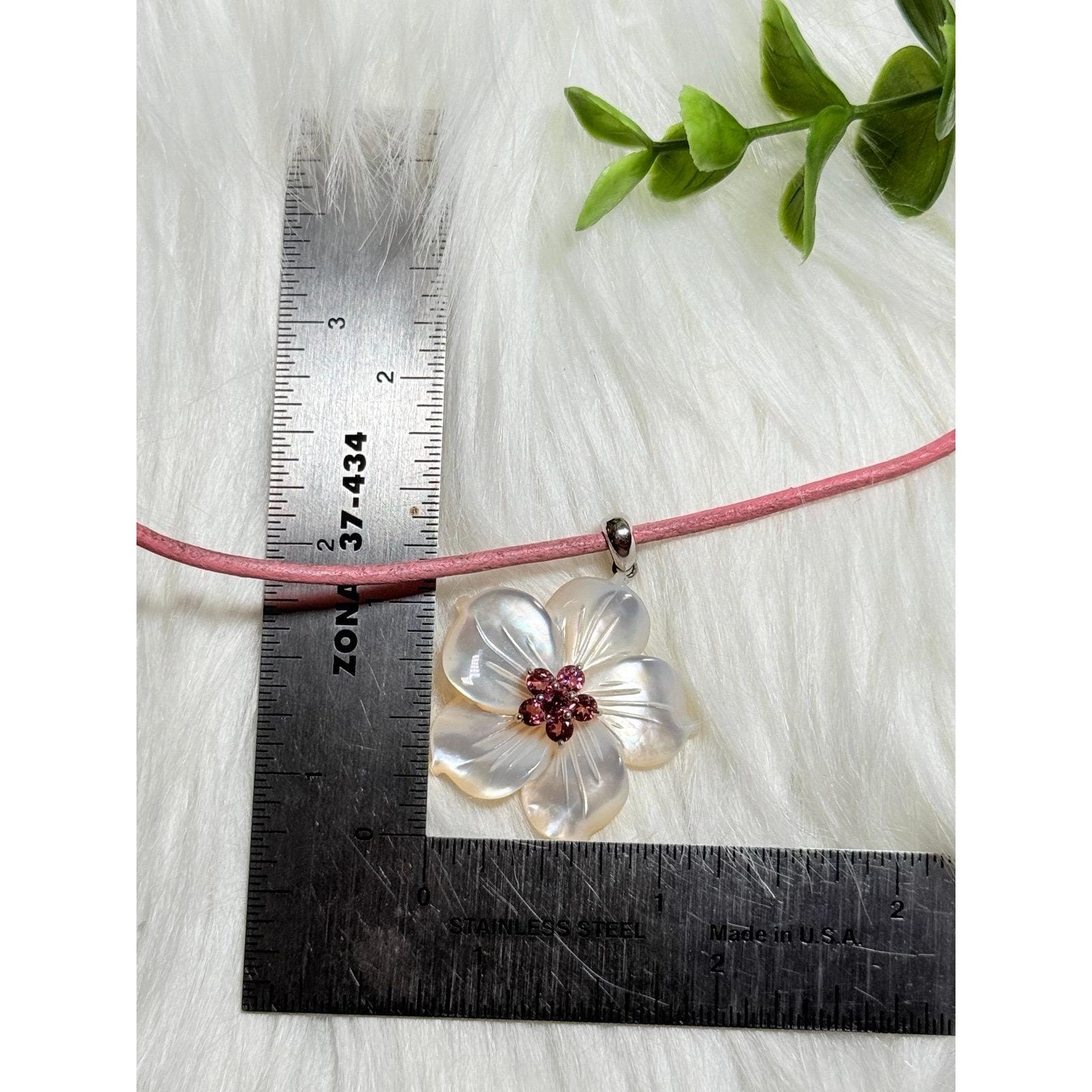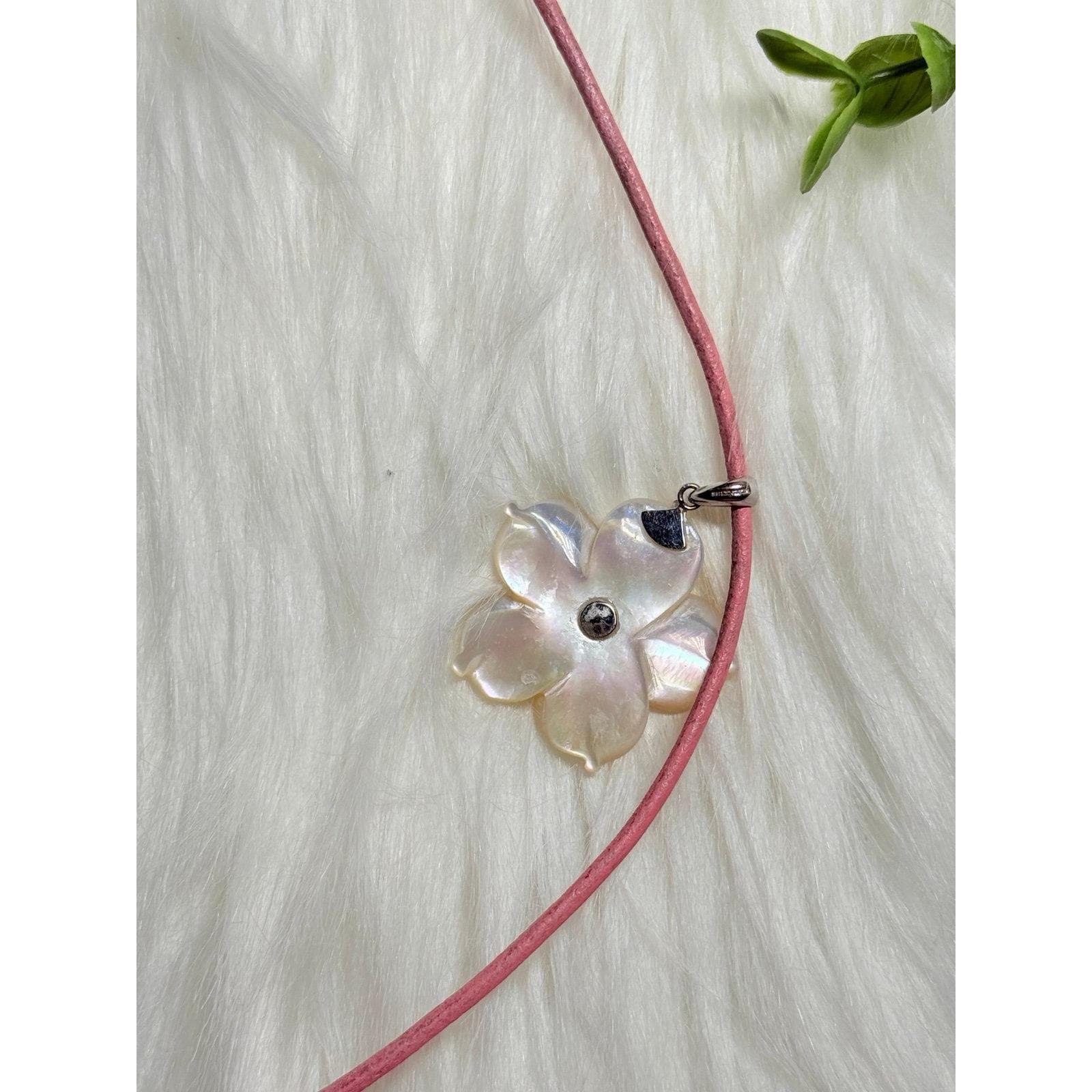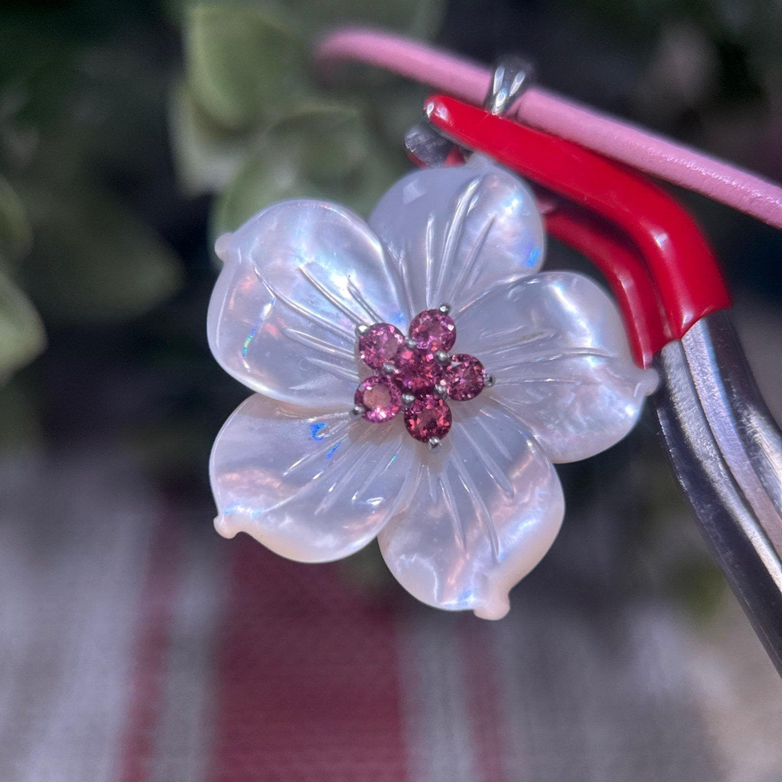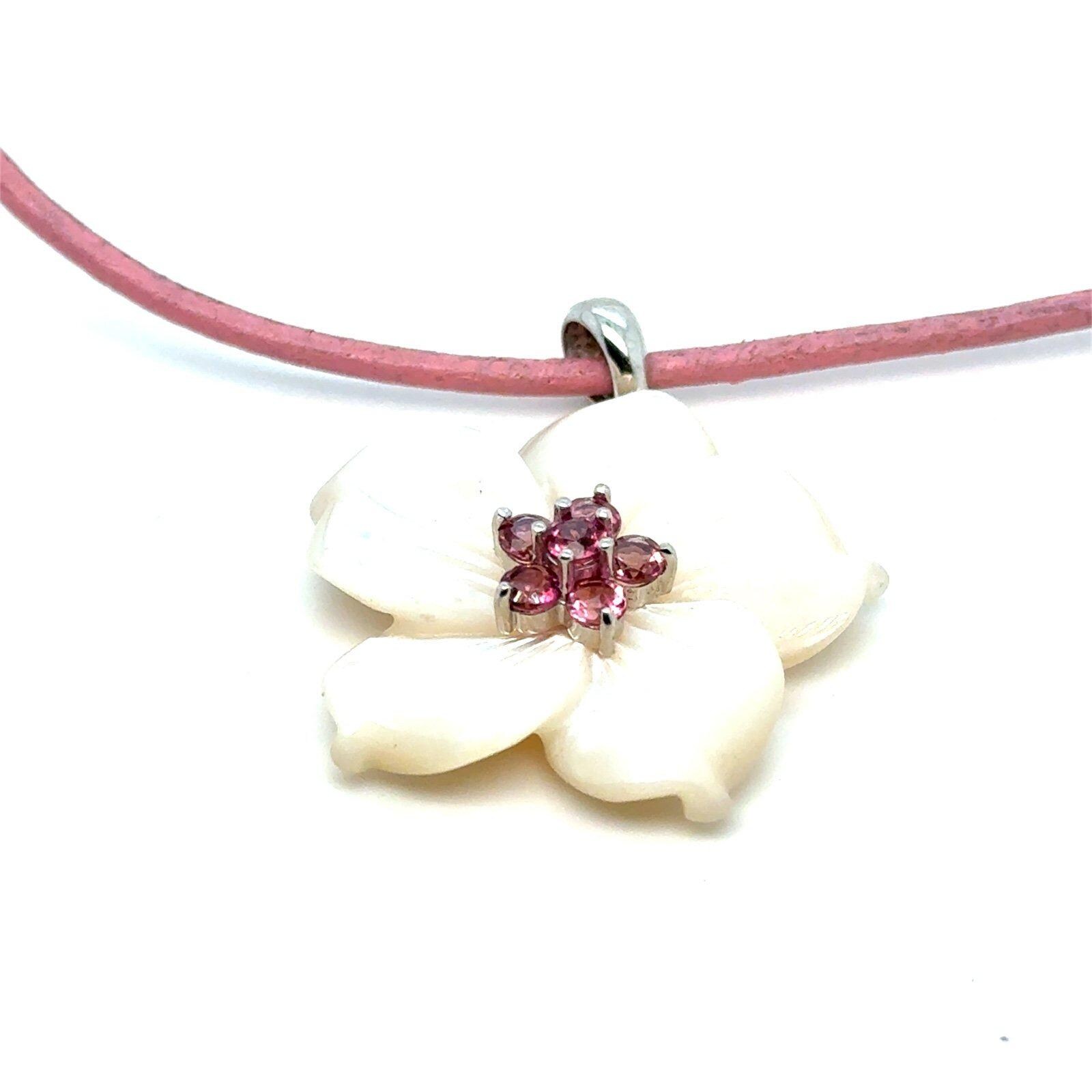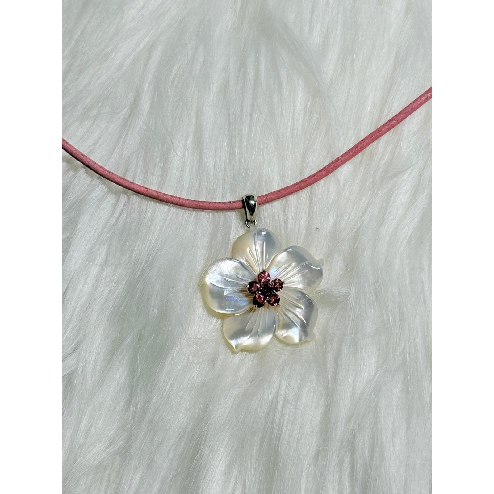 14K White Gold Pink Cord Mother of Pearl/Rubies Necklace