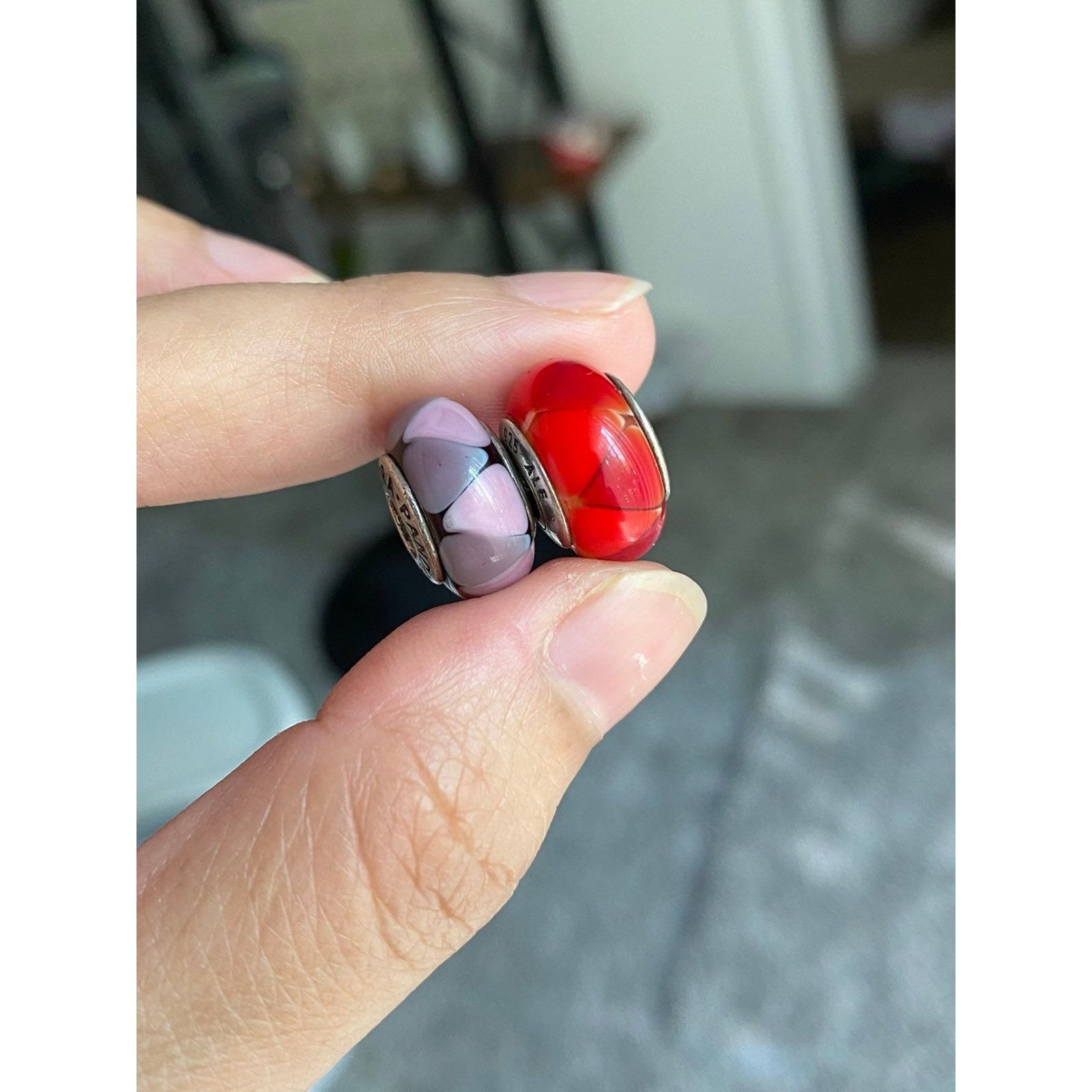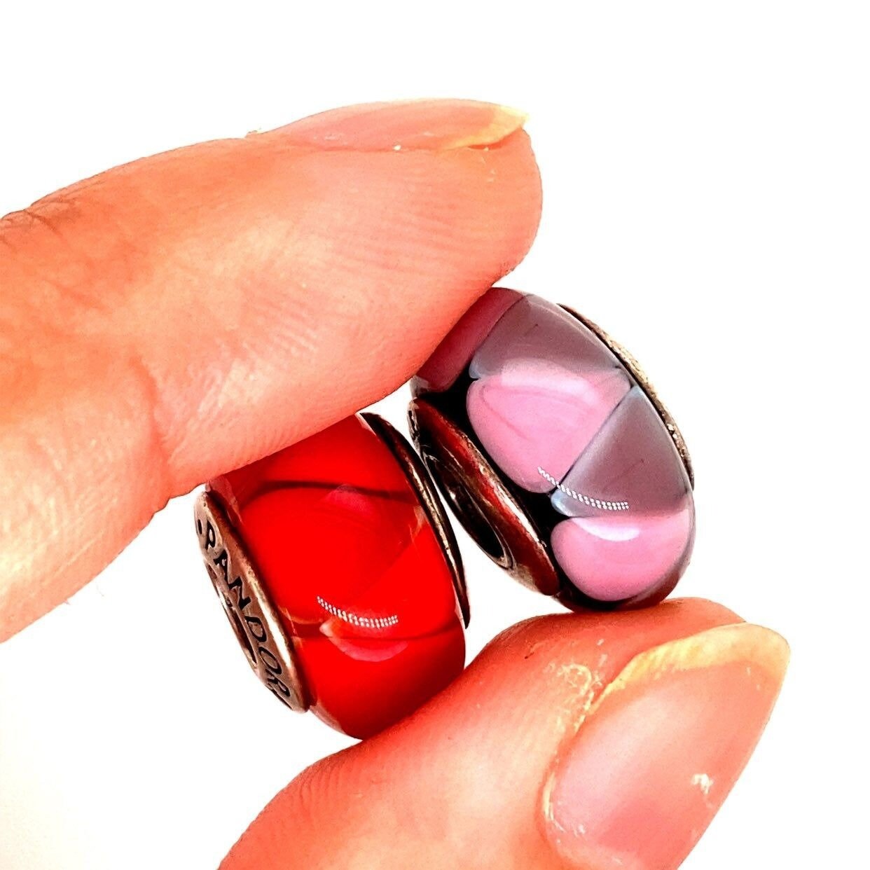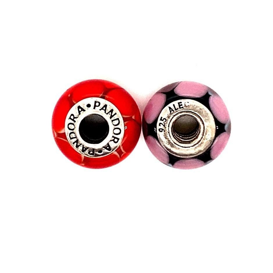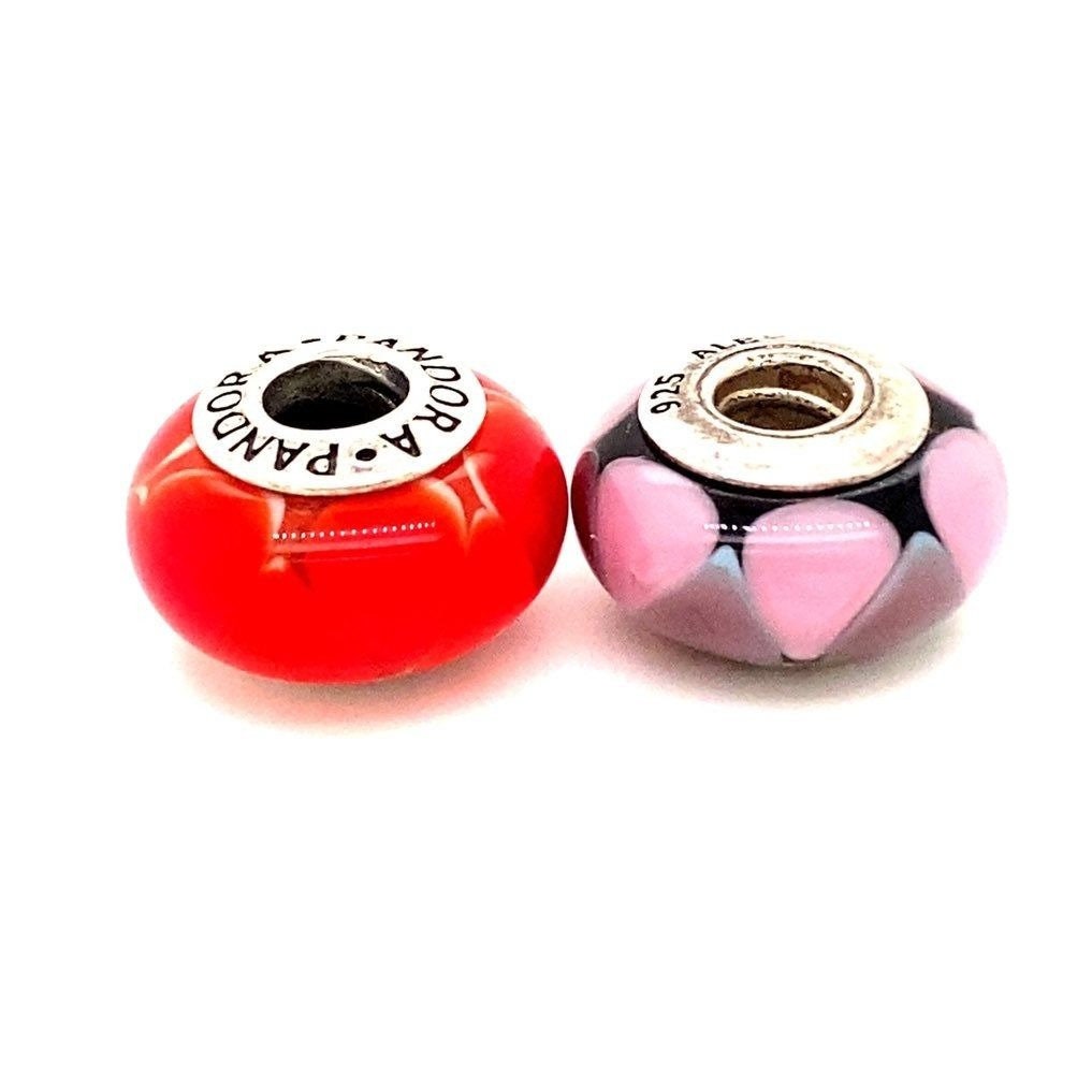2 Authentic Pandora Purple and Red Orange Murano Charms. No original packaging.