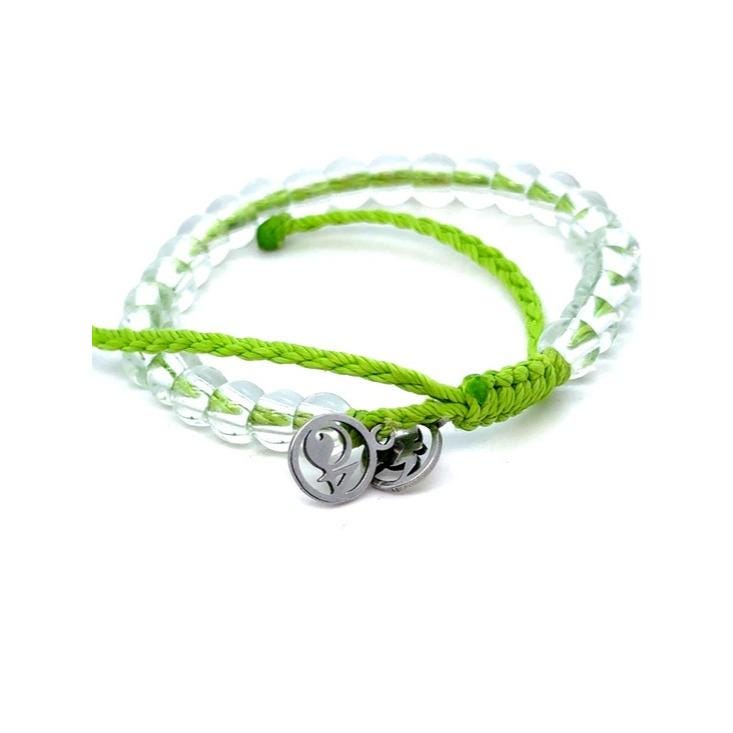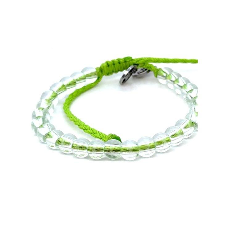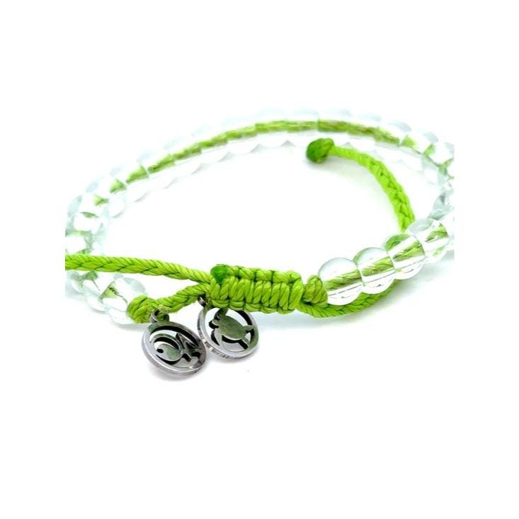 Delicate 4Ocean sea turtle clear glass beads strung on a vibrant lime green cord. Lightweight and comfortable for everyday wear. Stylish, minimalist design that layers well with other bracelets. Features a small silver-tone accent charm for added detail.