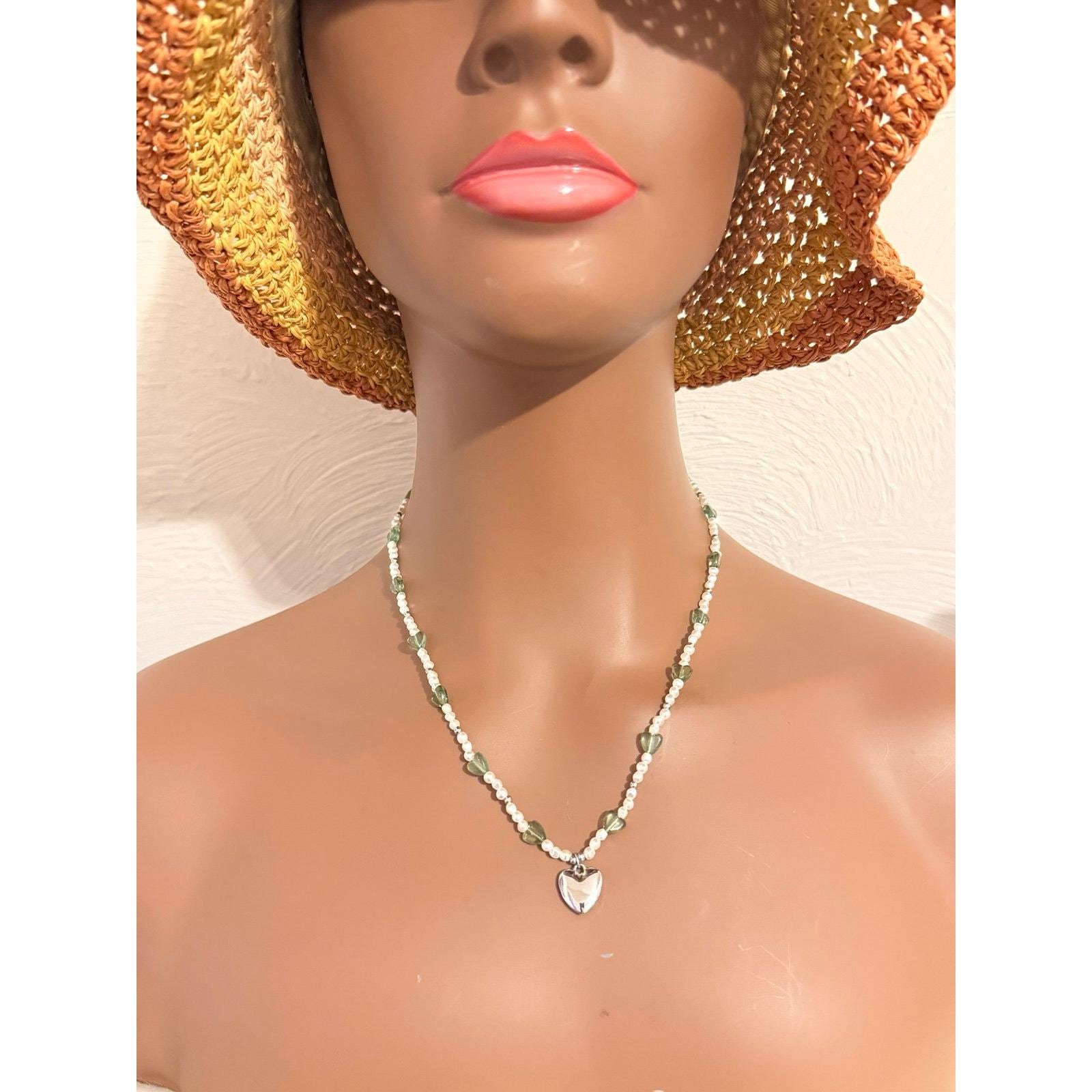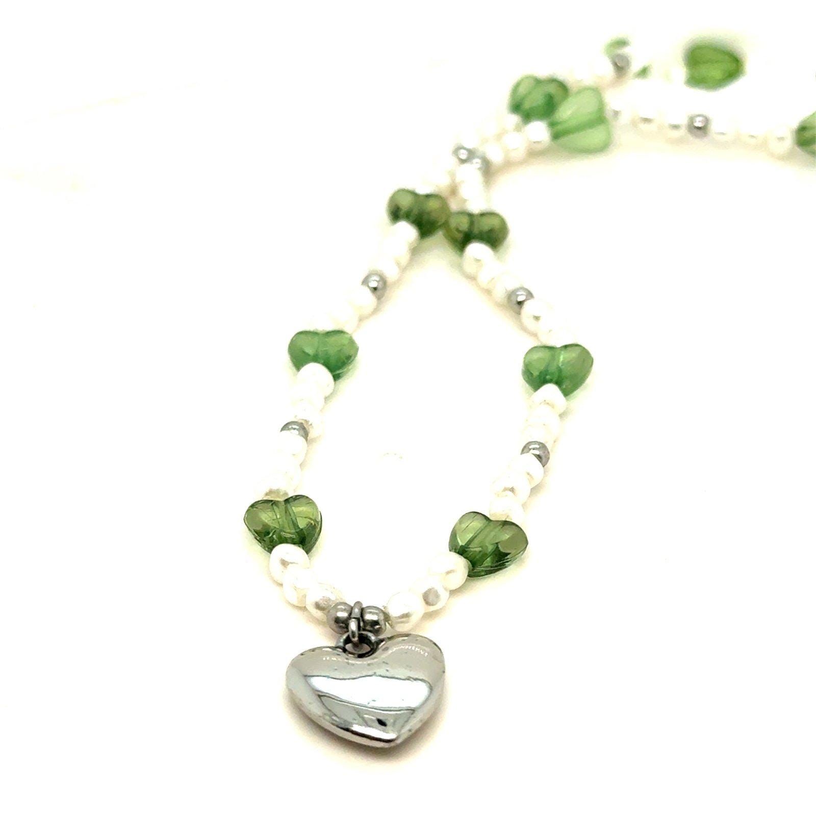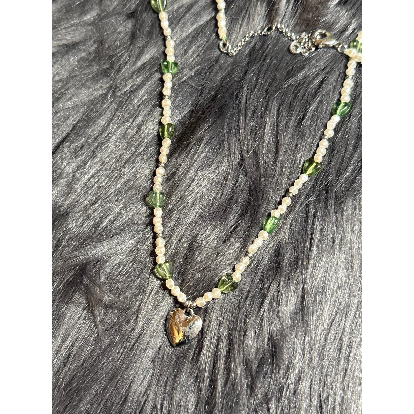 *Station Green Heart with Faux Pearls and Silver Tone Heart Necklace