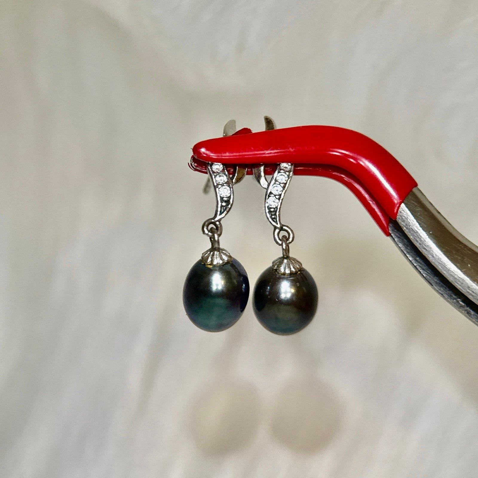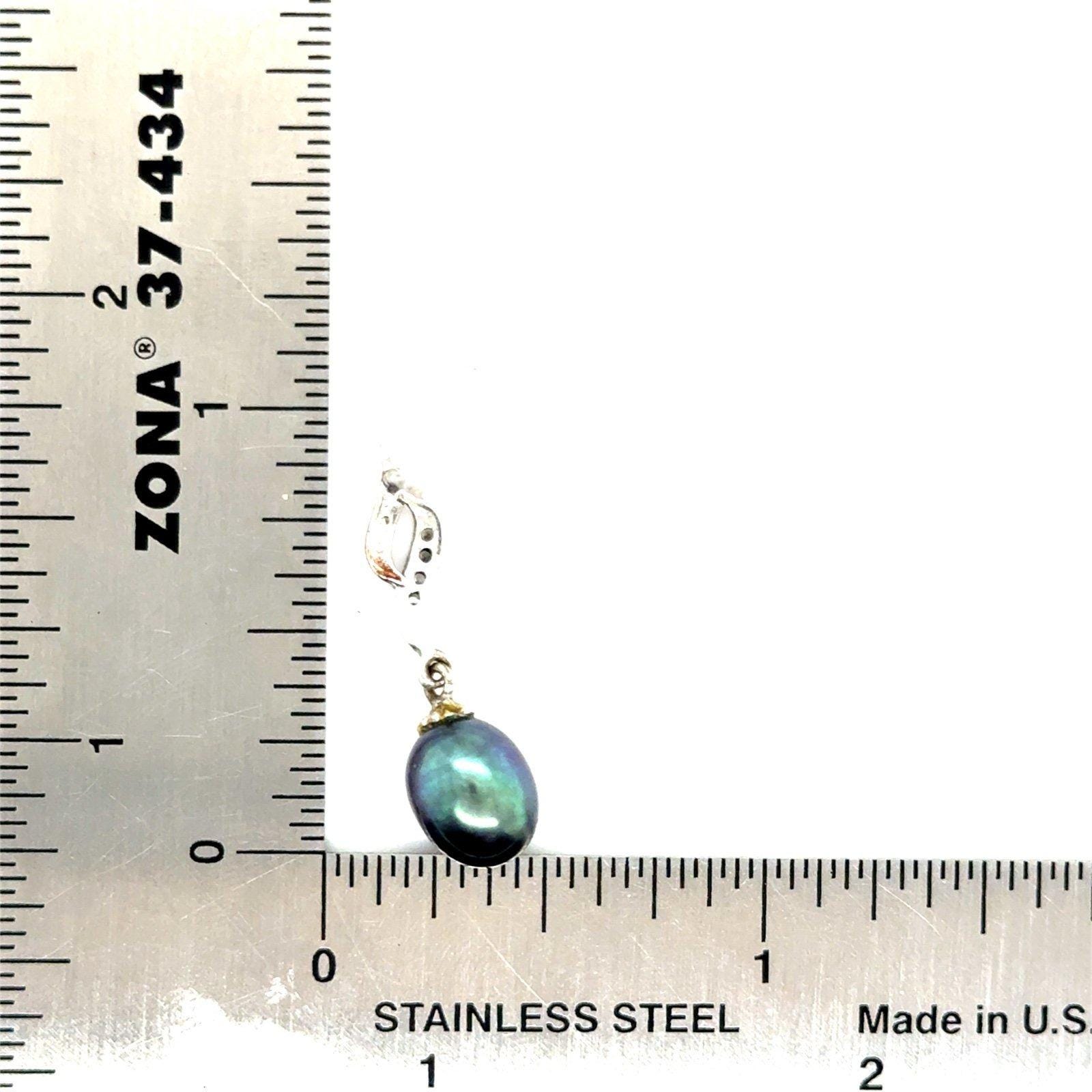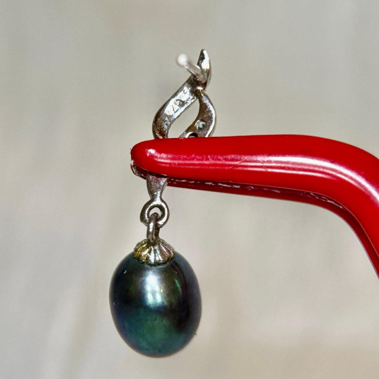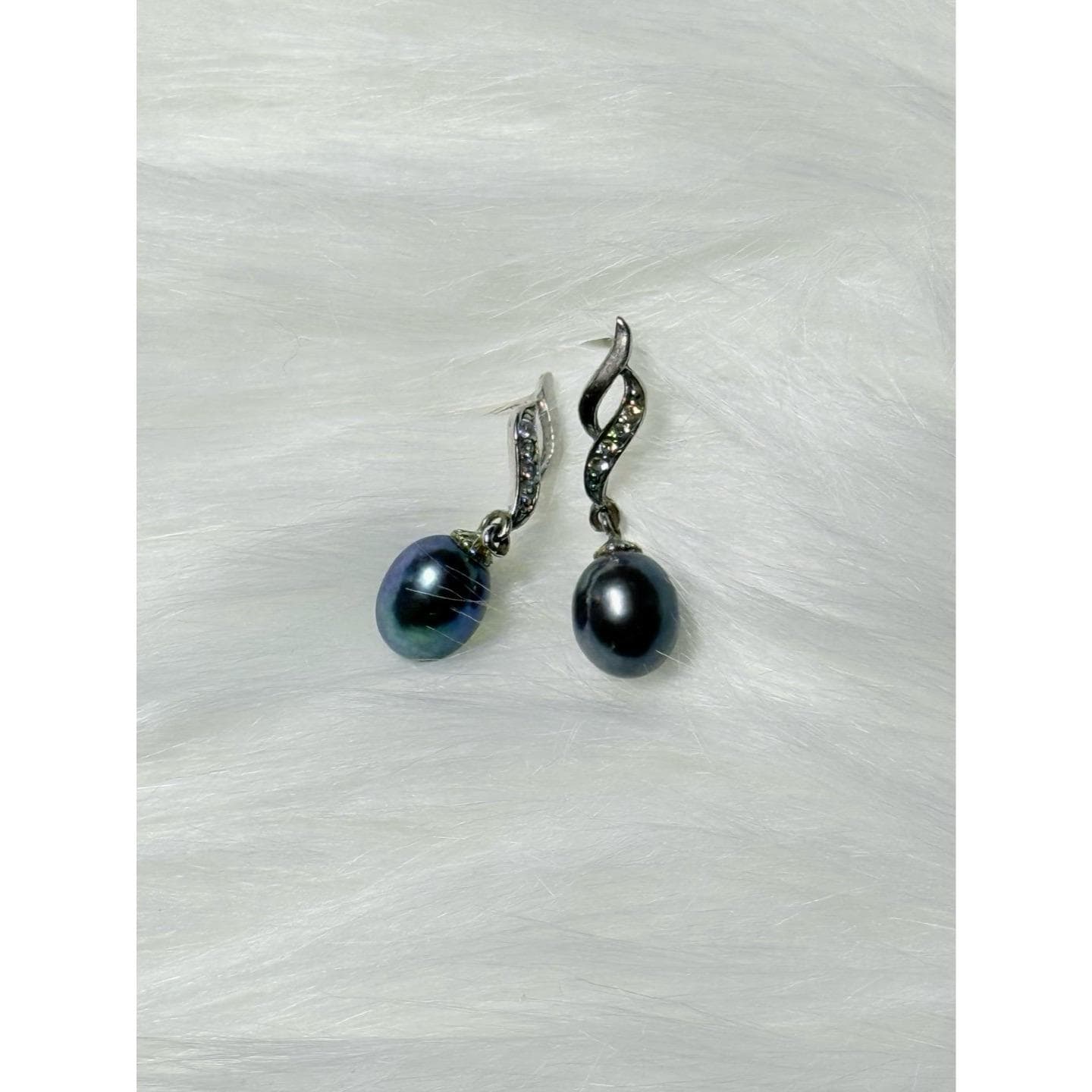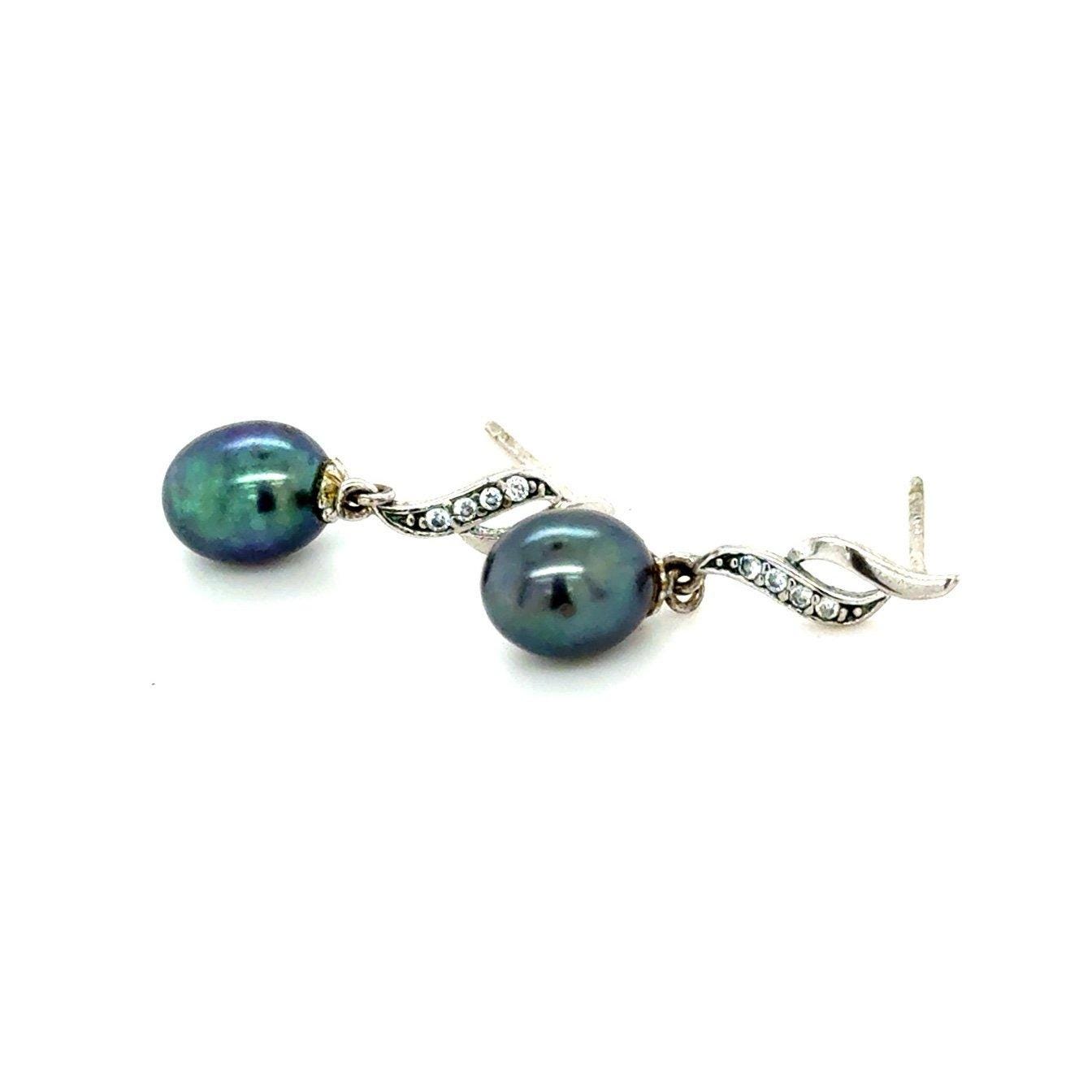 Sterling Silver 925 Black Pearl/Cz Drop Earrings .