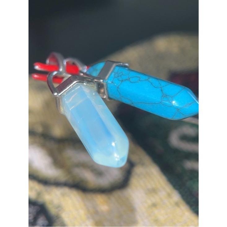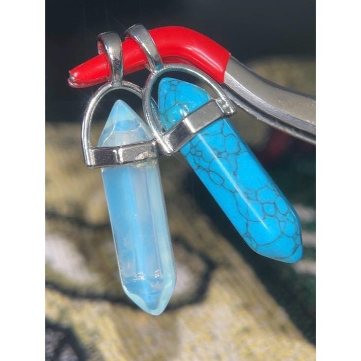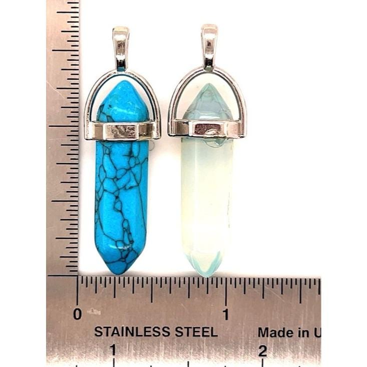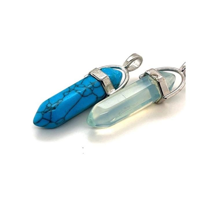 Elegant dual pendant set featuring a vibrant blue turquoise point and a soft opalite point. Designed with silver-toned caps for easy styling. Perfect for layering or wearing alone for a subtle, polished look. Includes blue and opalescent color options.