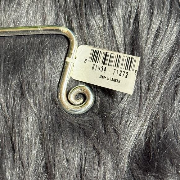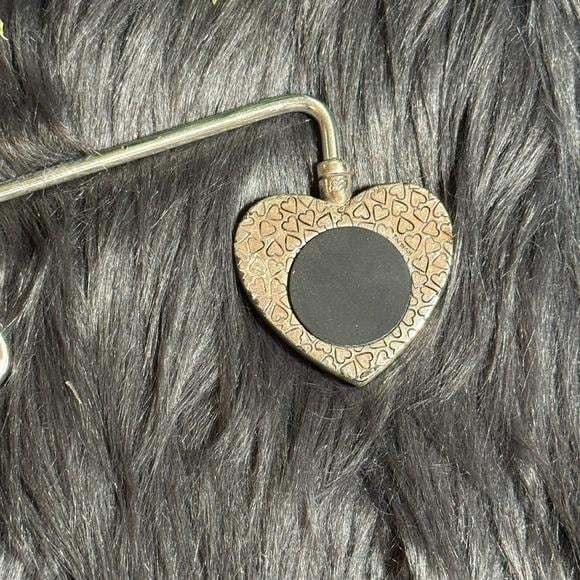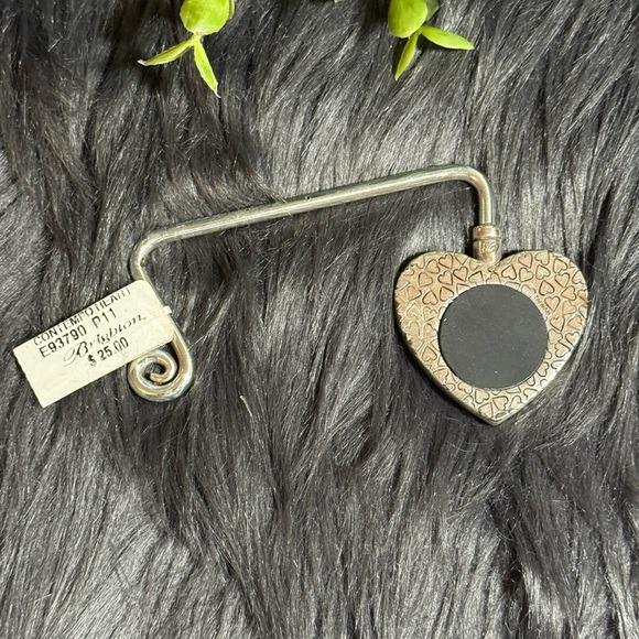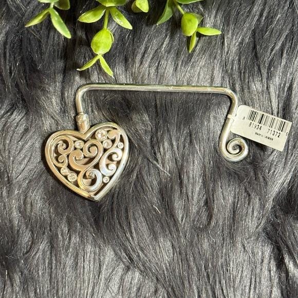 Brighton heart-shaped scroll motif. Silver-tone metal with crystal accents. Folds for compact storage. Stylish and functional accessory.