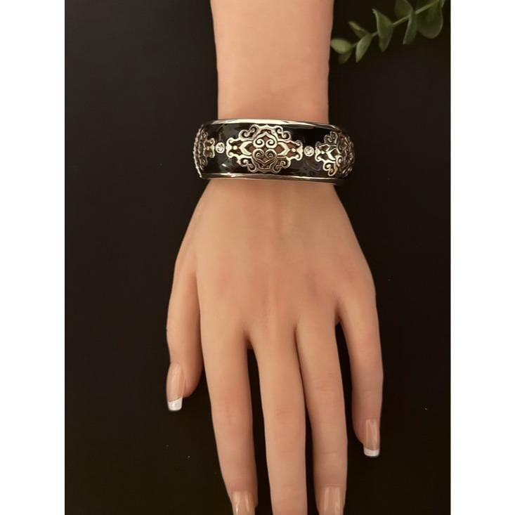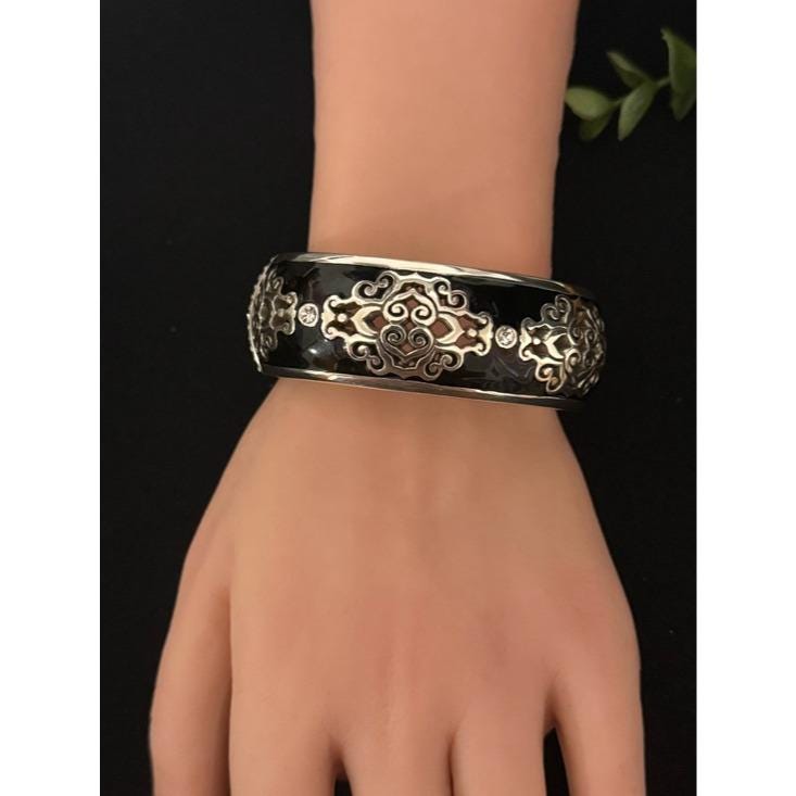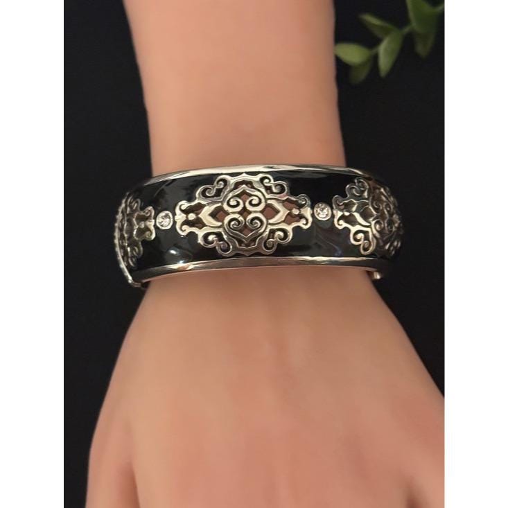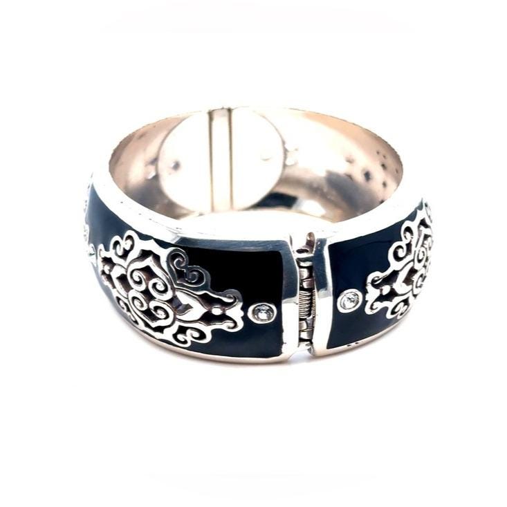 Elegant Brighton black enamel bangle featuring intricate silver-tone filigree details and sparkling crystal accents. Lightweight and comfortable for everyday wear. Classic black design pairs easily with any outfit.