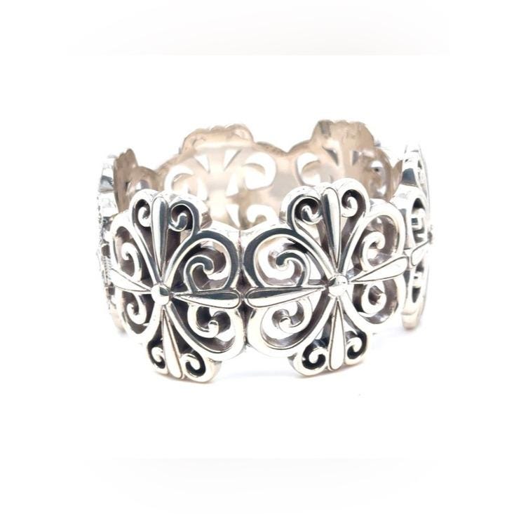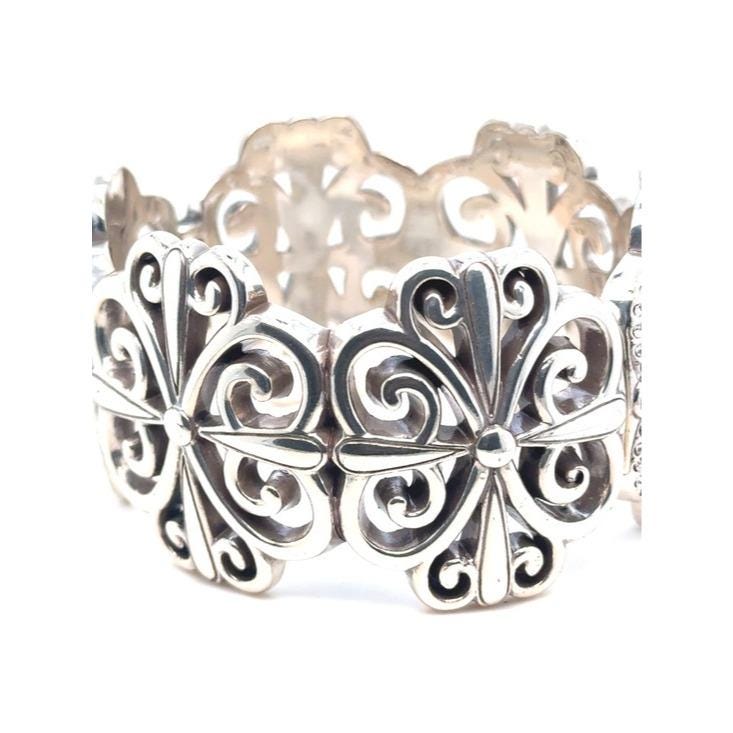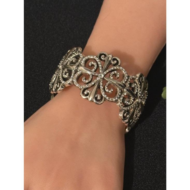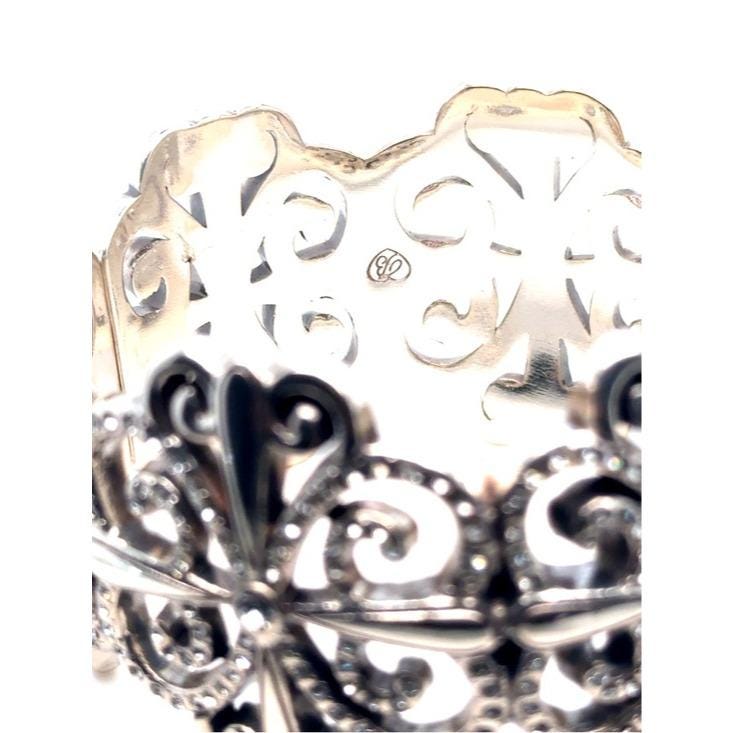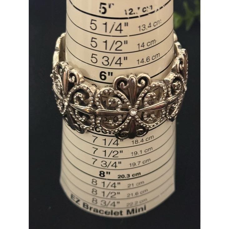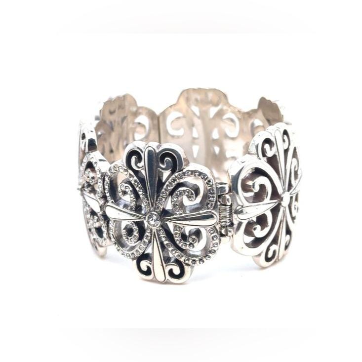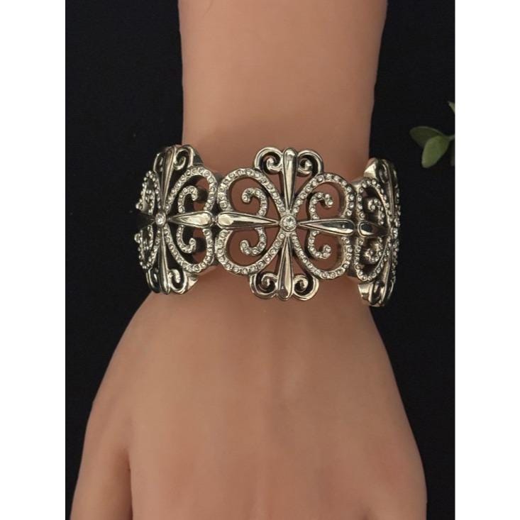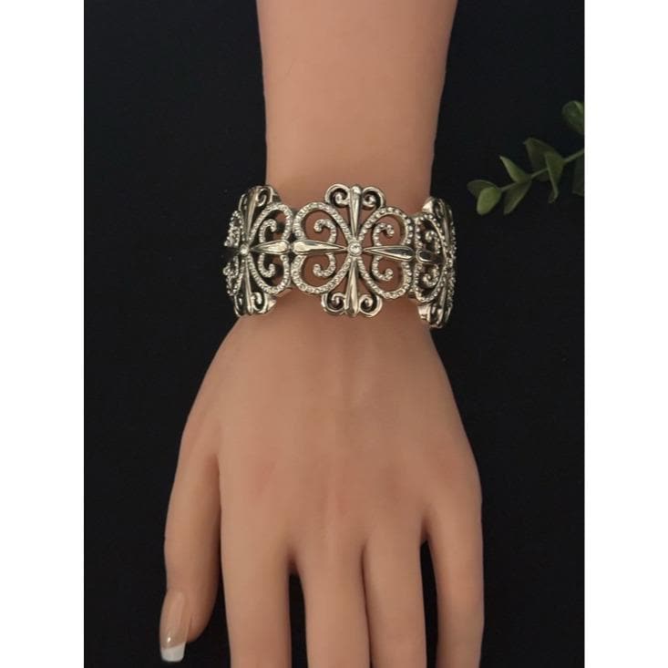 Brighton bracelet with ornate filigree panels. Sparkling crystal accents highlight the design. Stretch band for easy on and off. Elegant statement piece for day or night.