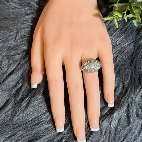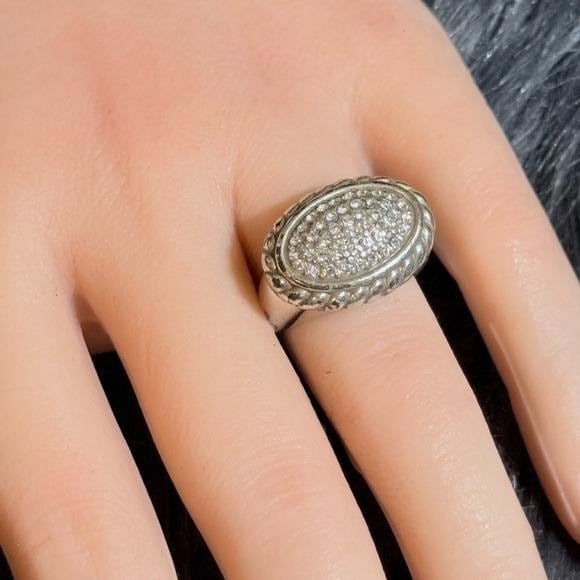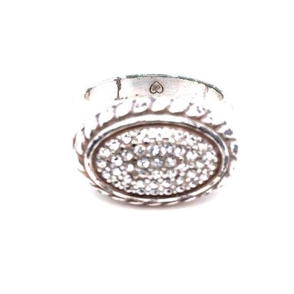 Brighton oval ring with clustered clear crystals. Silver-tone metal frame with decorative edge. Sparkling accent for dressy or casual looks. Lightweight and easy to pair.