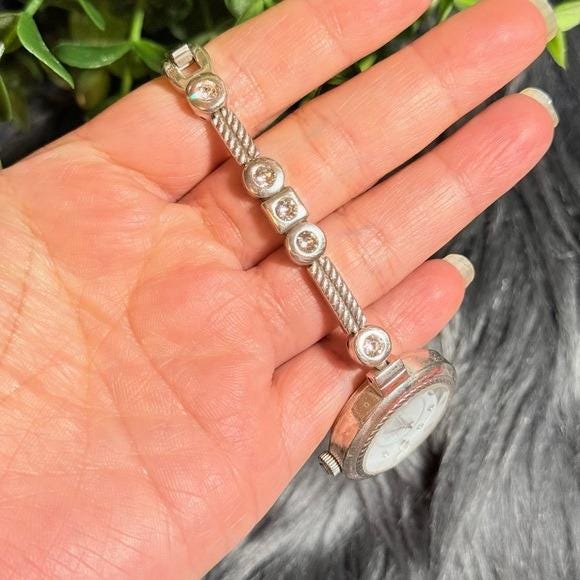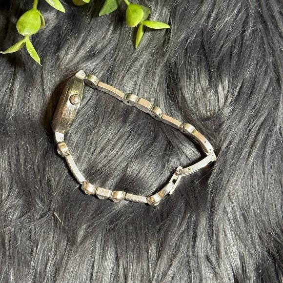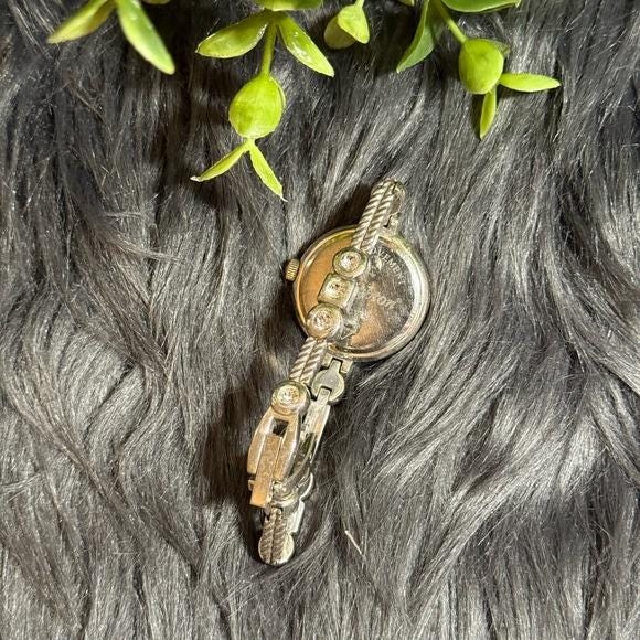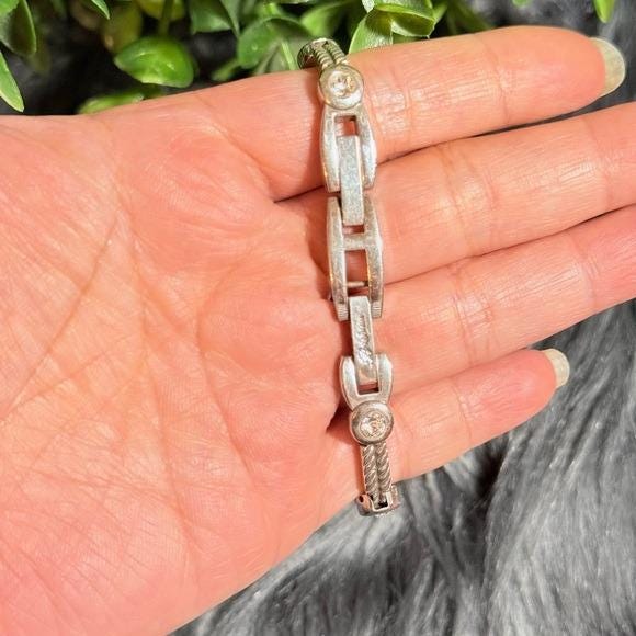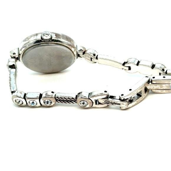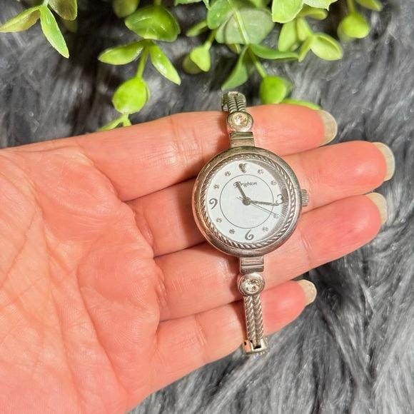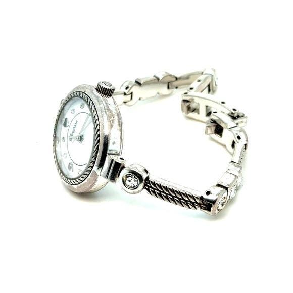 Brighton bracelet watch with a polished silver-tone finish. White round dial with crystal hour markers. Decorative rope-edge bezel and engraved links. Slim bracelet style for a feminine look.