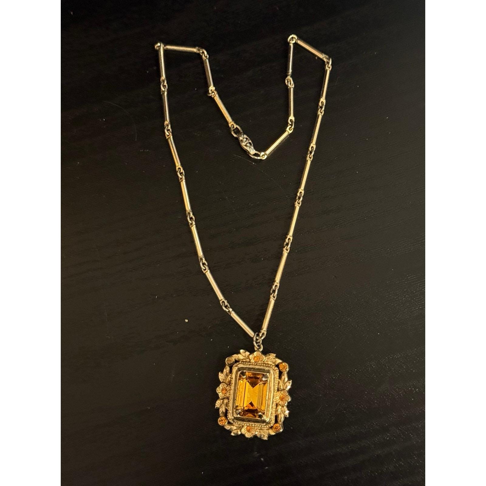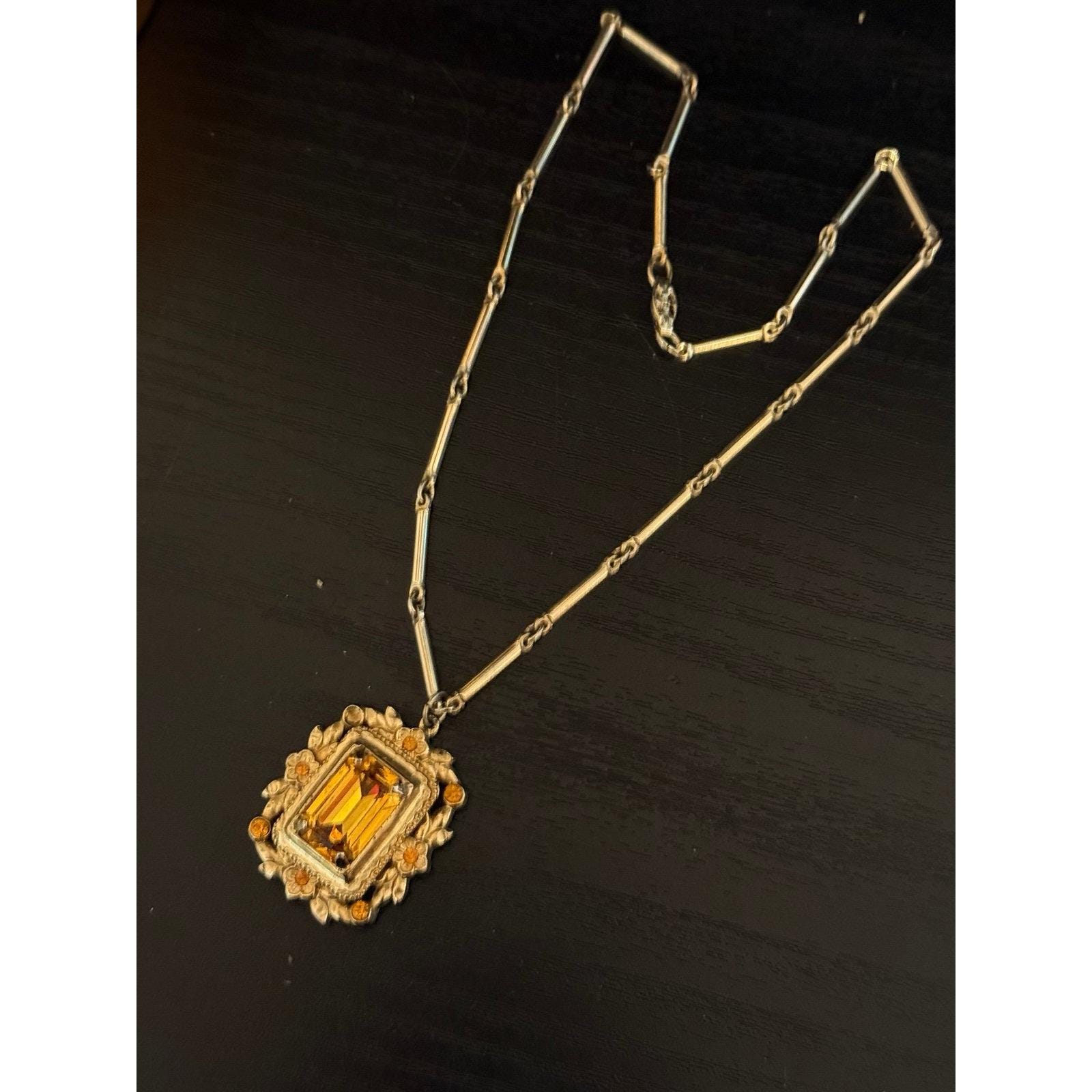 This item is a collectible vintage 1950s Coro pendant necklace featuring a large emerald-cut citrine-colored rhinestone surrounded by small accent stones. The piece is crafted with a gold-tone setting and showcases a floral or ornate design characteristic of mid-century costume jewelry.