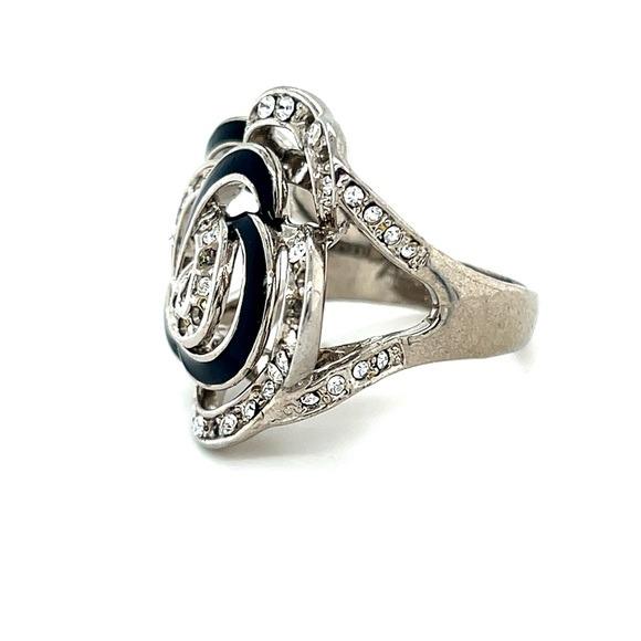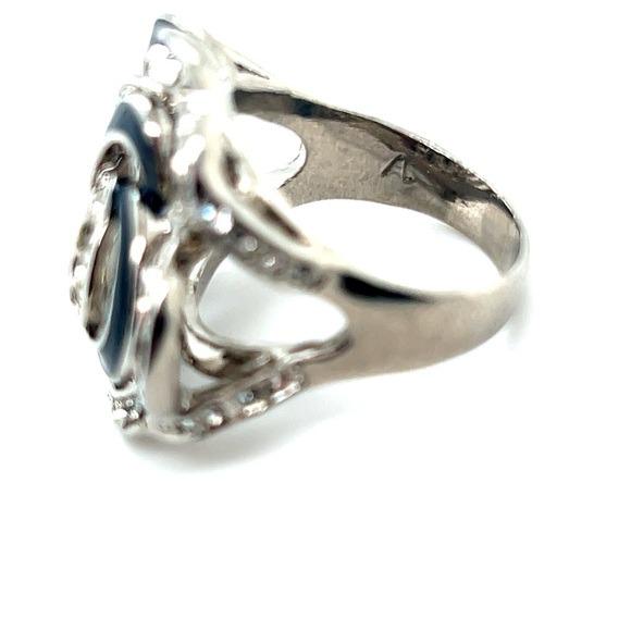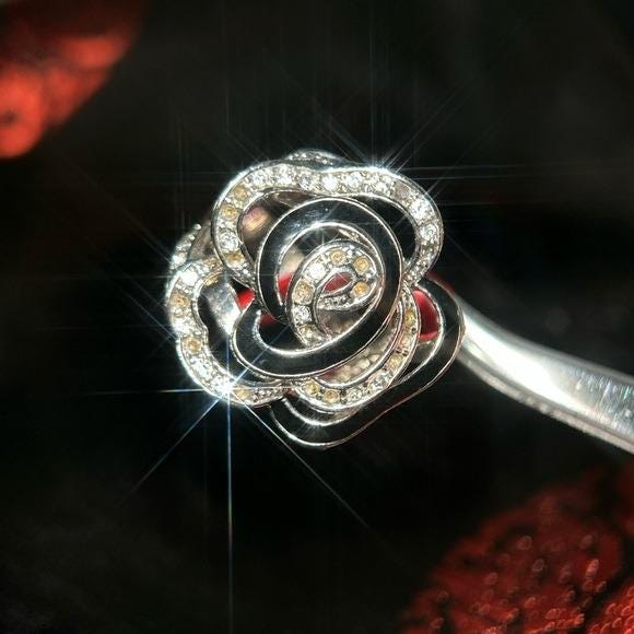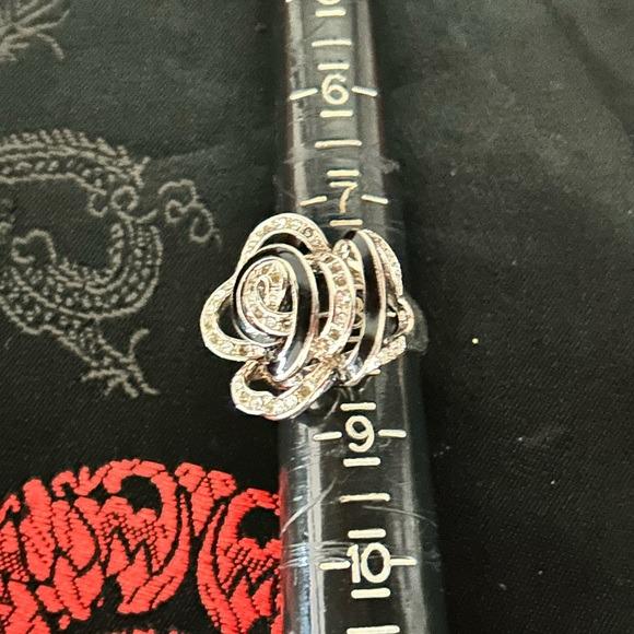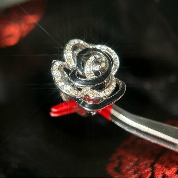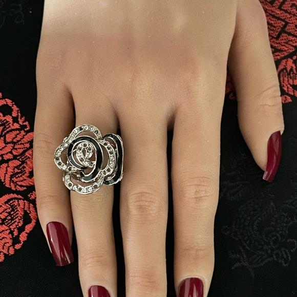 This elegant floral ring features a stunning combination of silver and black, perfect for adding a touch of sophistication to any outfit. The intricate design and sparkling accents make it a standout piece in any jewelry collection.