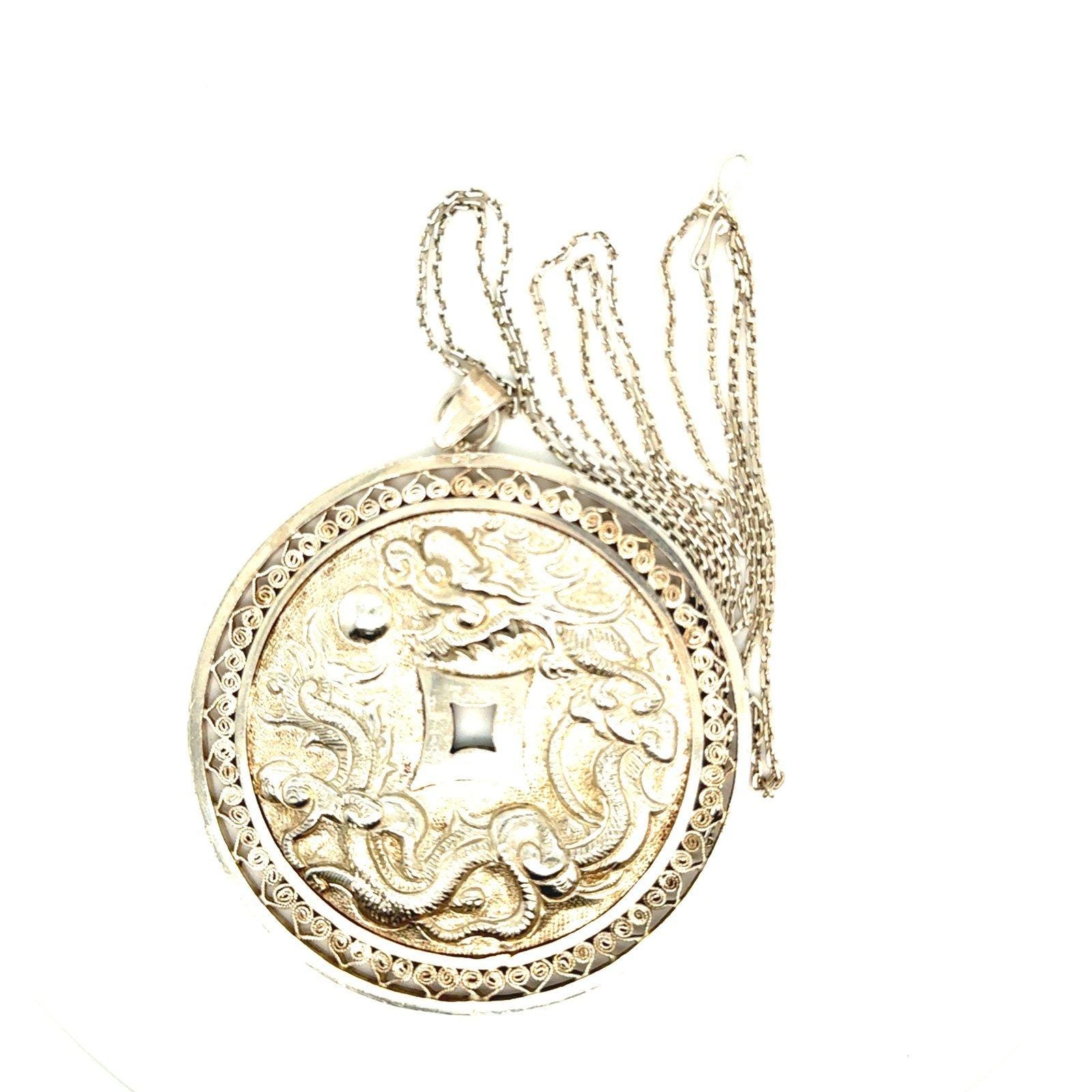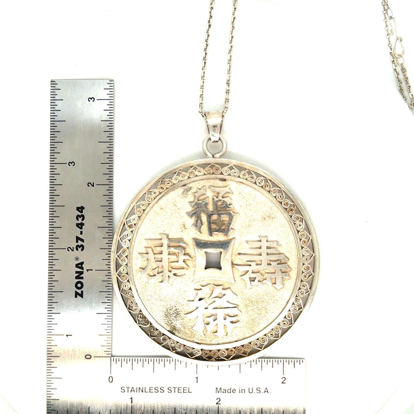 Sterling Silver Chinese Circle Pendant Necklace .