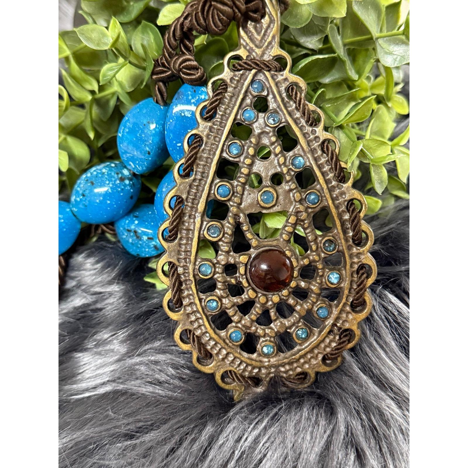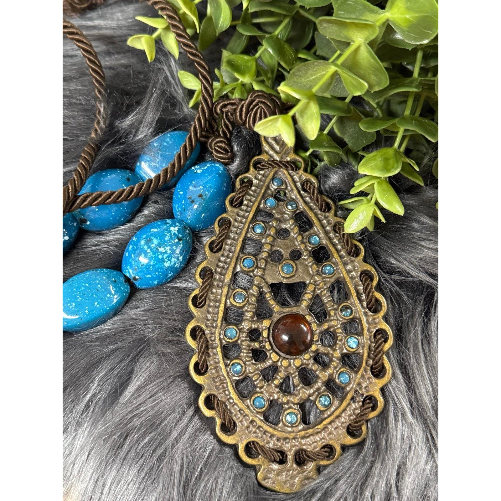 Extra Large Pendant Blue Beads Brown Cord Necklace