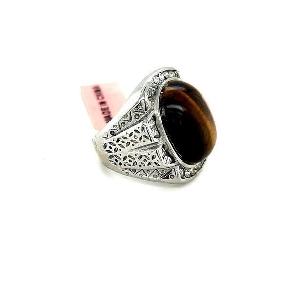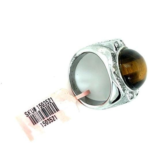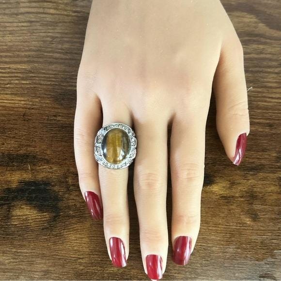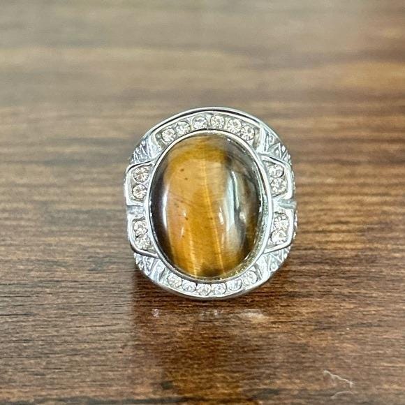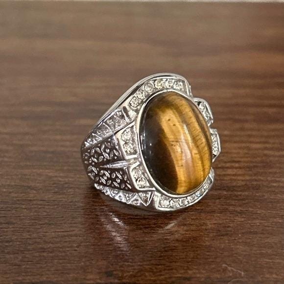 Polished tiger eye center stone set in a silver-tone band with sparkling crystal accents. The brown tiger eye offers warm, chatoyant depth for everyday elegance. A versatile, eye-catching piece that complements both casual and dress looks.