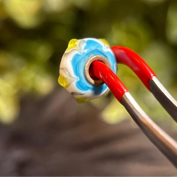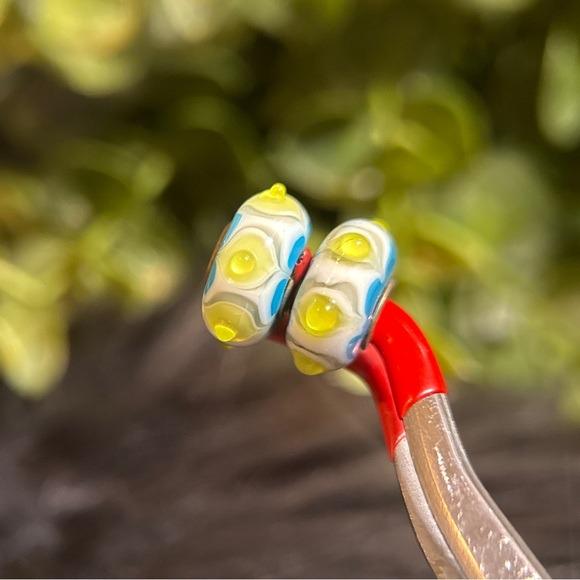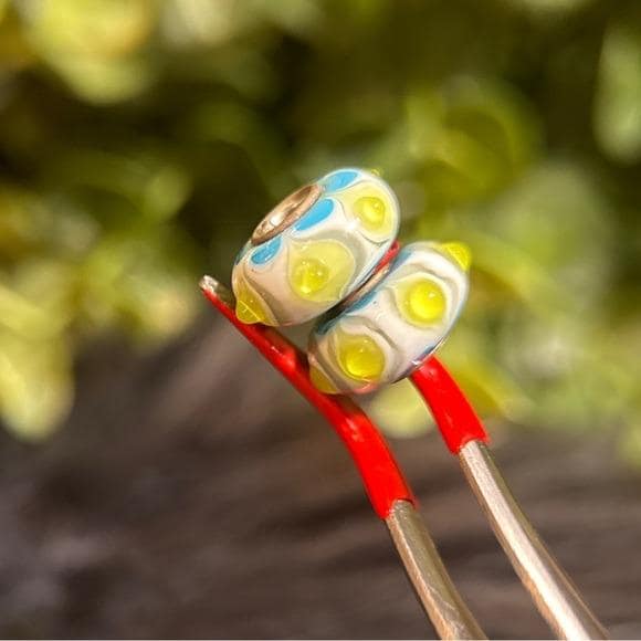 Set of two glass charm beads. Round shape with blue flower accents and lime green dots on a white base. Silver-tone core. Bright, playful colors. Great for charm bracelets or DIY jewelry.
