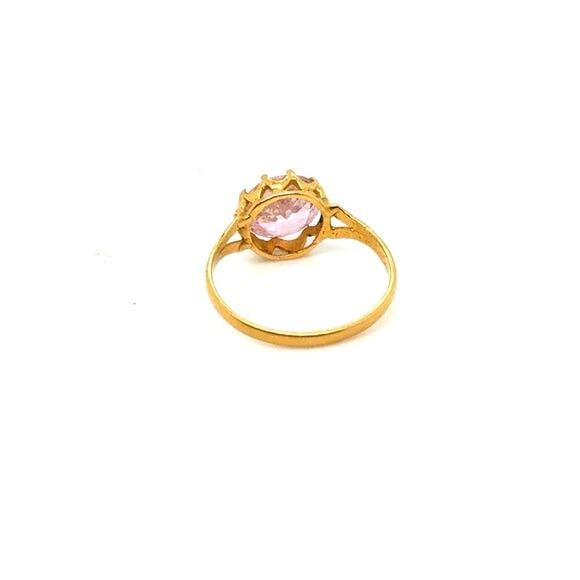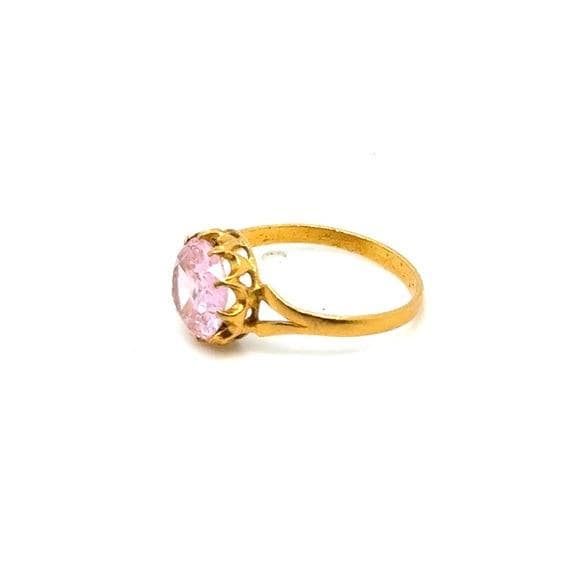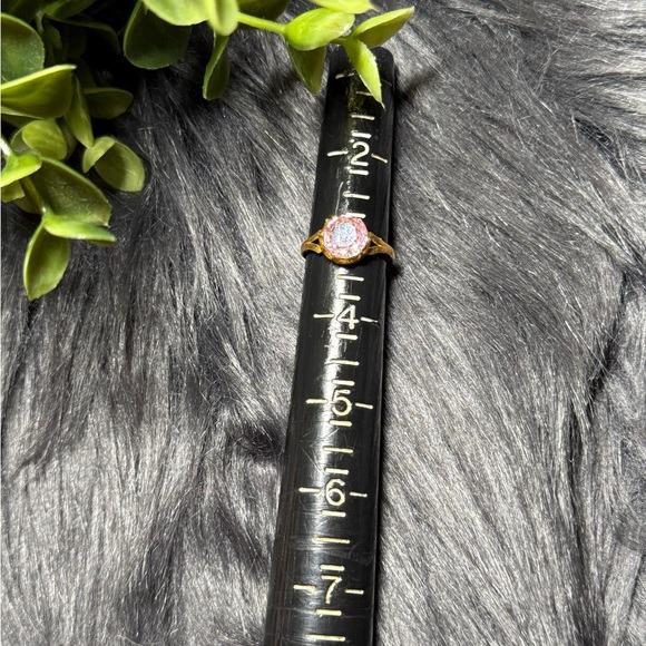 Elegant gold-tone ring featuring a round pink gemstone. Classic design that adds a feminine touch to any outfit. Comfortable band and secure prong setting highlight the stone’s sparkle.