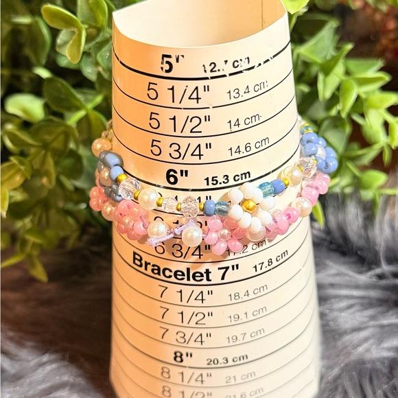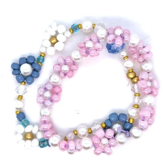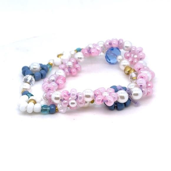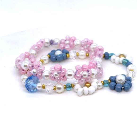 Delicate pink and blue beaded bracelets with pearl and crystal accents. Lightweight, stackable design for everyday wear. Features floral bead clusters in pink and blue for a feminine touch.