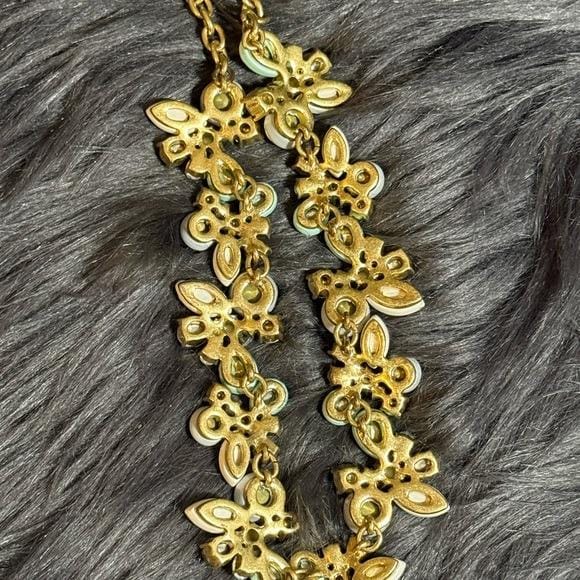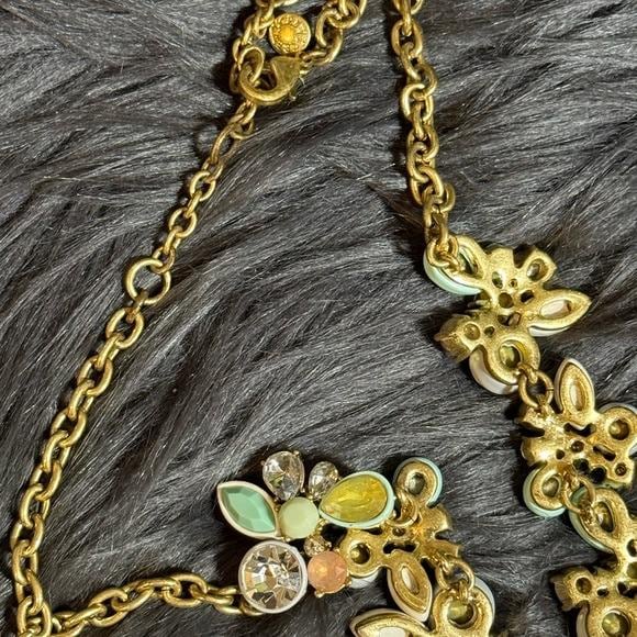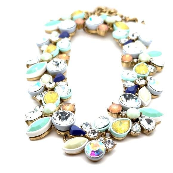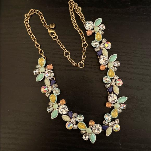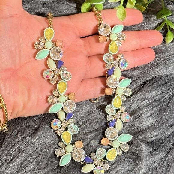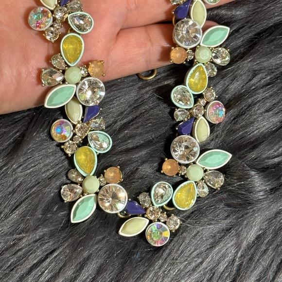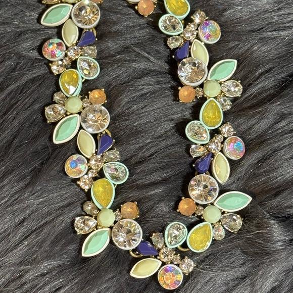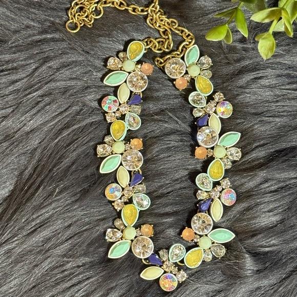 Bold floral-inspired statement necklace by J. Crew. Multicolor crystals and cabochons create a lively look. Gold-tone settings add subtle shine. Striking piece for evening or daytime wear.