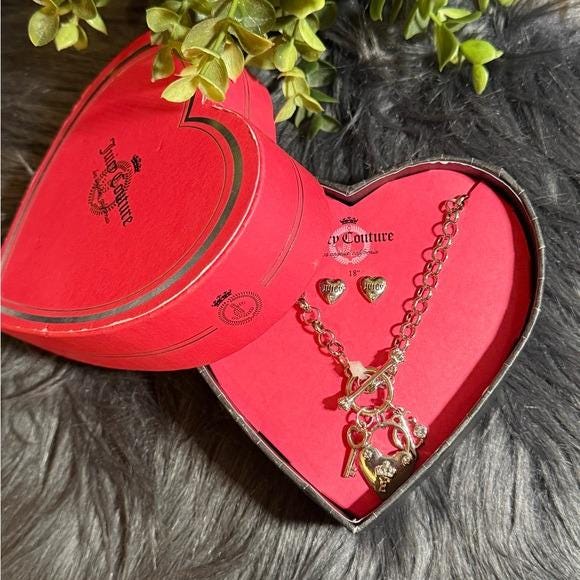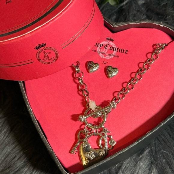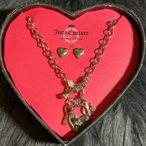 Silver-tone Juicy Couture necklace with dangling heart, key and lock charms and heart stud earrings set. Sparkling crystal accent adds subtle sparkle. Toggle clasp and charm cluster for a playful look. Great for layering or statement wear.