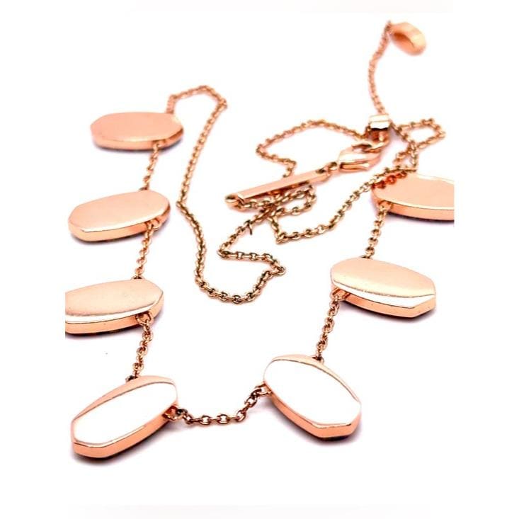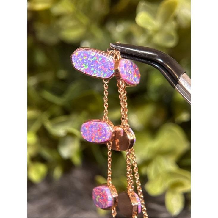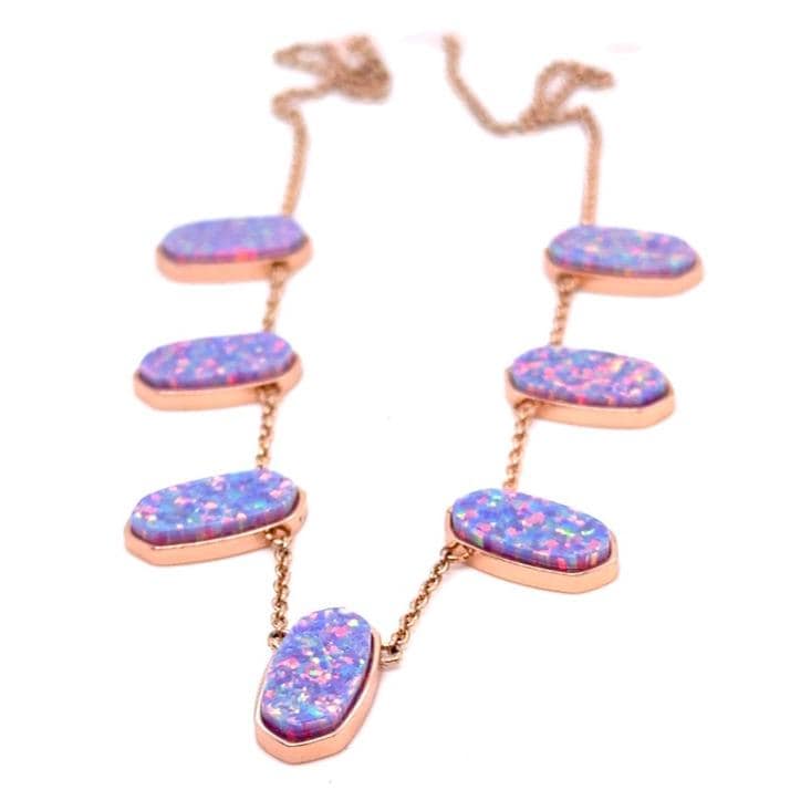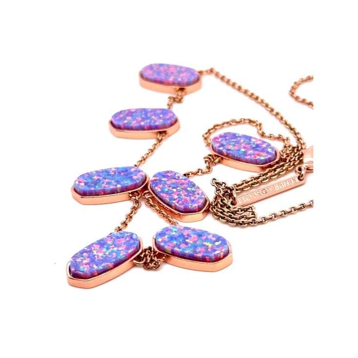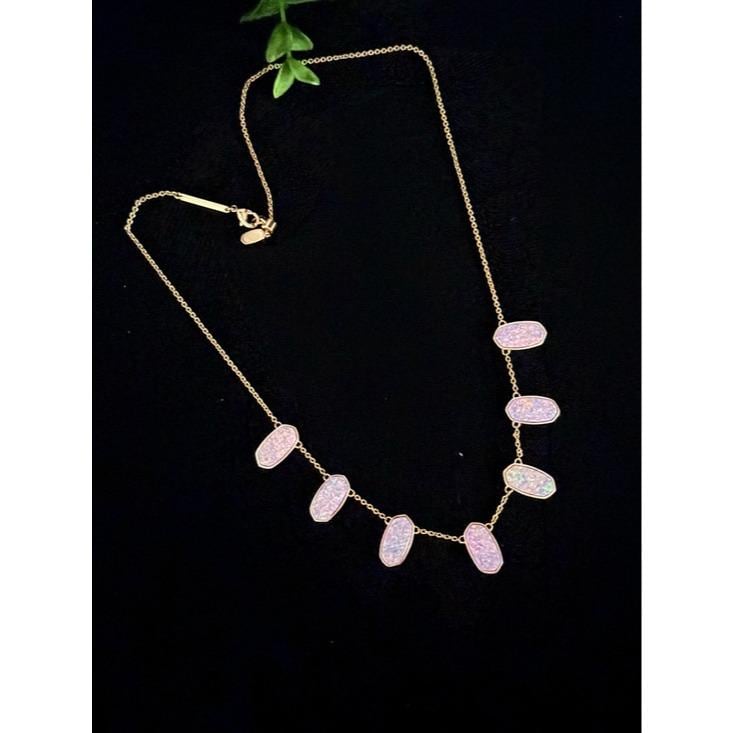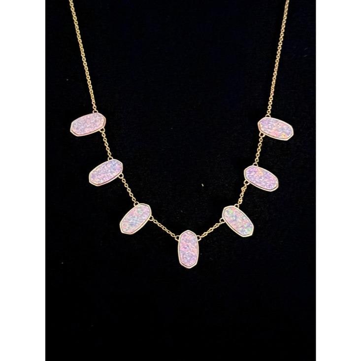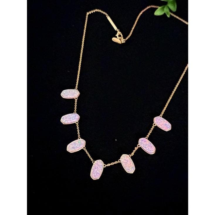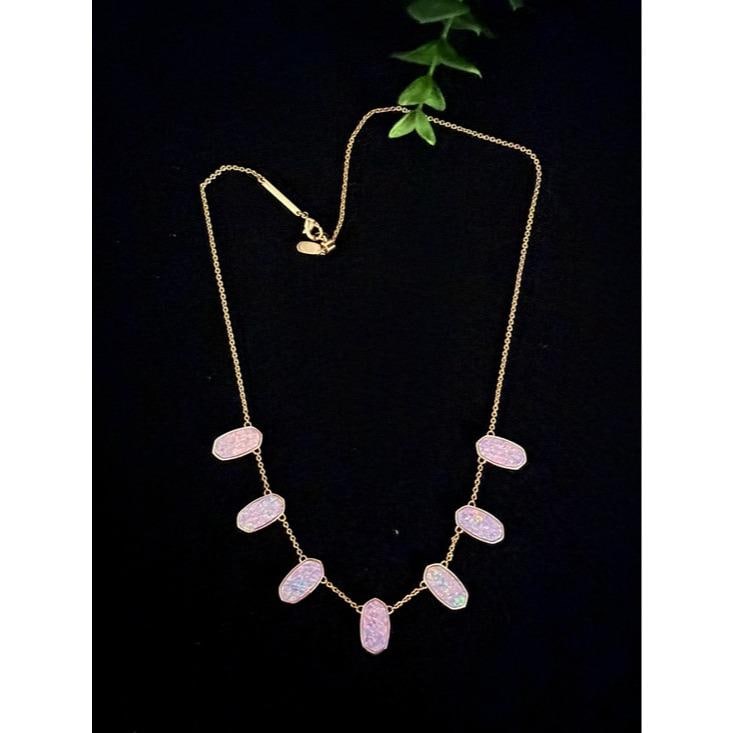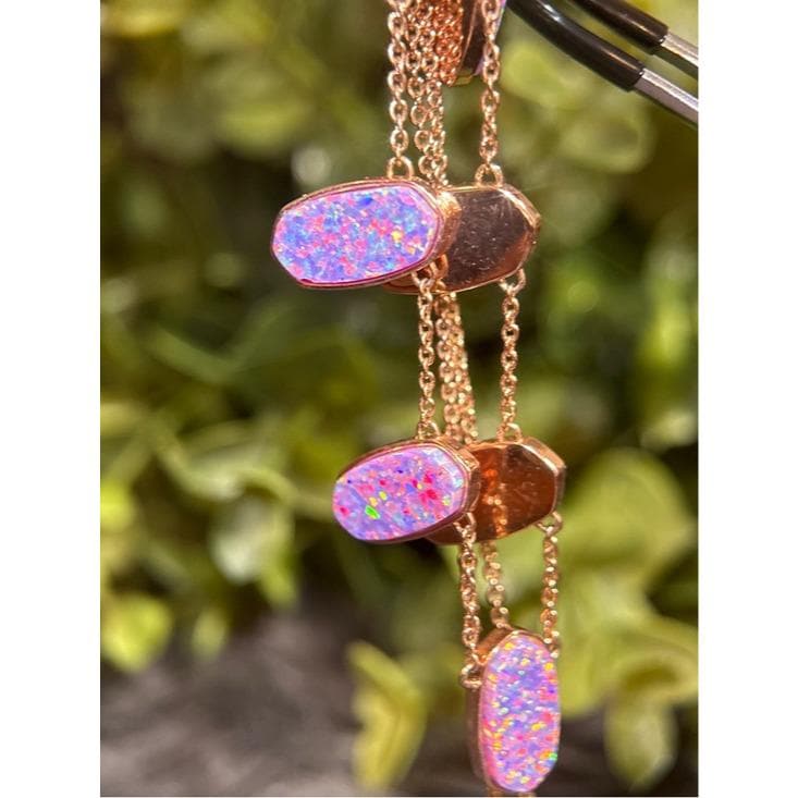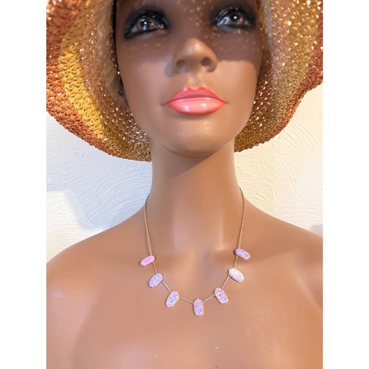Kendra Scott station necklace with pink opalescent stones set in rose gold. Sparkling, iridescent pink tones add feminine shine. Delicate chain links between each stone create a refined look. Versatile for day or evening wear.