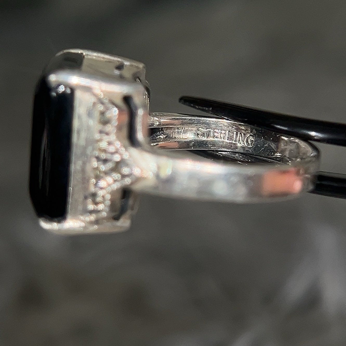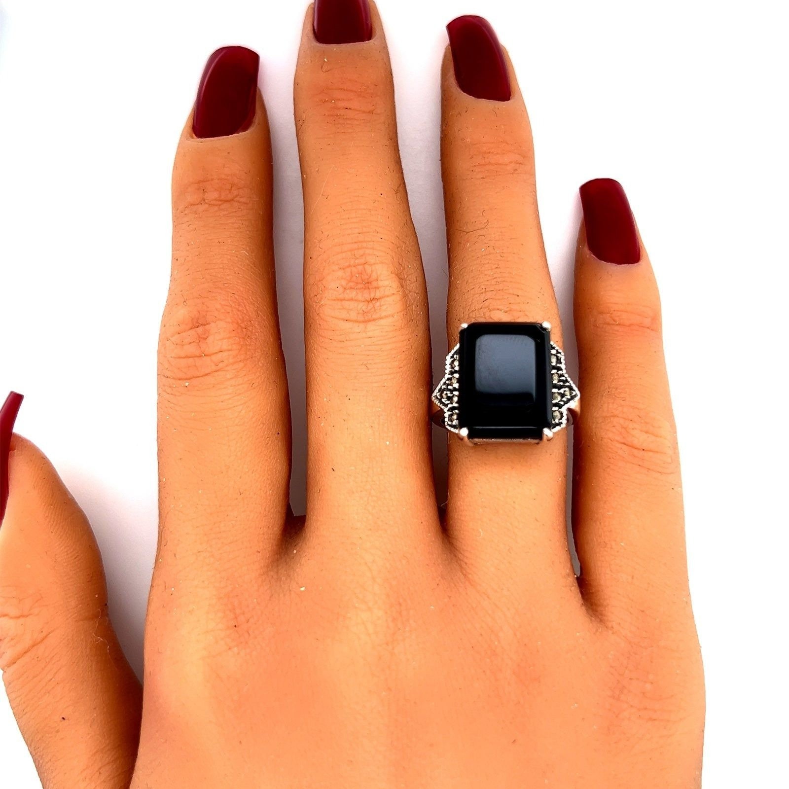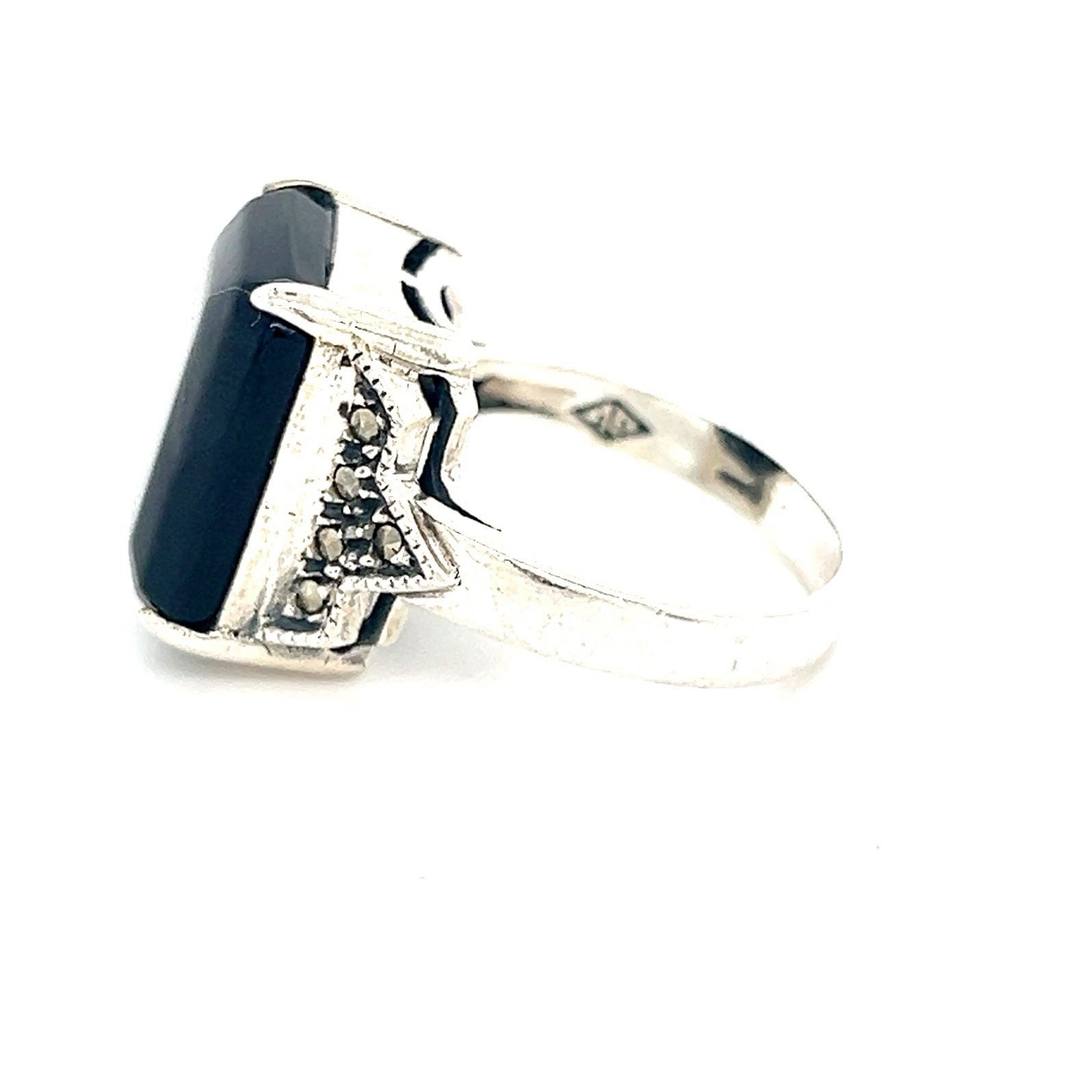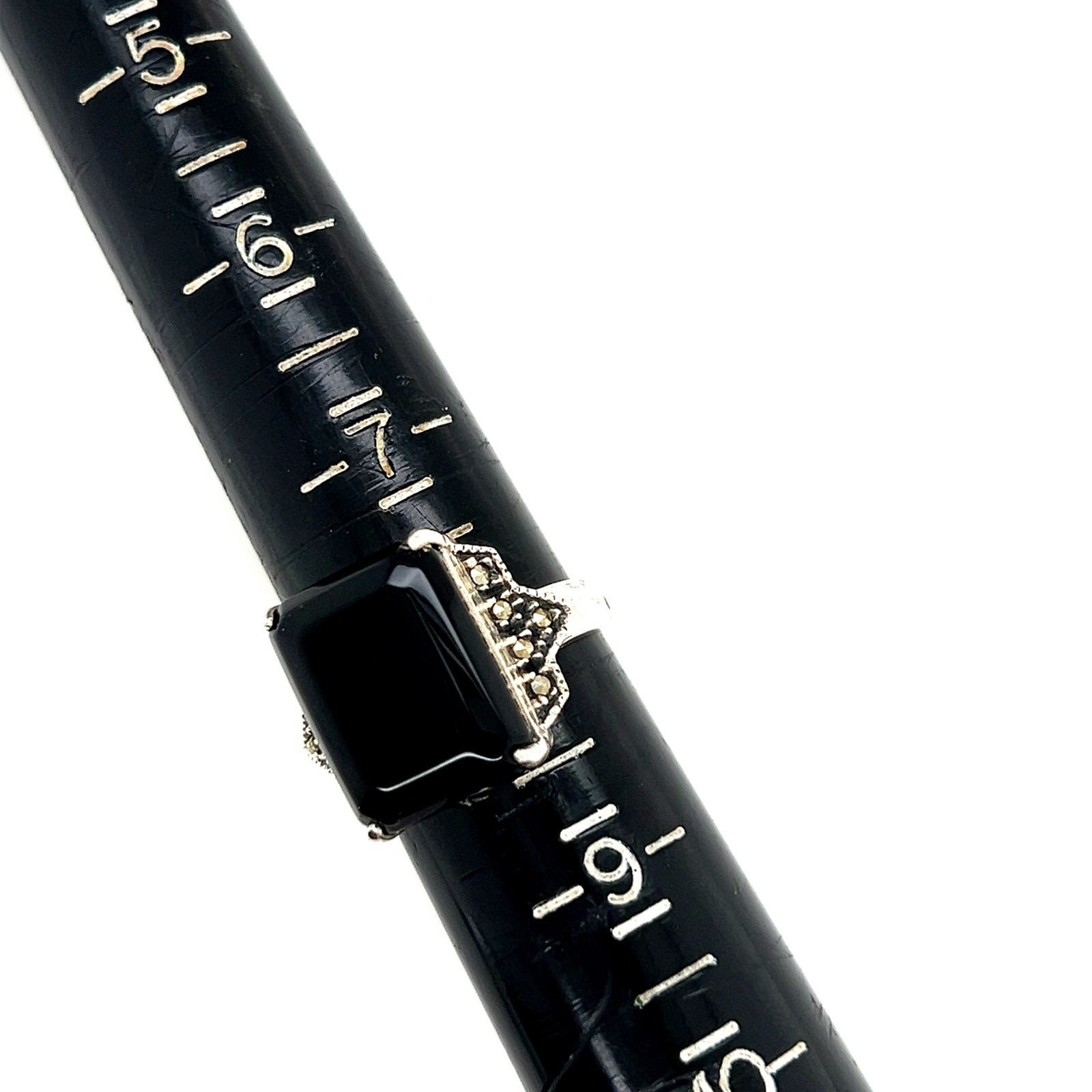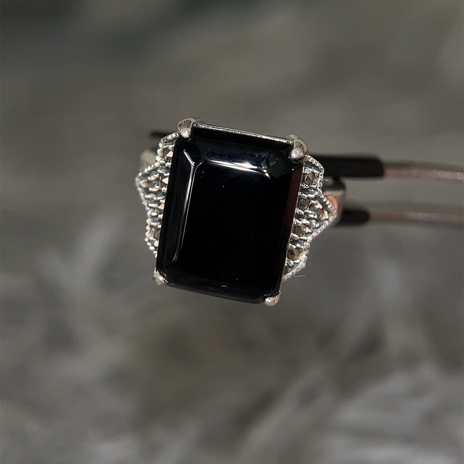 Sterling Silver 925 Large Rectangular Onyx/Marcasite Ring.