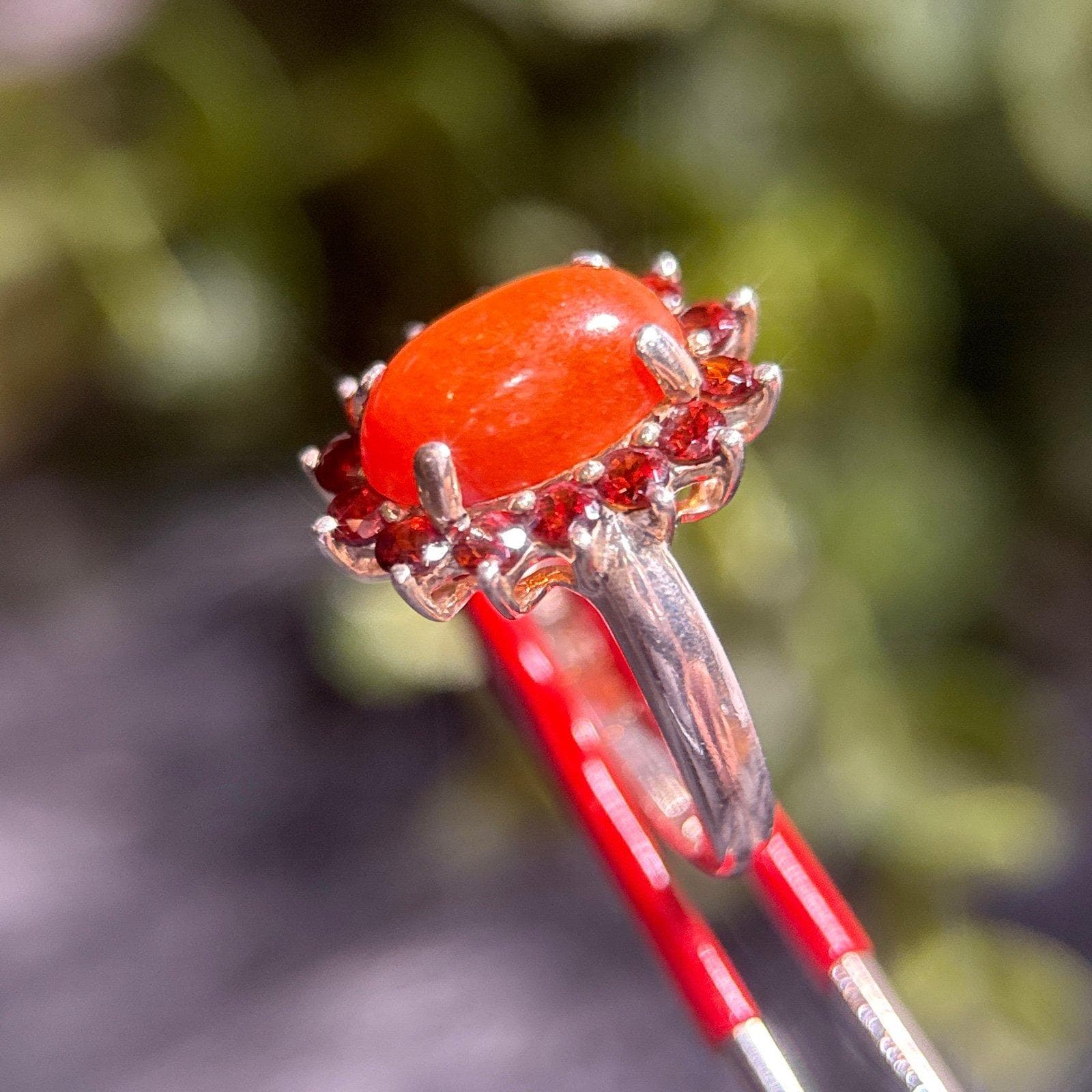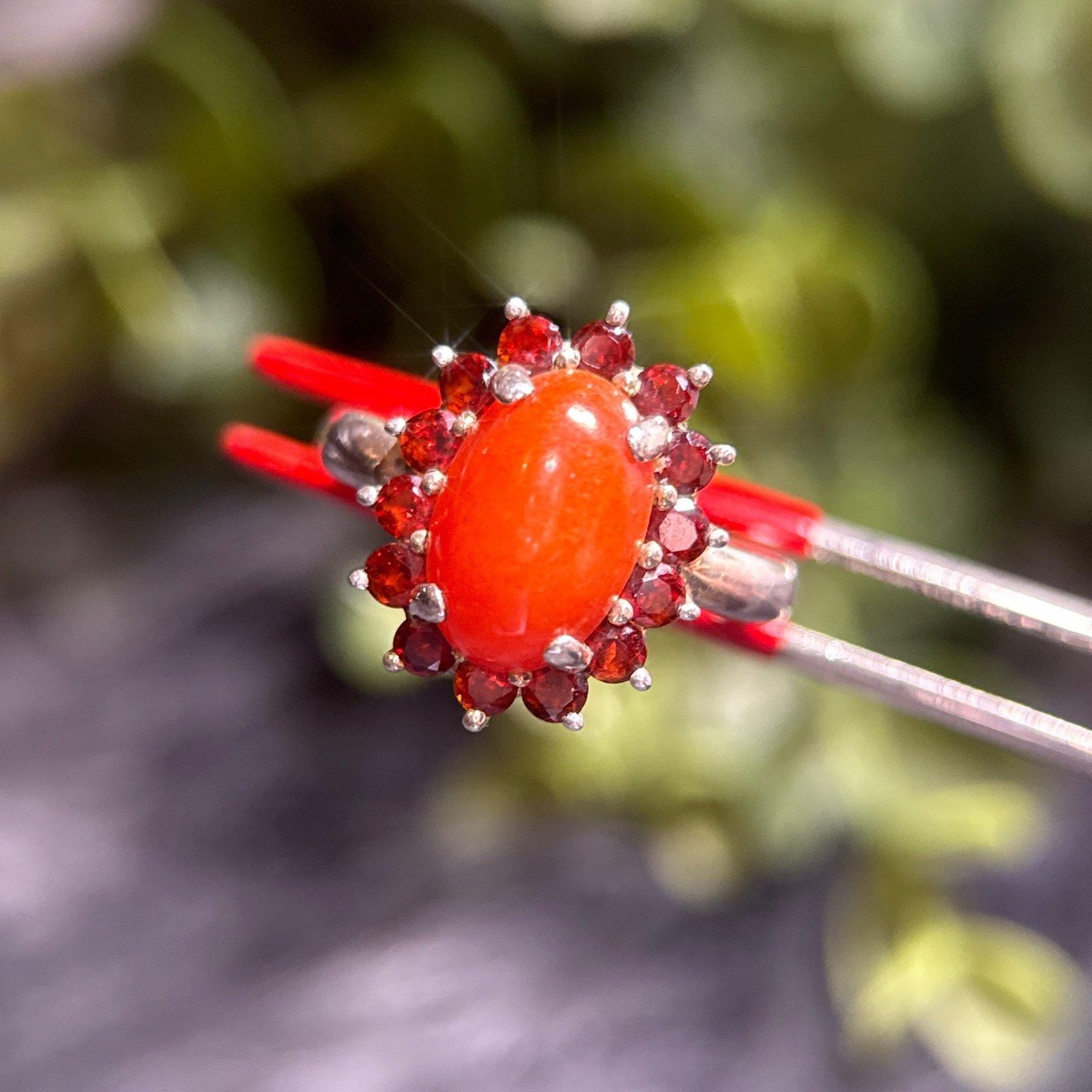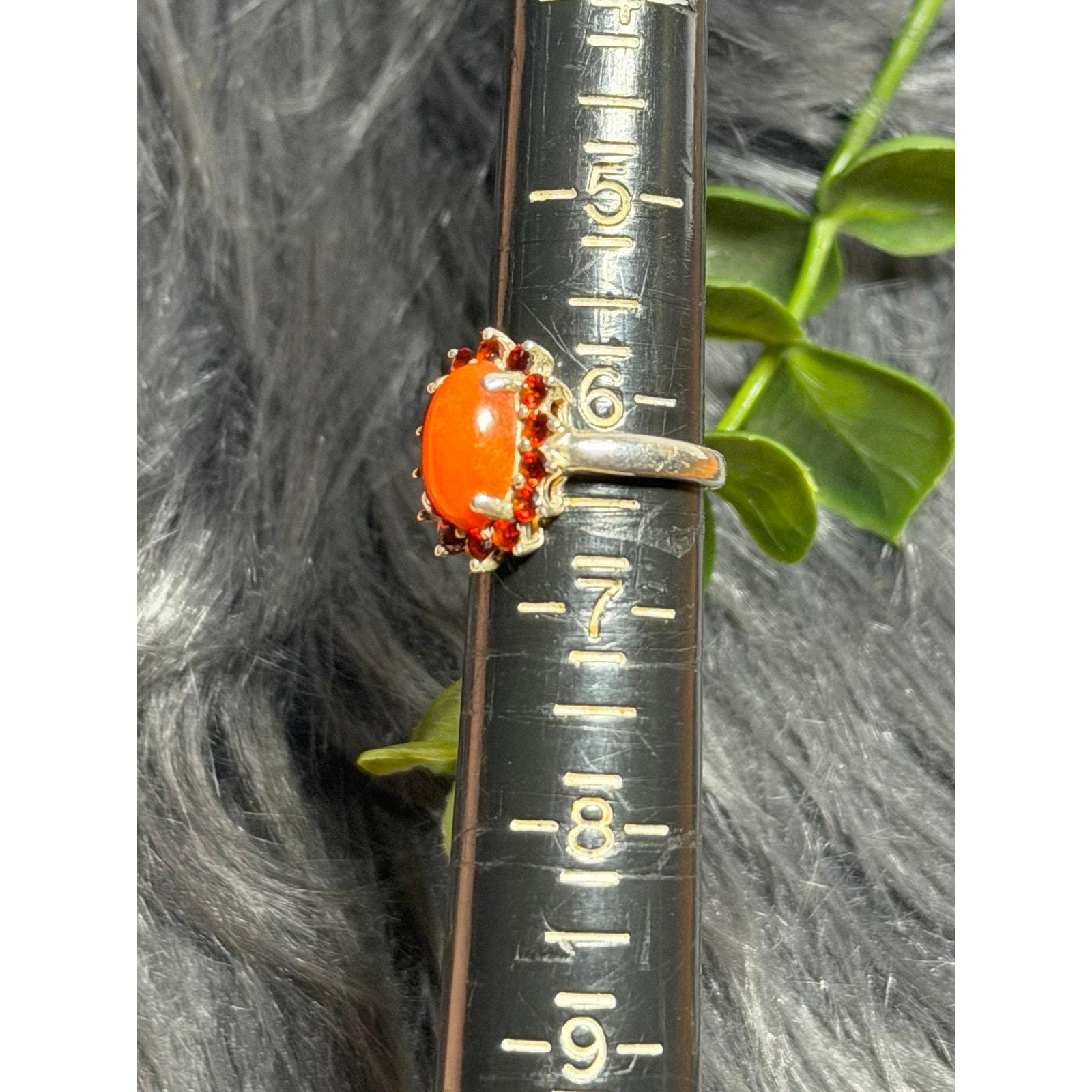 Sterling Silver 925 Orange Stone Center Stone Surrounded with Red Garnet Ring.