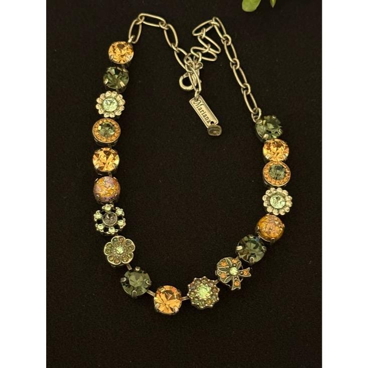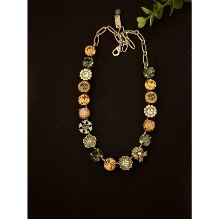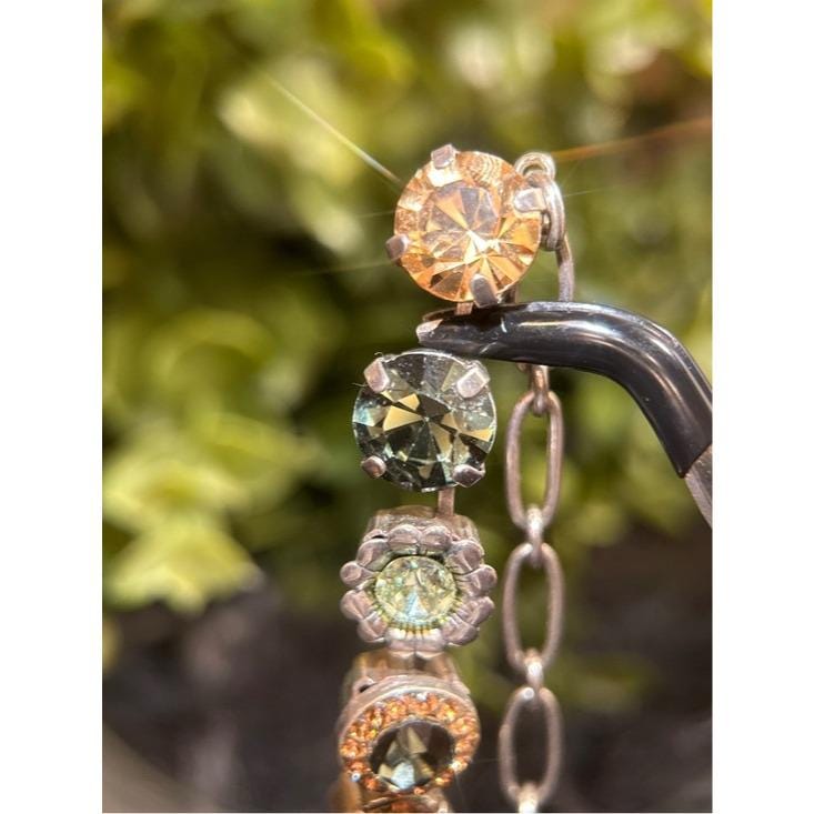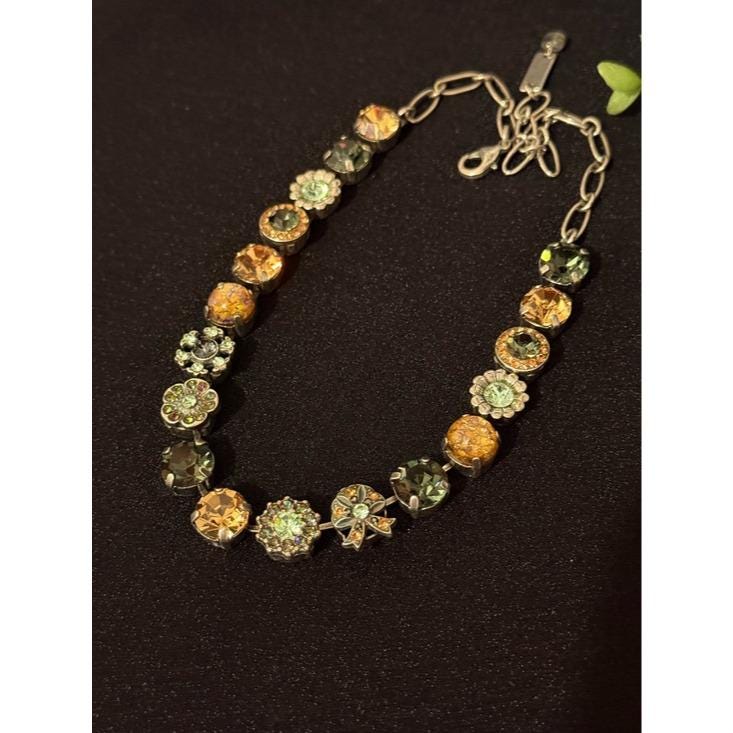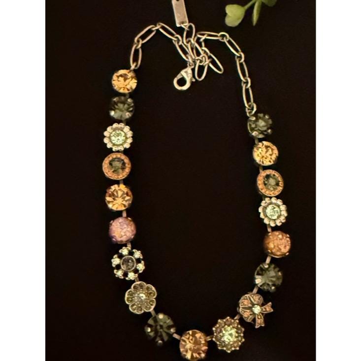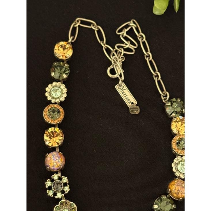 Elegant necklace featuring alternating round crystal stations in green, champagne, mint, and iridescent tones. Secure link chain with lobster clasp for adjustable wear. Sparkling accents add refined shine to any outfit. Designed for everyday elegance and special occasions.