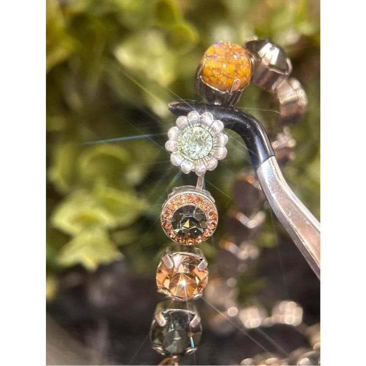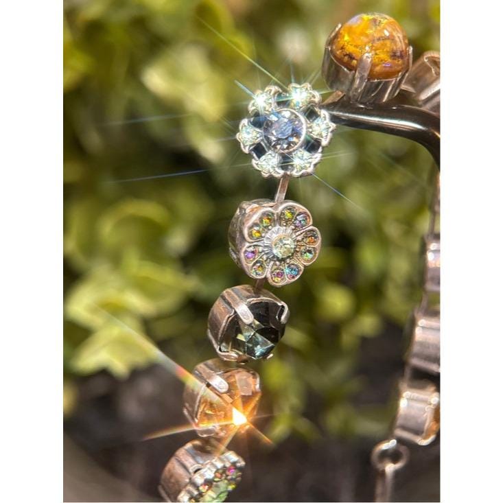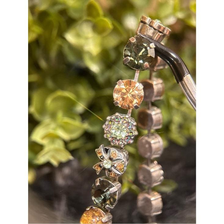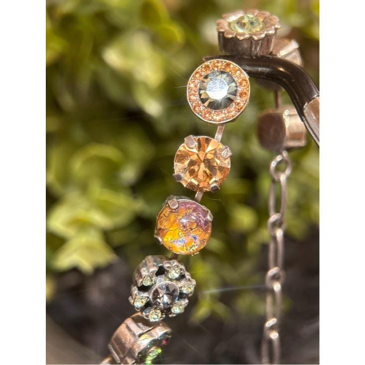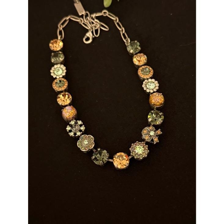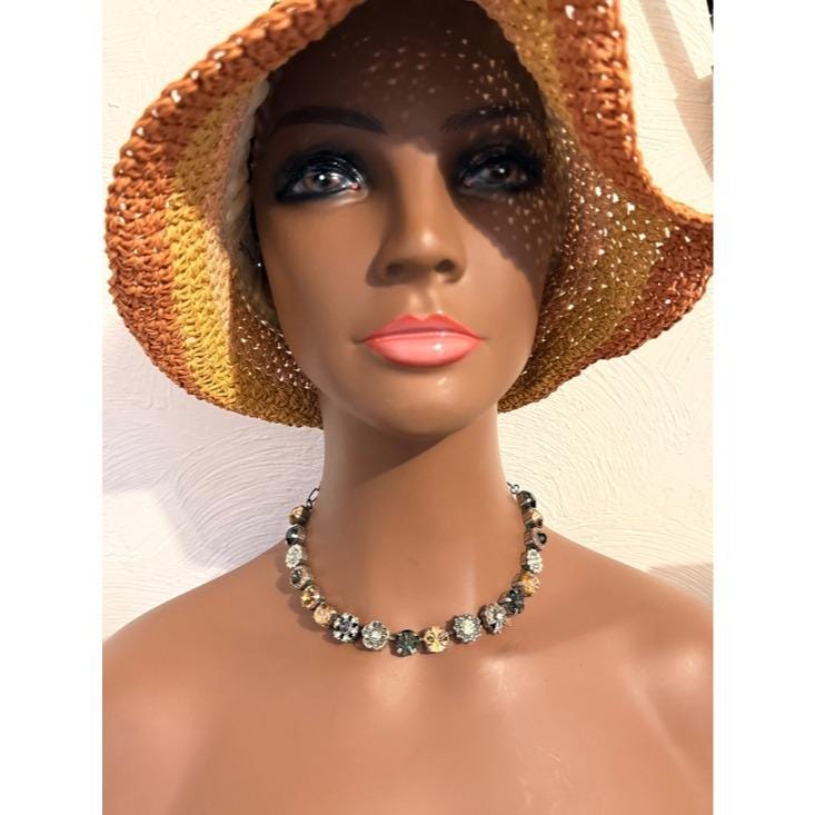 Elegant necklace featuring alternating round crystal stations in green, champagne, mint, and iridescent tones. Secure link chain with lobster clasp for adjustable wear. Sparkling accents add refined shine to any outfit. Designed for everyday elegance and special occasions.