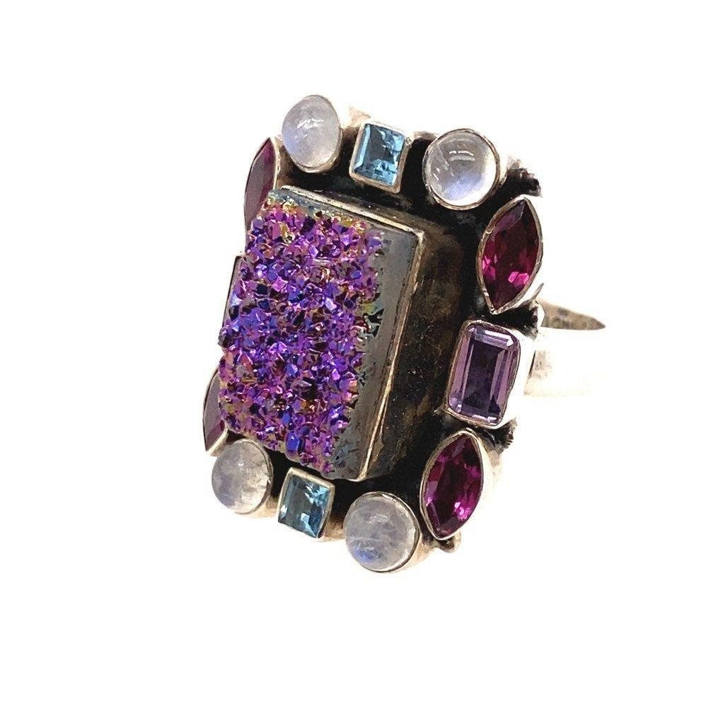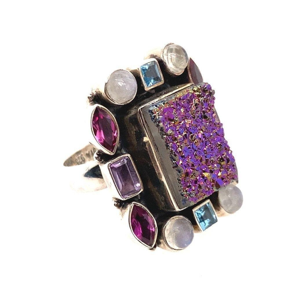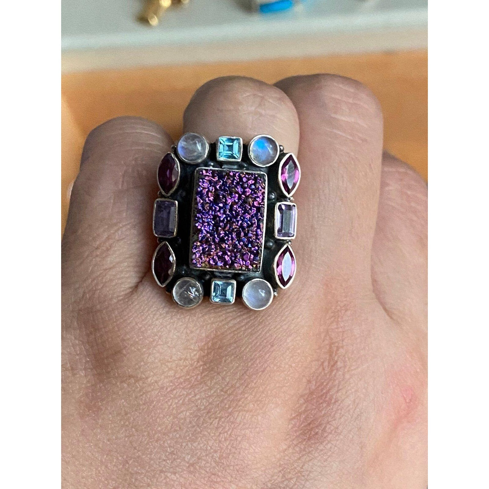 Stunning Nicky Butler 925 Square Druzy Moonstone, Topaz and Amethysts Ring . This is a great statement piece.