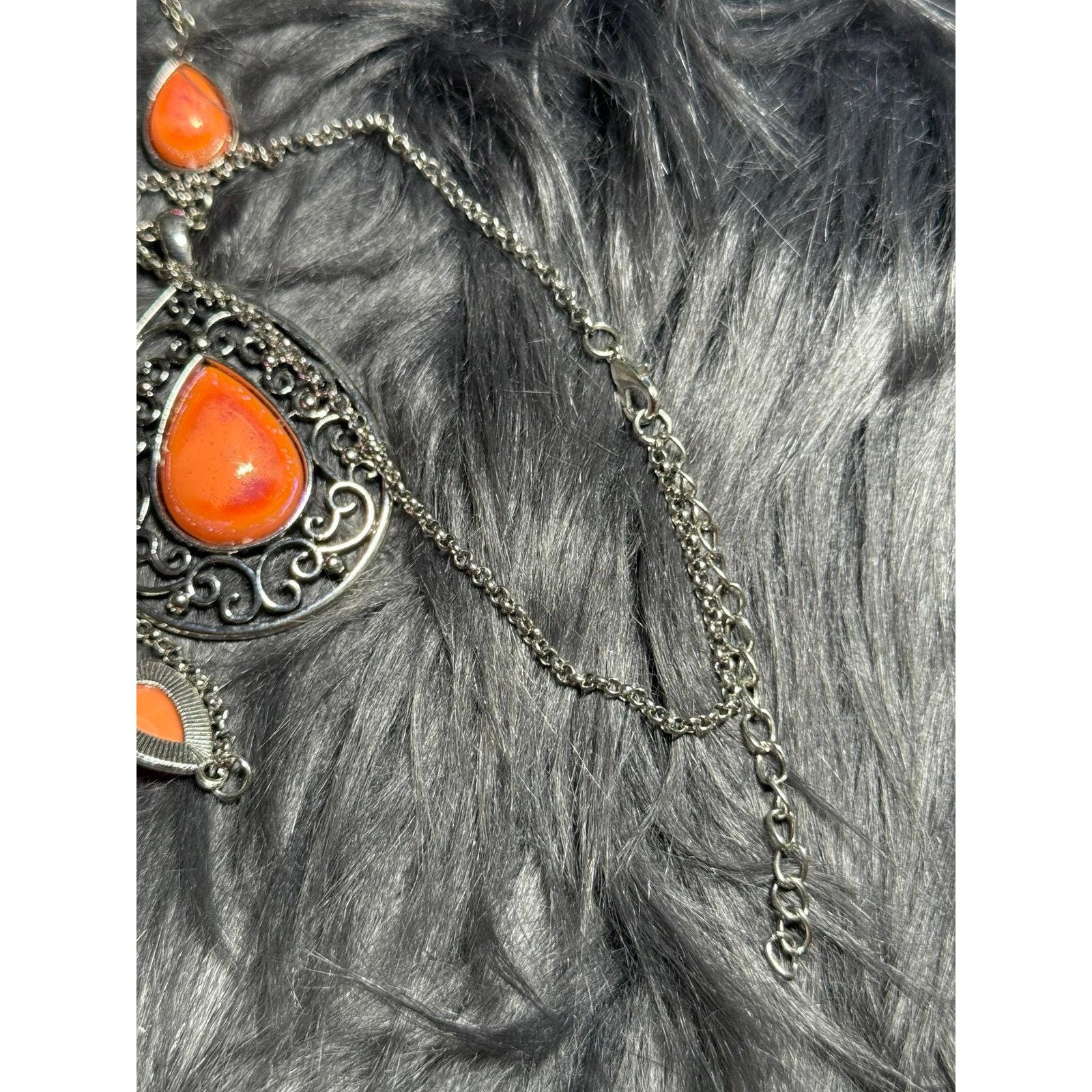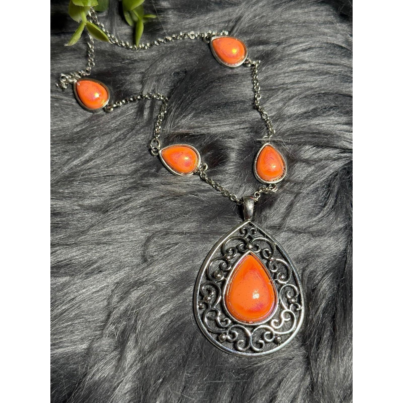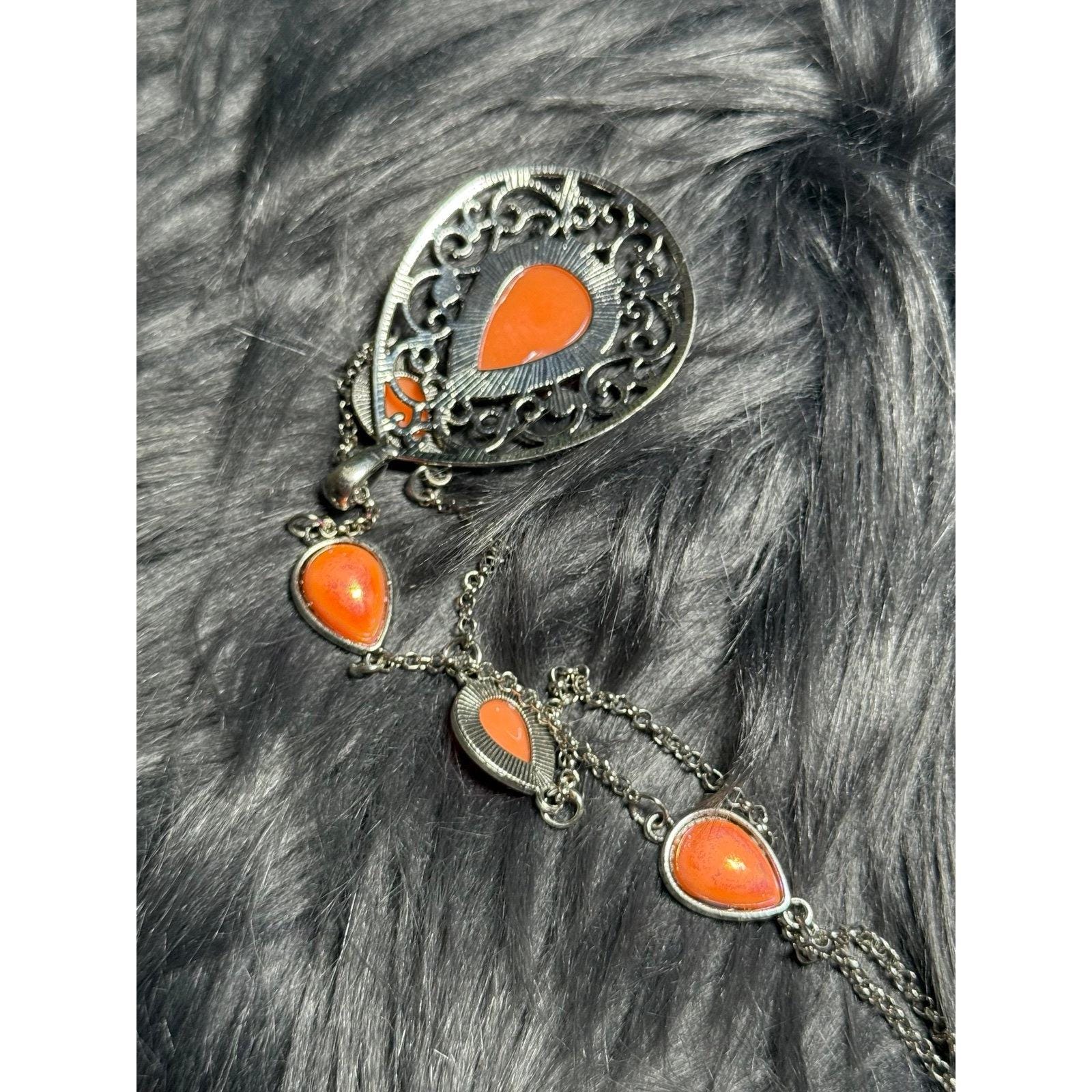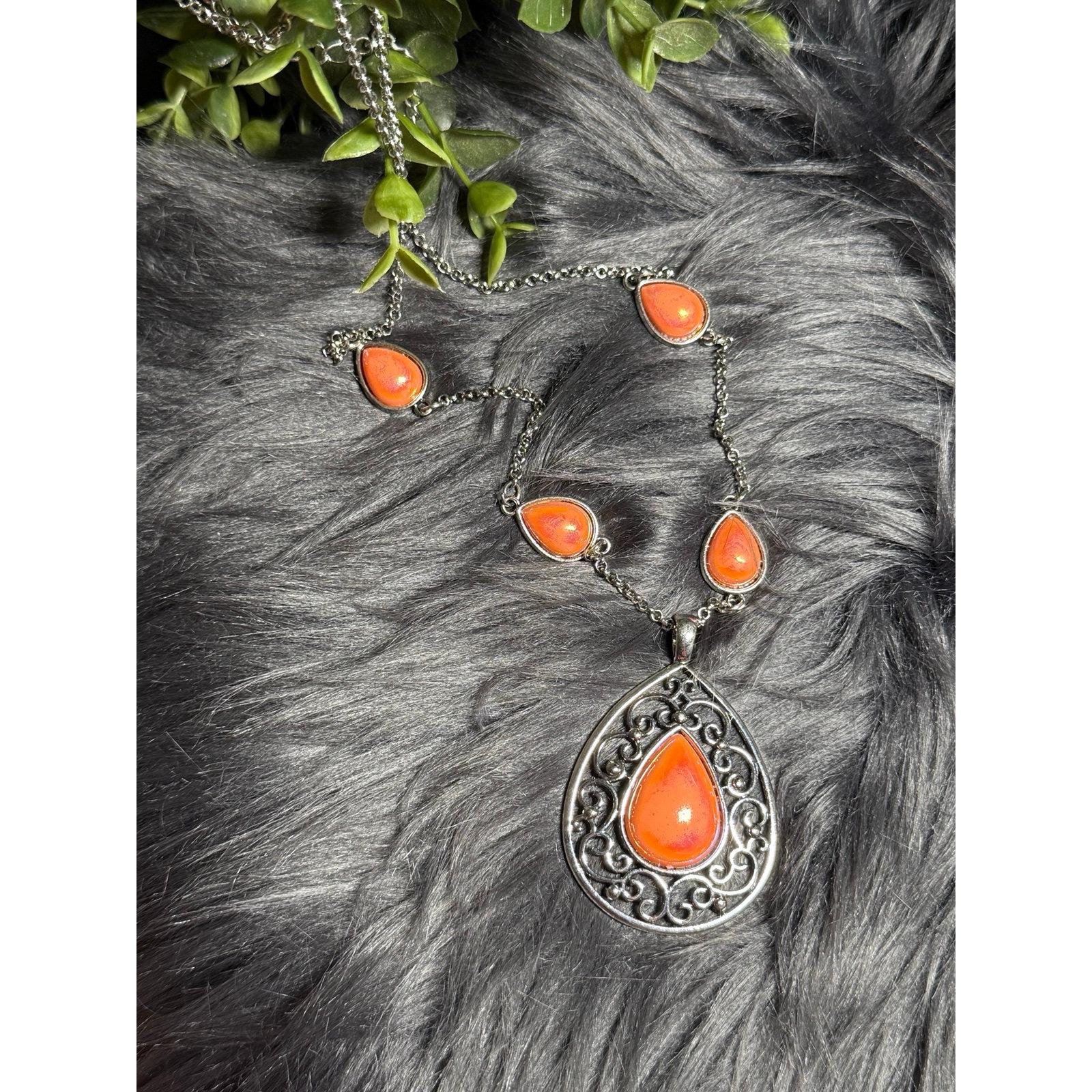 *Orange Necklace *Silver Tone *Measures 25”-28” L *Excellent condition