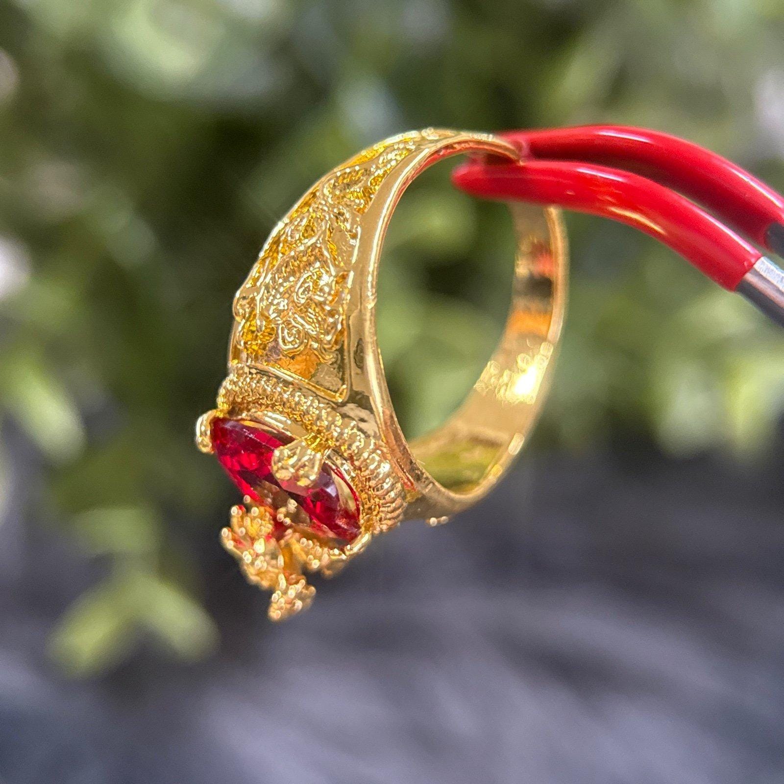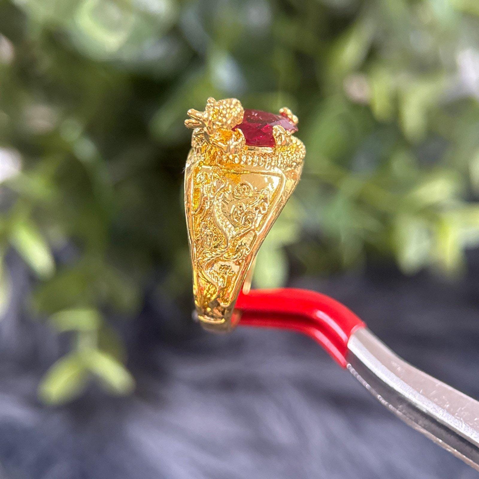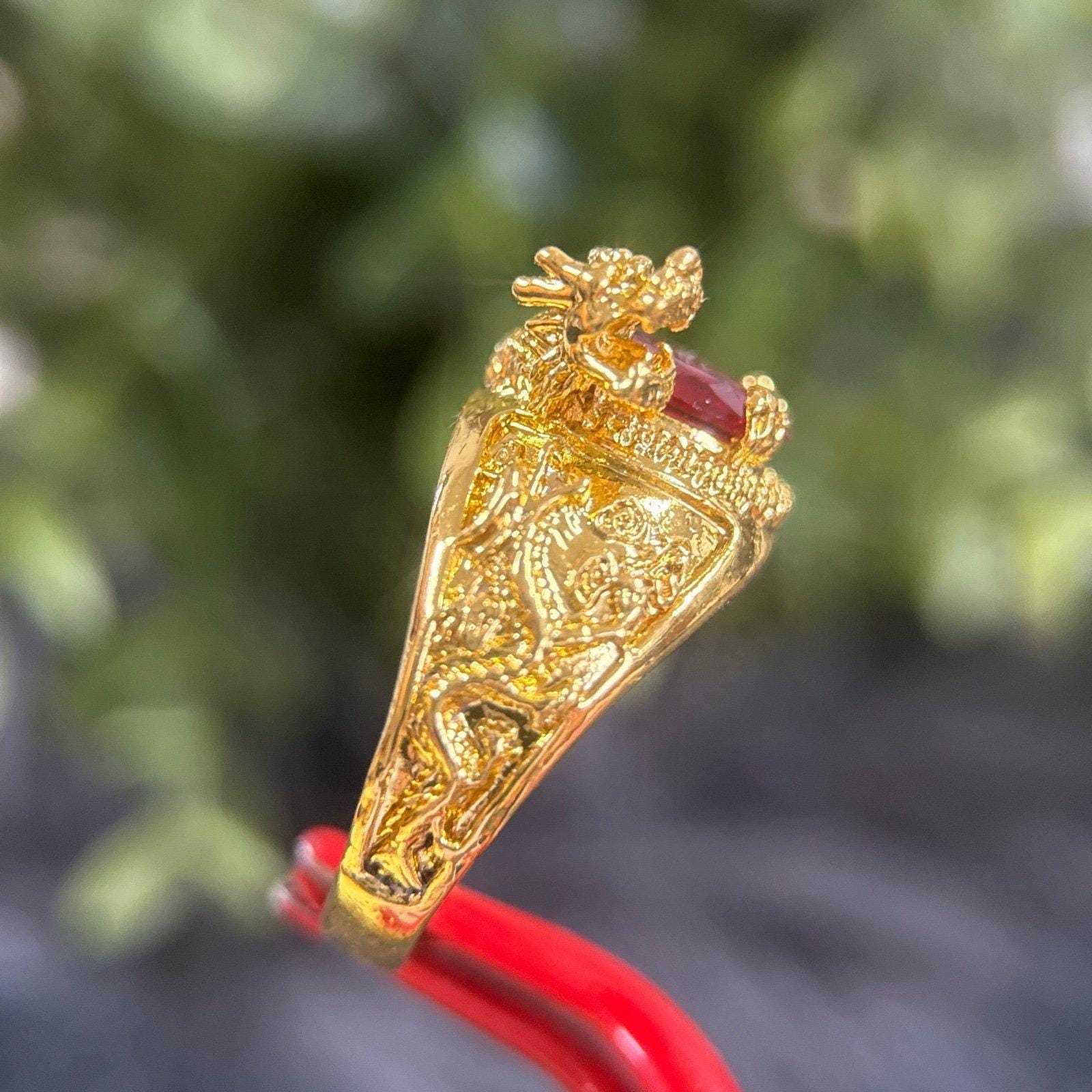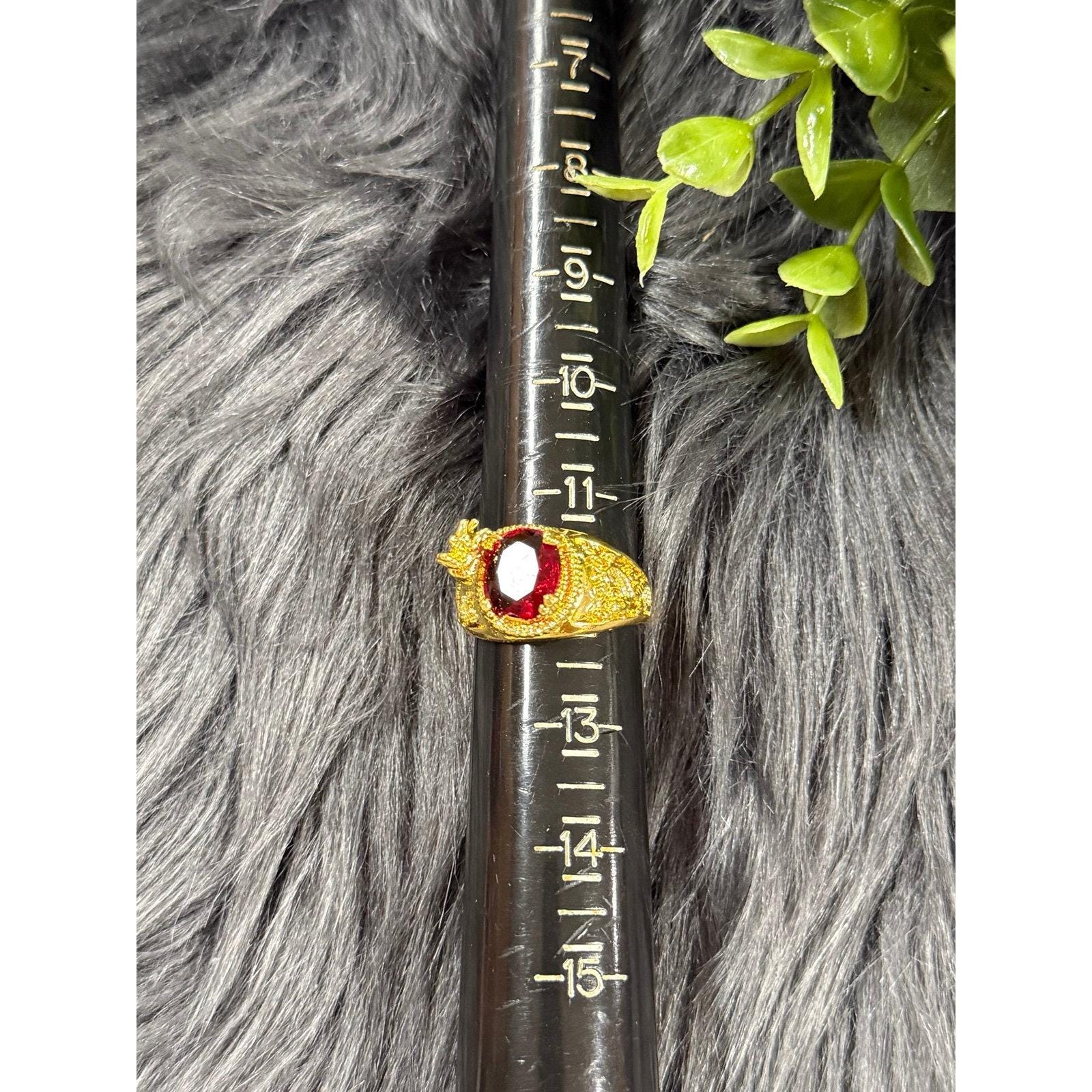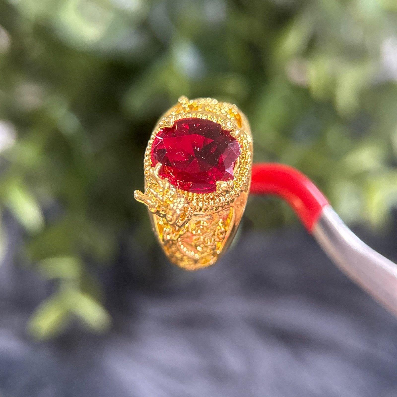 *Oval Shaped garnet colored stone ring with small dragon