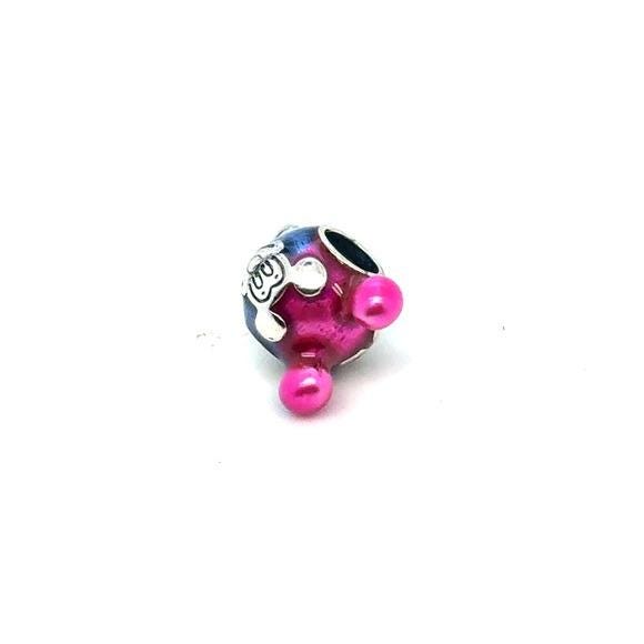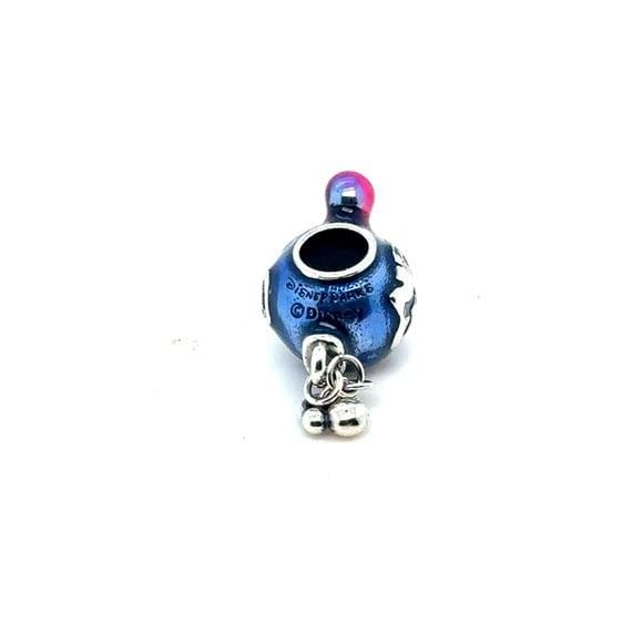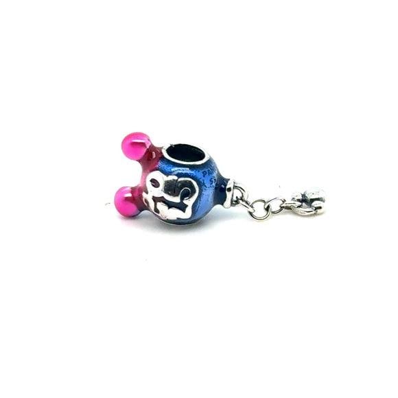 Pandora Disney Balloon Micky charm with vibrant blue enamel and pink accents. Silver detailing and dangling chain. Adds playful color to bracelets or necklaces. Genuine Pandora design.