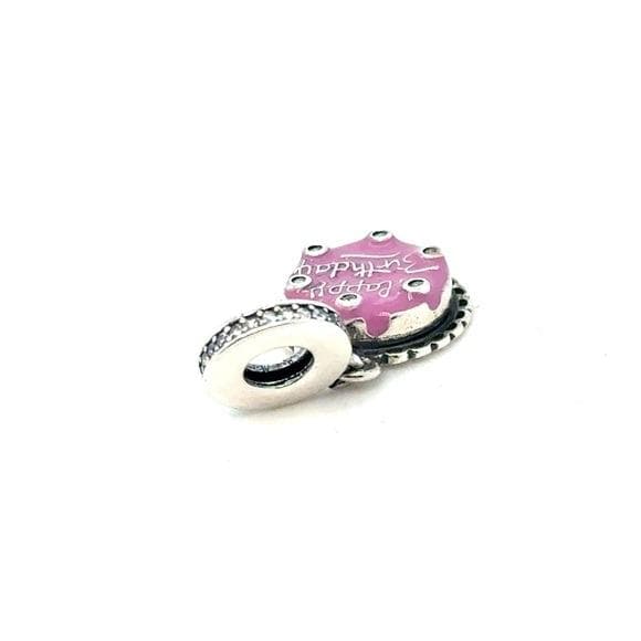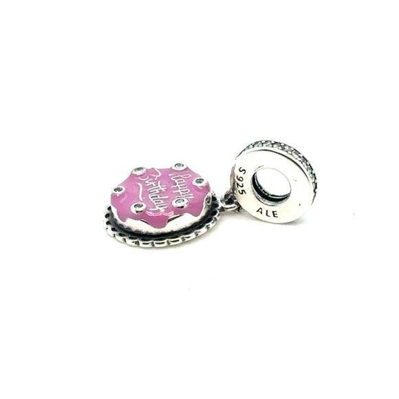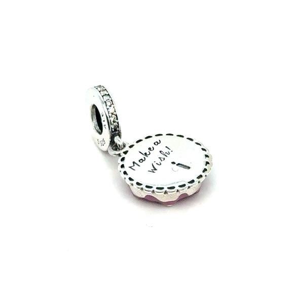 Pandora Delicate pink charm pendant featuring a “Happy Birthday and Make A Wish” script and sparkling accents. Polished silver setting enhances the vibrant pink enamel. Adds a festive, feminine touch to any bracelet or necklace.