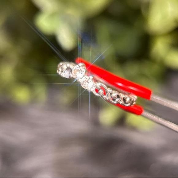 Elegant Pandora ring in sterling silver. Features three clear stones arranged in a heart motif. Delicate filigree detailing along the band. Ideal for stacking or wearing alone.
