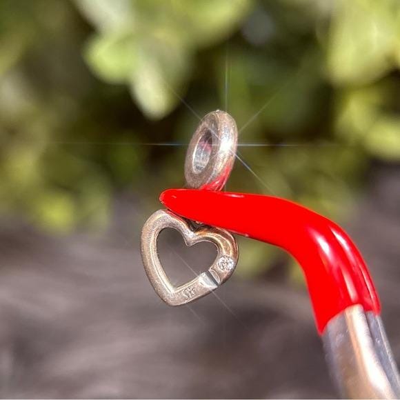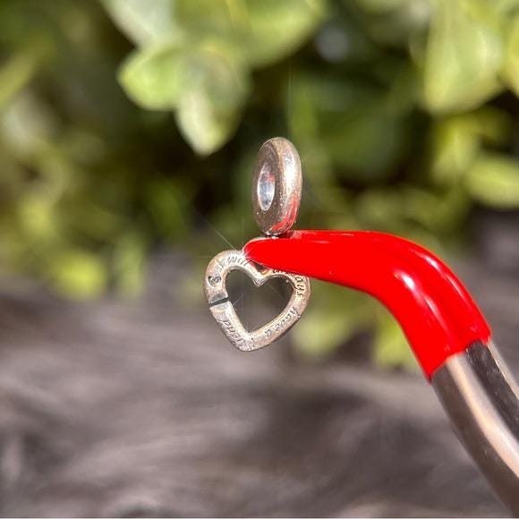 Silver-toned Pandora dangle charm. Open heart design with a single clear stone accent. Bail attachment for bracelets or necklaces. Classic and delicate look.