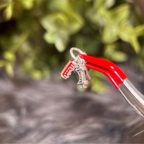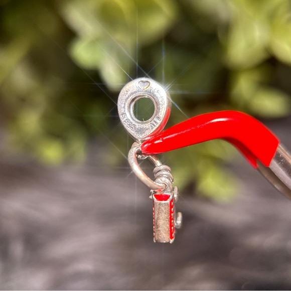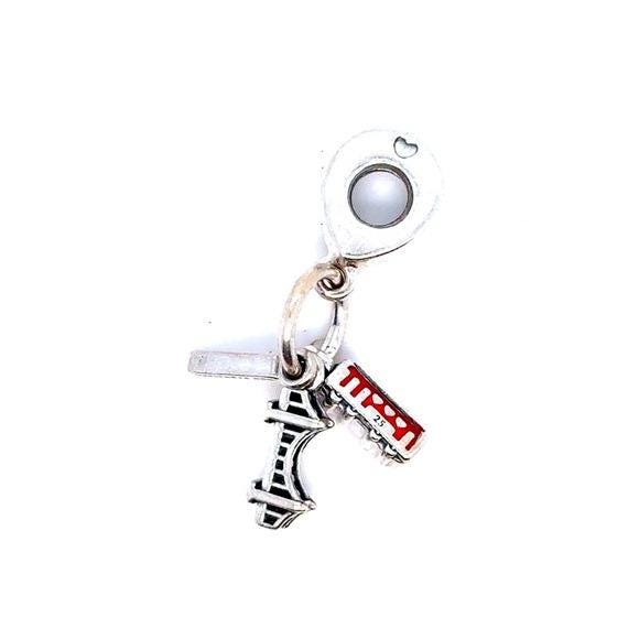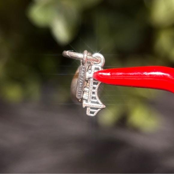Pandora dangle San Francisco charms. Sterling silver construction with red enamel detail. Small bail for bracelet or necklace attachment. Iconic travel-themed design.