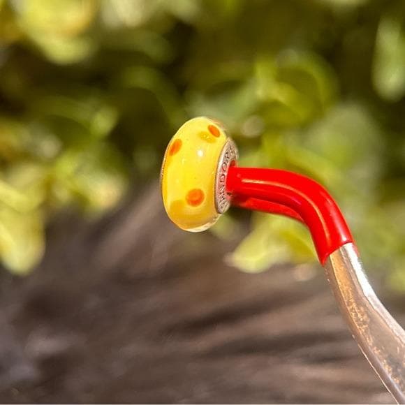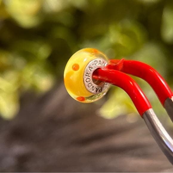 Yellow glass charm bead with scattered orange polka dots. Features a silver core stamped PANDORA. Simple and cheerful bracelet accent.