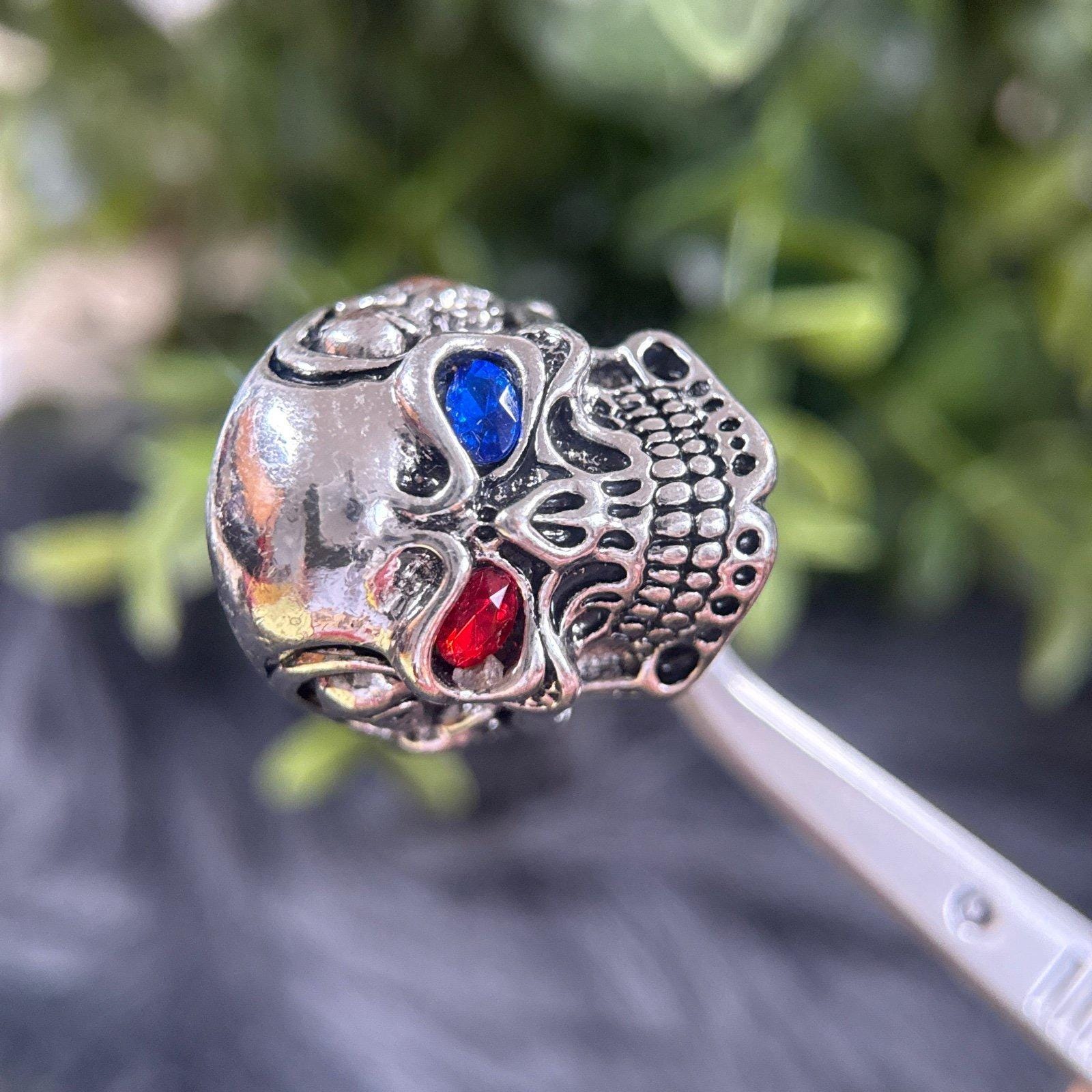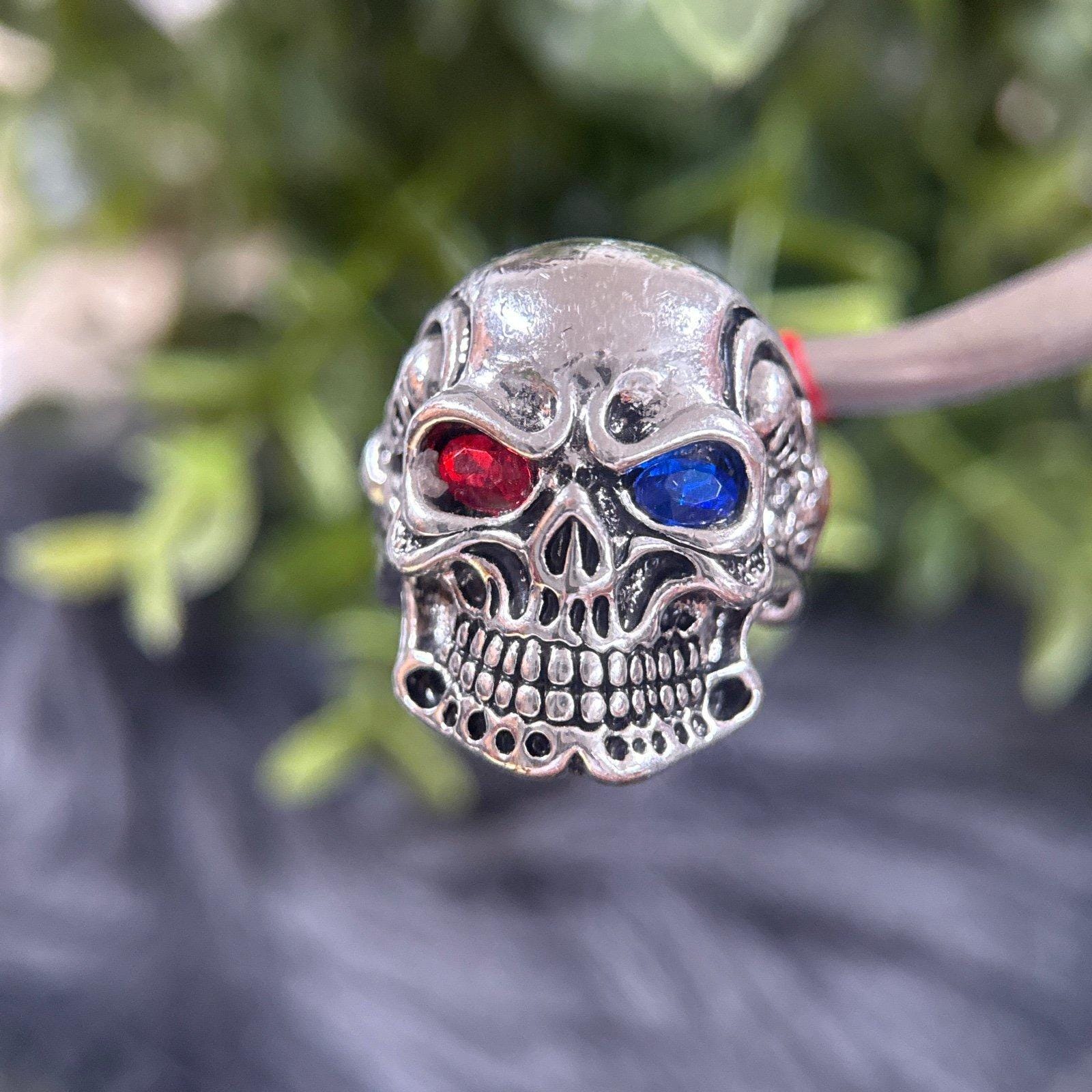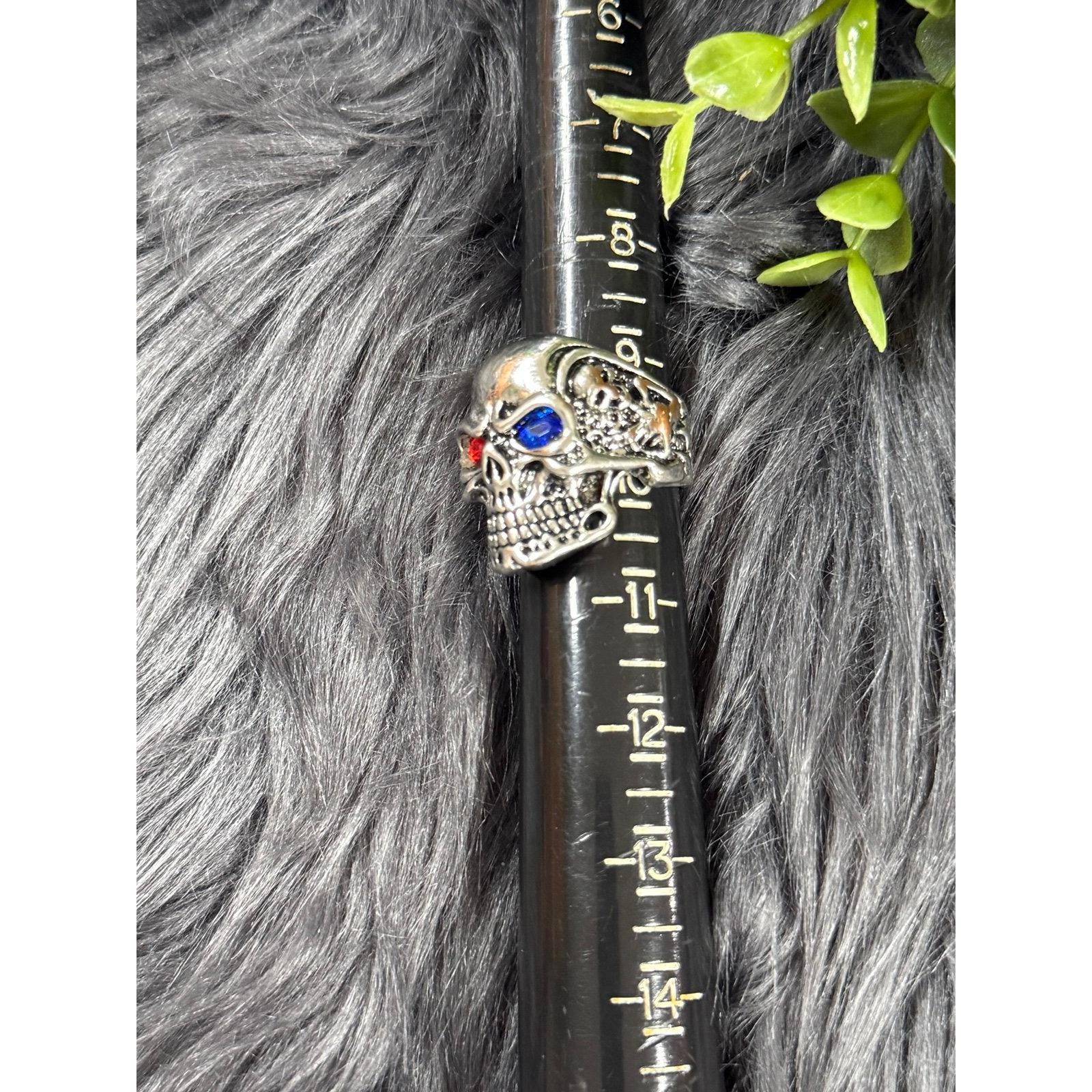 *Silver tone ring *Not real silver *Red and Blue Eye Skull ring *Size 9.5 *Excellent condition