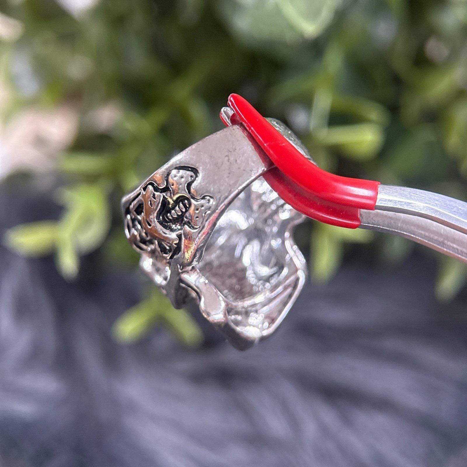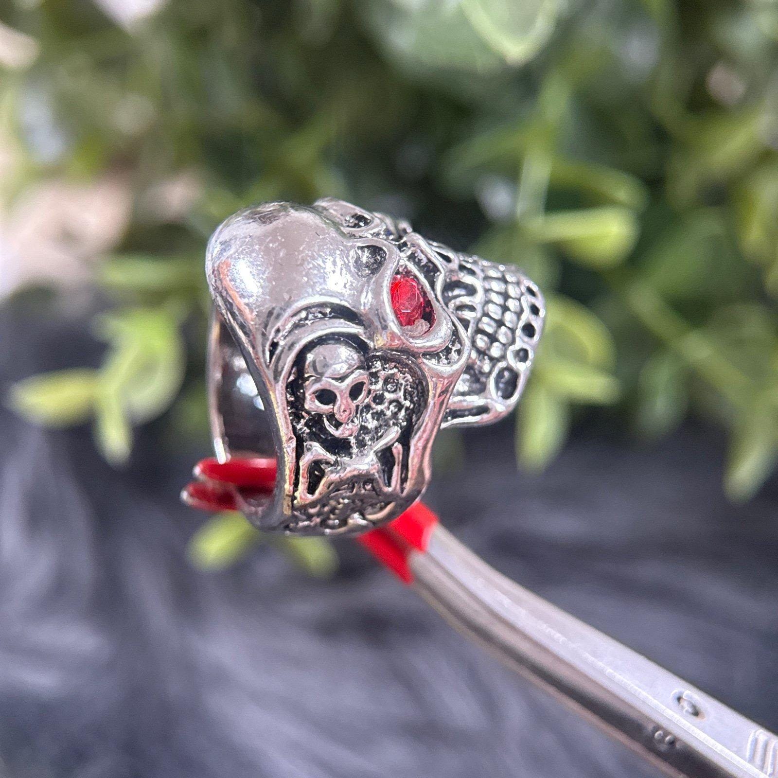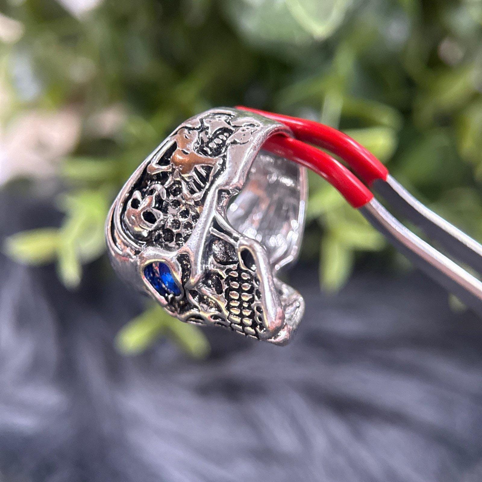 *Silver tone ring *Not real silver *Red and Blue Eye Skull ring *Size 9.5 *Excellent condition