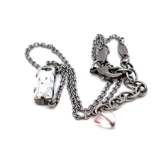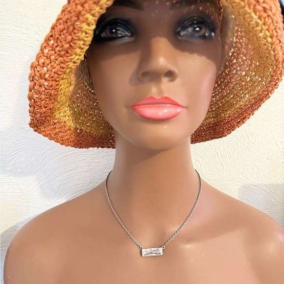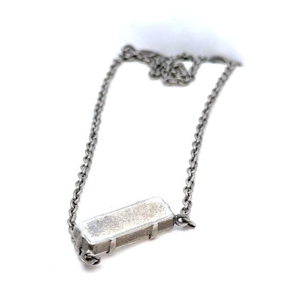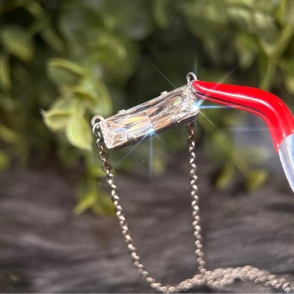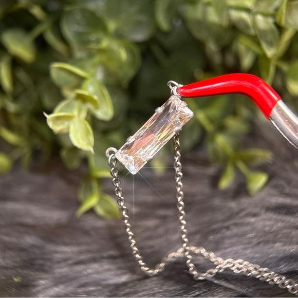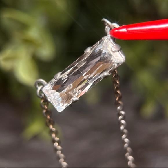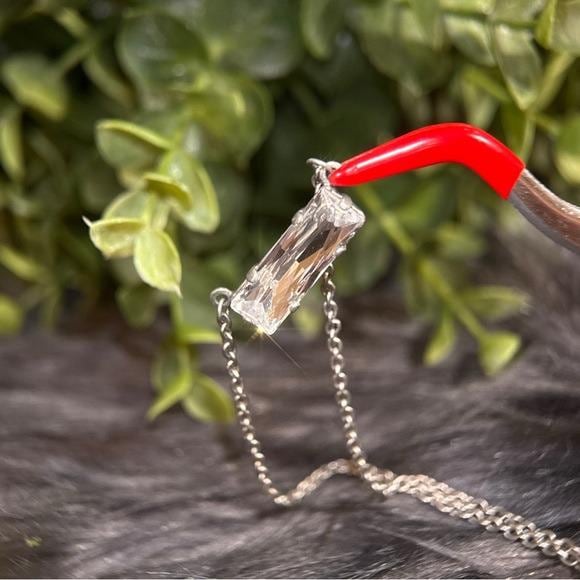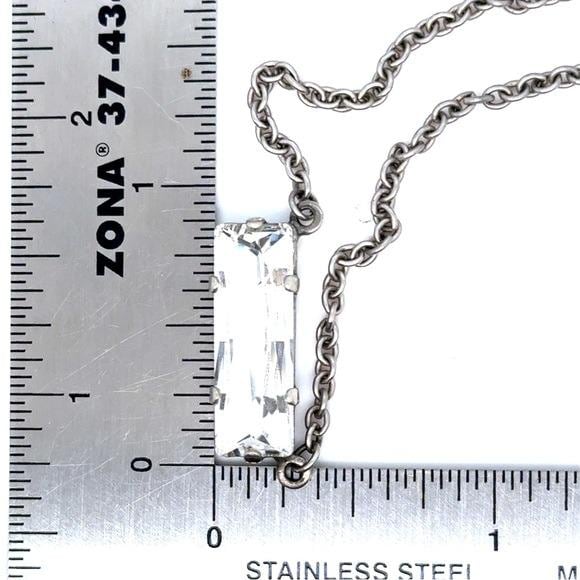 Minimal rectangular clear crystal pendant on a silver-tone chain. Sleek and modern silhouette. Adds subtle sparkle to daily or dressy looks.