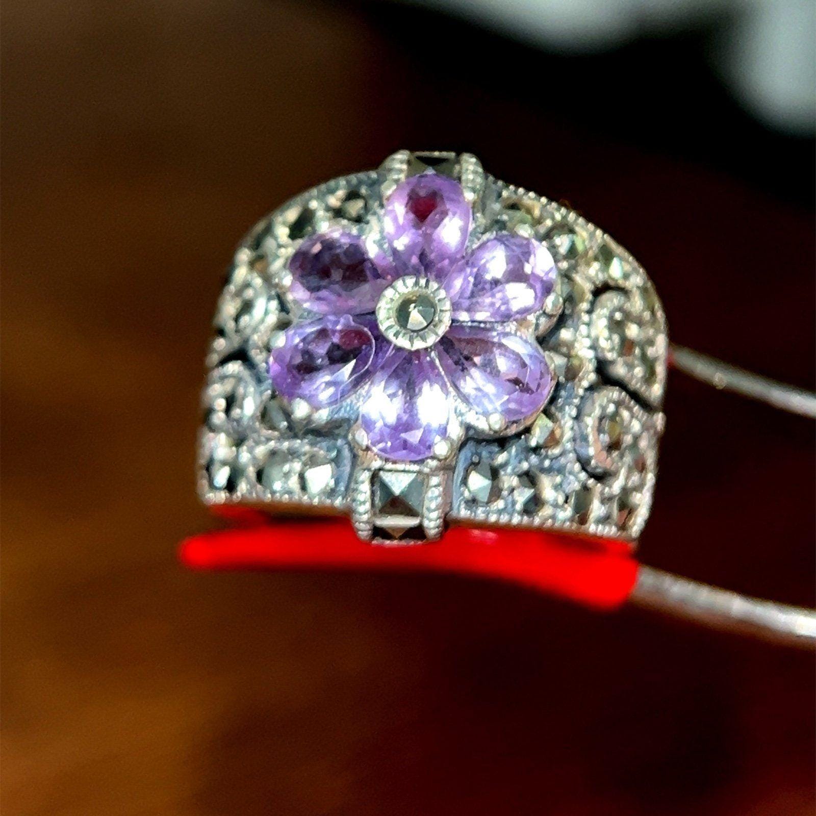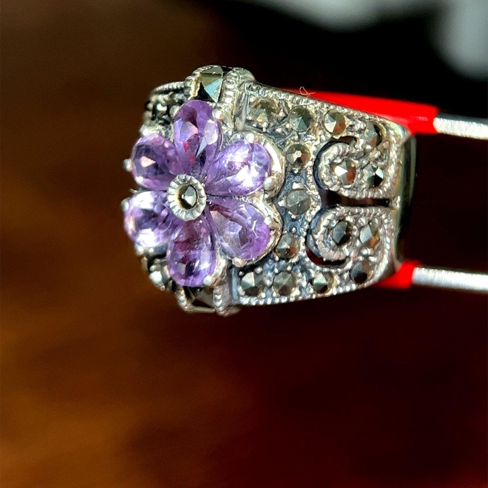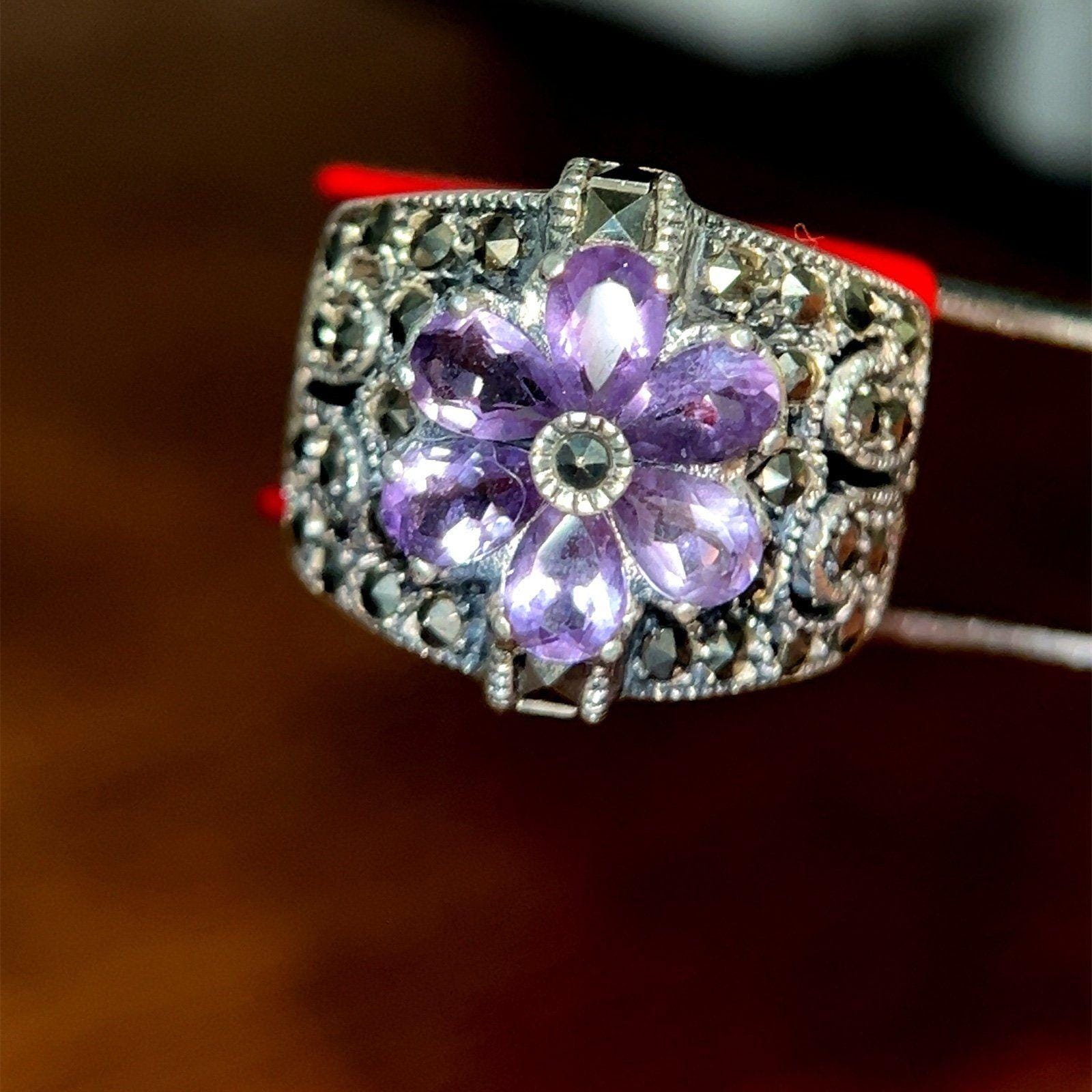 Real Sterling Silver 925 Amethysts & Marcasites Flower Ring.
