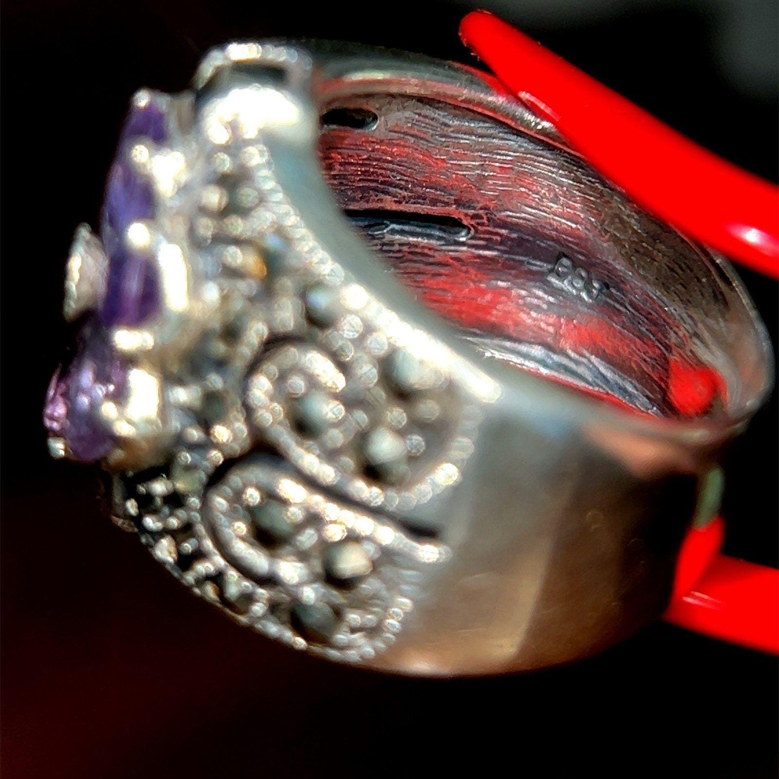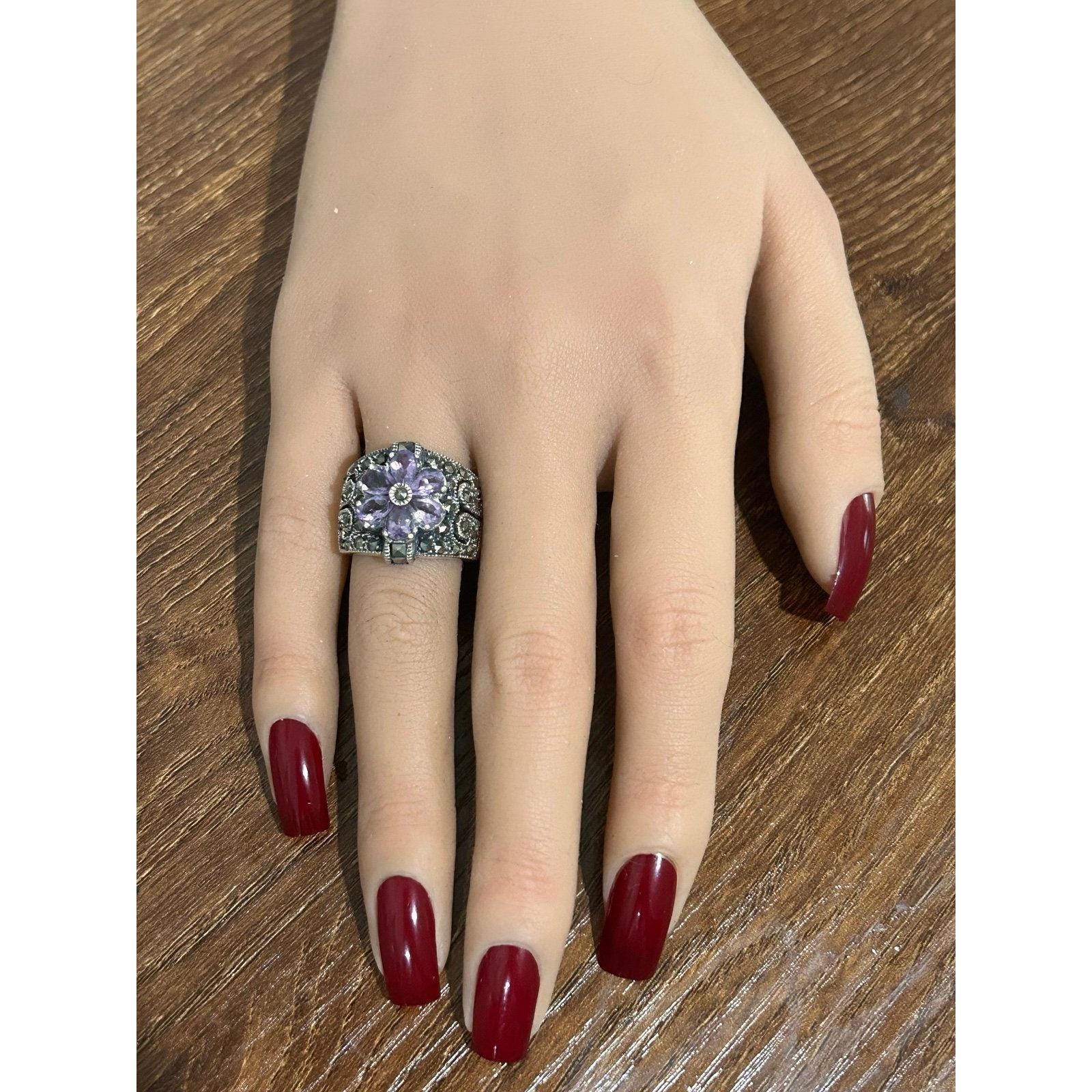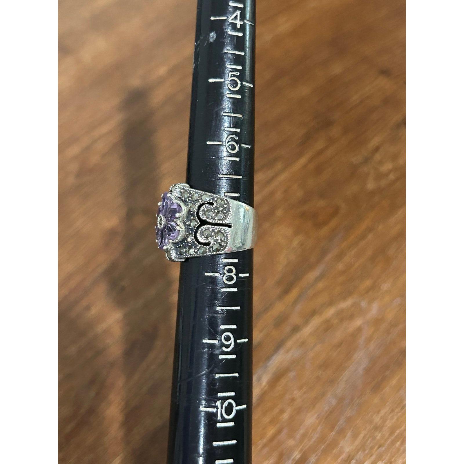 Real Sterling Silver 925 Amethysts & Marcasites Flower Ring.
