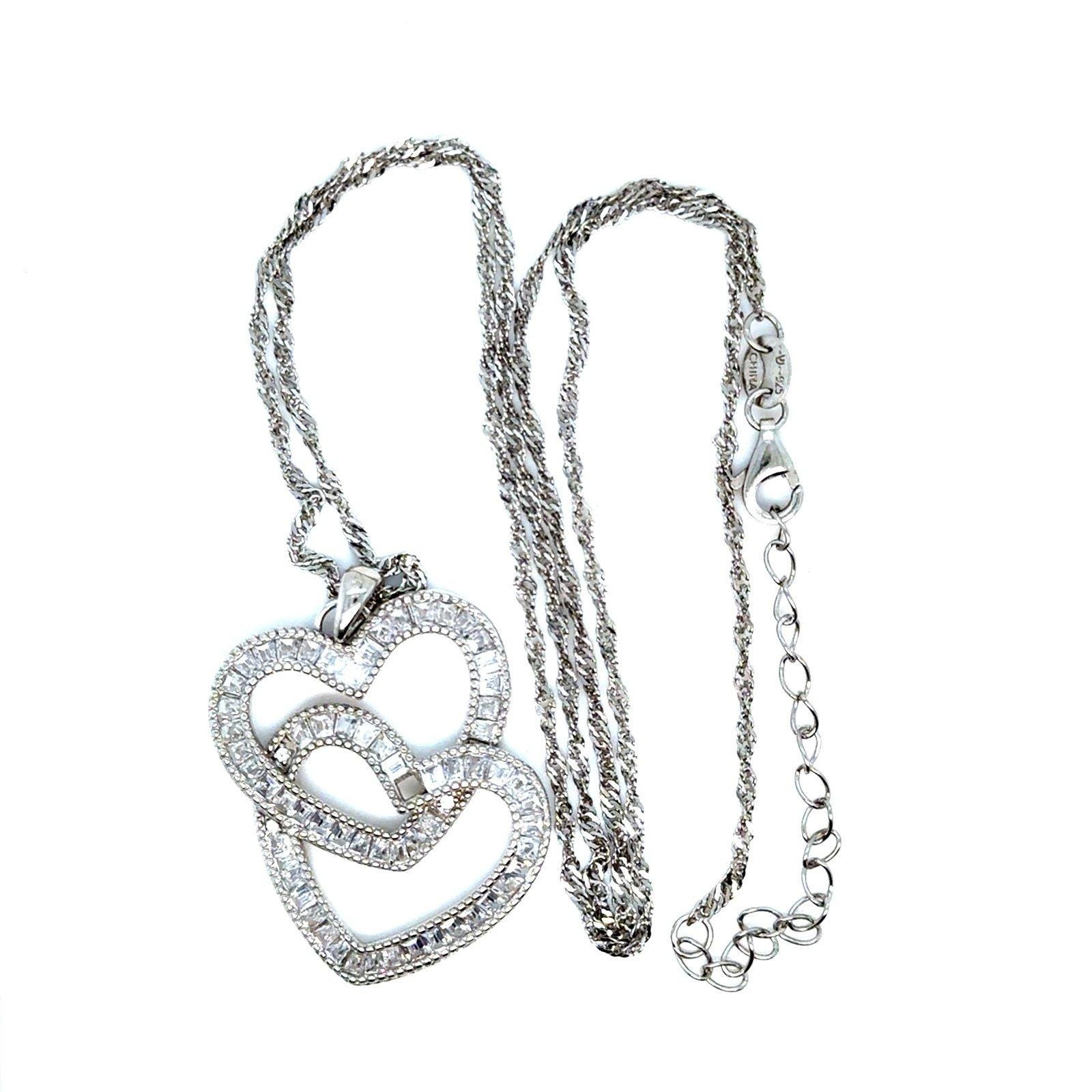 Silver 925 Double Heart Baguette Cz Necklace