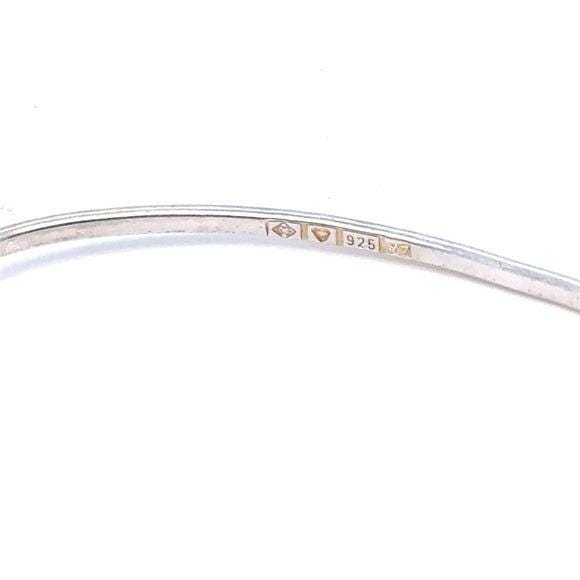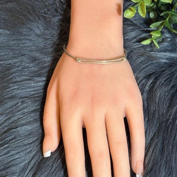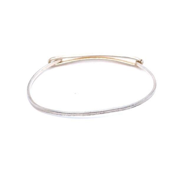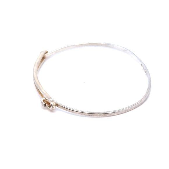 Delicate bangle bracelet with a safety-pin inspired design. Sleek sterling silver 925 finish. Lightweight and modern. Easy to wear with any outfit.