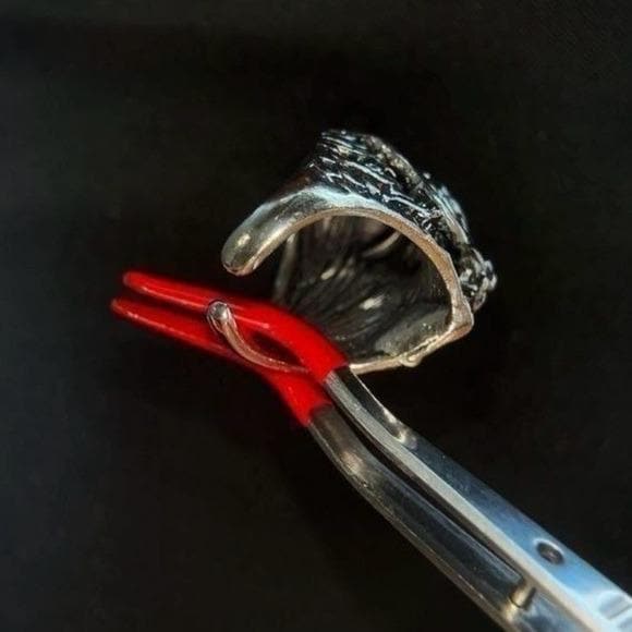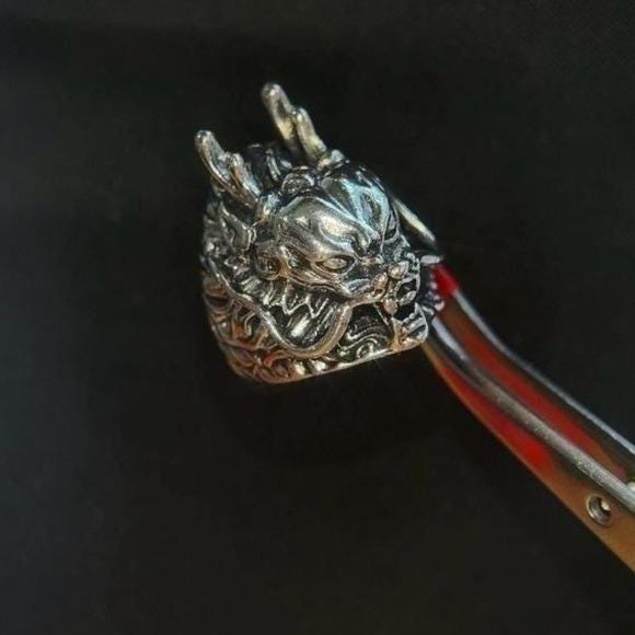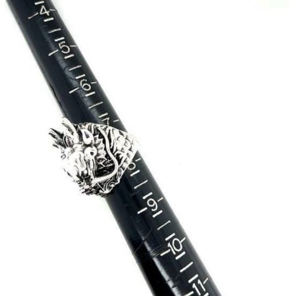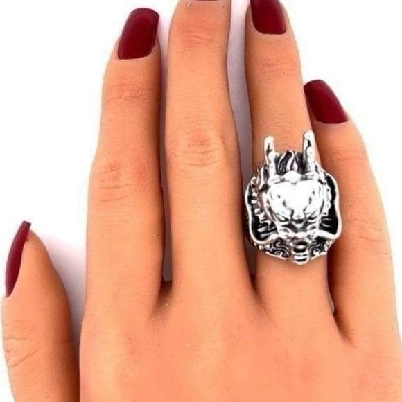 Bold dragon head ring in silver tone. Durable metal construction for everyday wear. Eye-catching sculpted details highlight the dragon design. Comfortable fit and strong presence for a statement look. Perfect for men seeking edgy, gothic-inspired accessories.