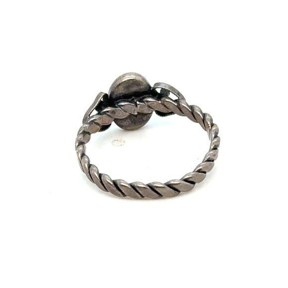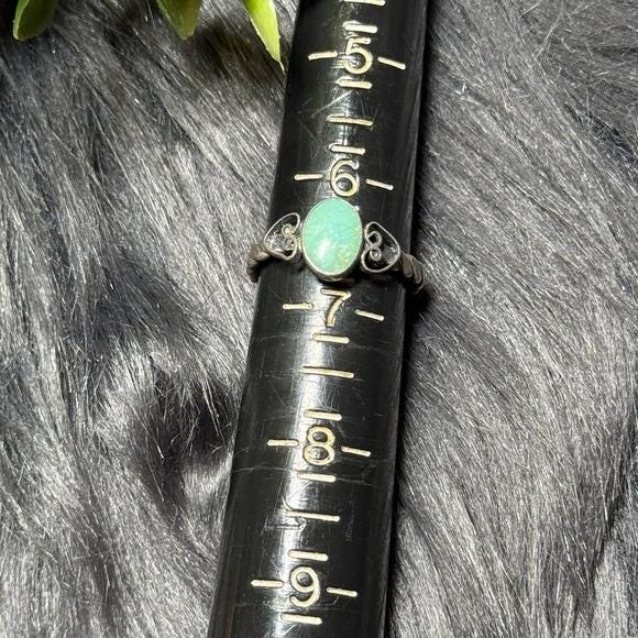 Silver ring featuring an oval turquoise-colored stone and delicate heart accents. The twisted band adds subtle texture and visual interest. Perfect for everyday wear or as a thoughtful gift.