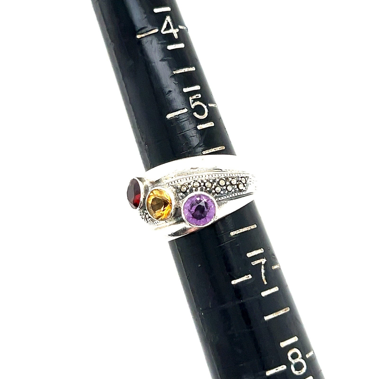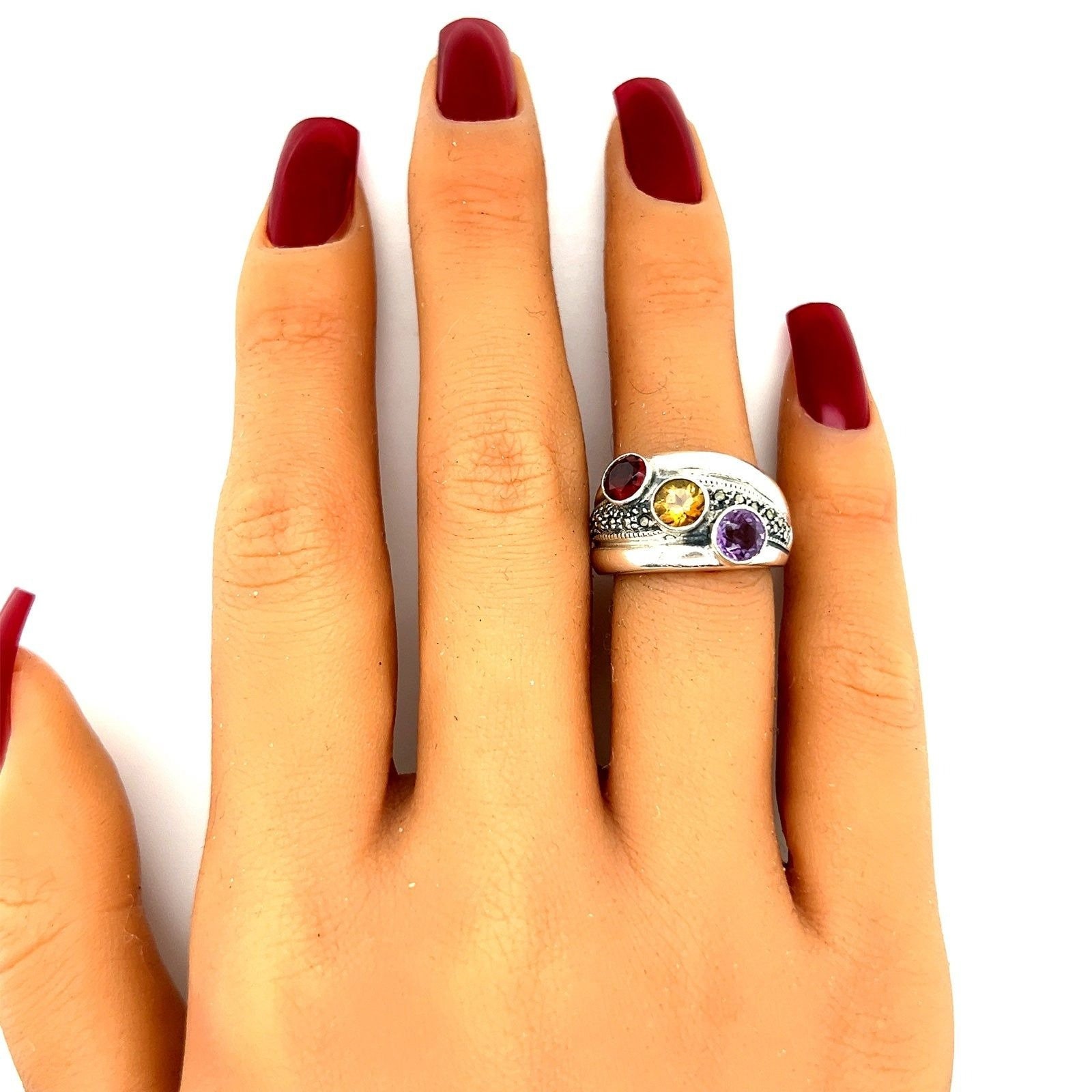 Sterling Silver 3-Gemstones / Marcasites Ring.