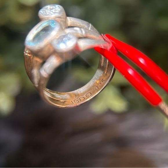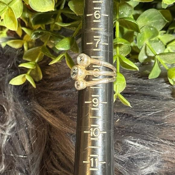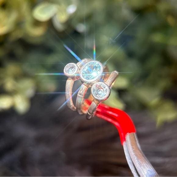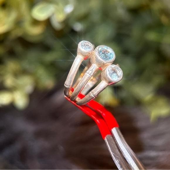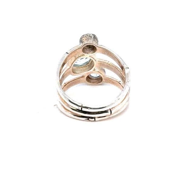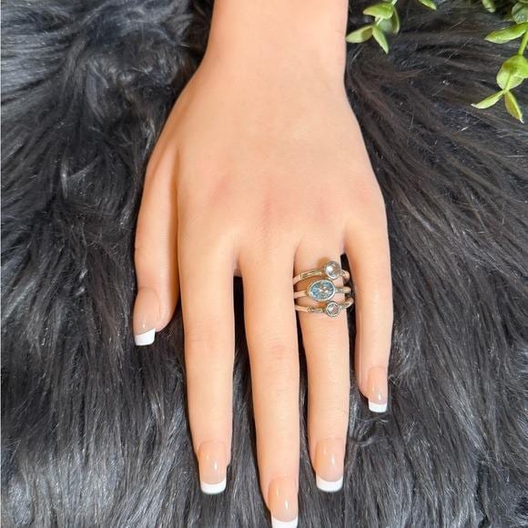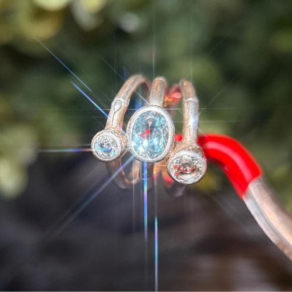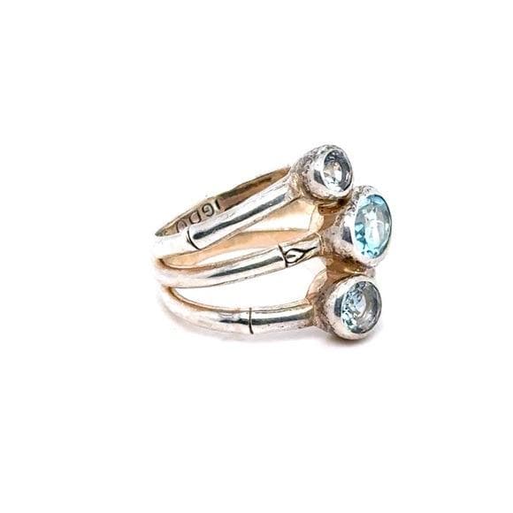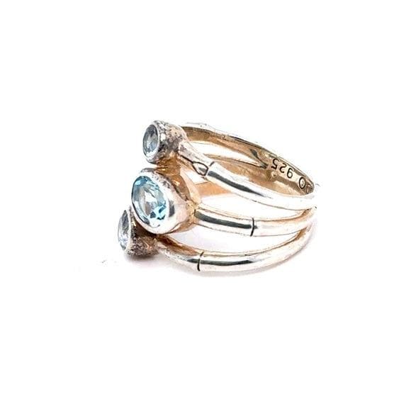 Elegant sterling silver ring featuring three bezel-set blue topaz stones. The light blue stones add a fresh, sophisticated touch. Perfect for everyday wear or special occasions.