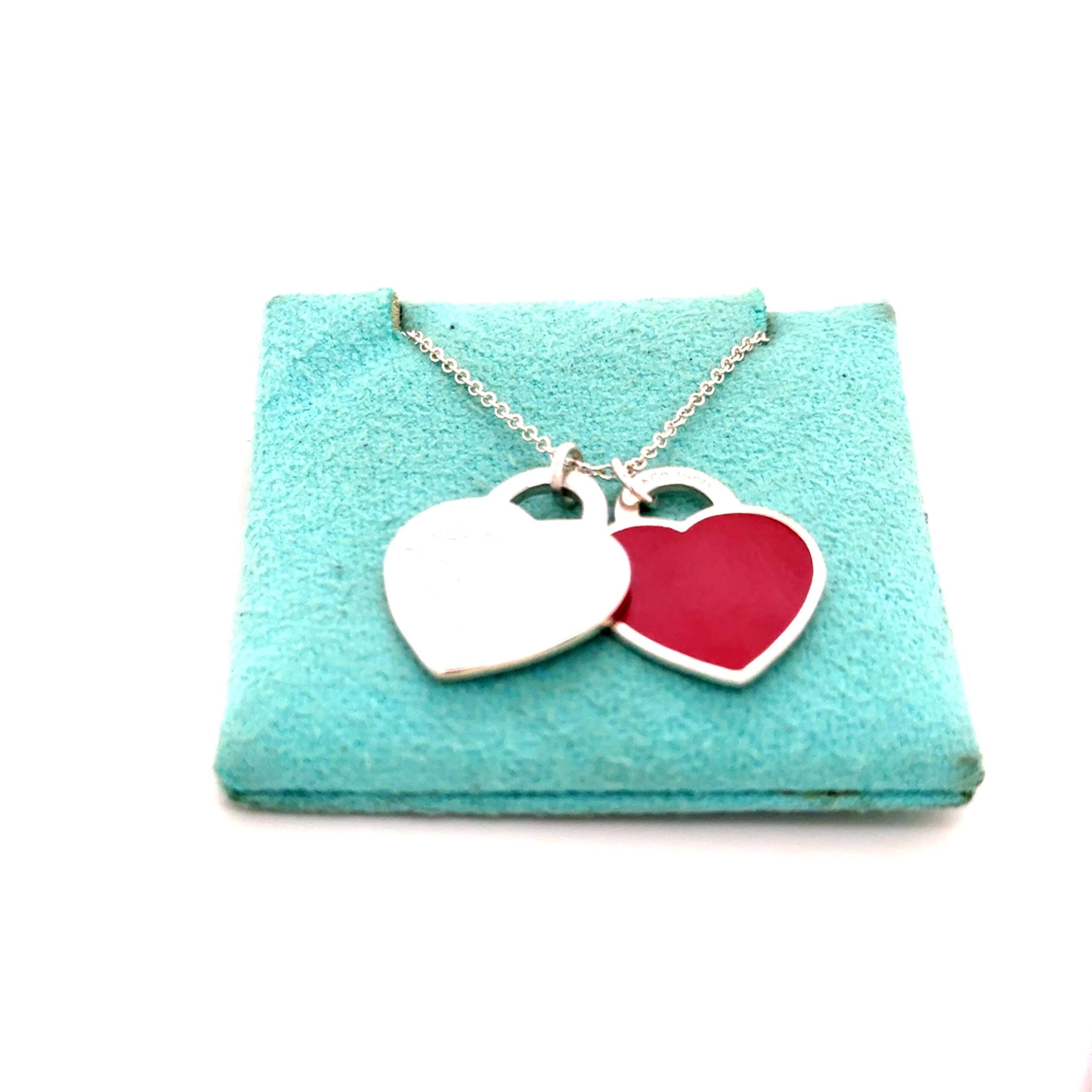 Authentic Tiffany and Co. Red Enamel and Silver Double Heart Tag Necklace.