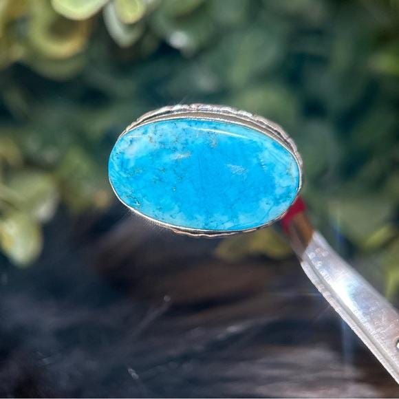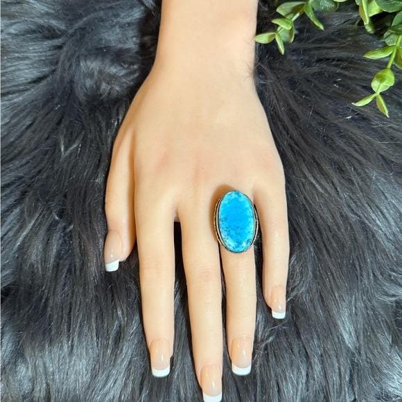Elegant oval turquoise ring with a vibrant blue stone set in a silver-tone band. Adds a bright, natural pop of color to everyday and dress looks. Comfortable wear with a timeless stone setting.